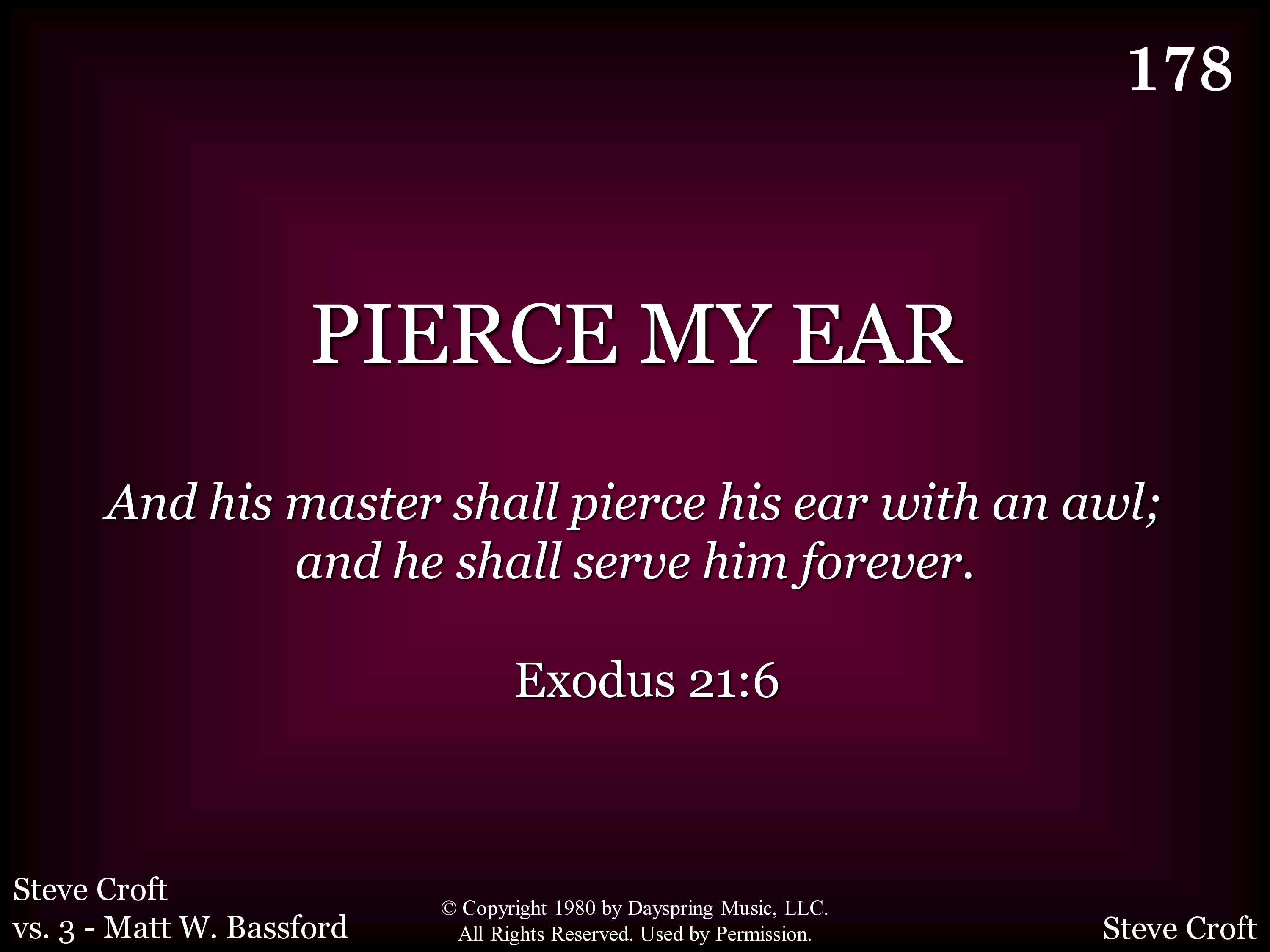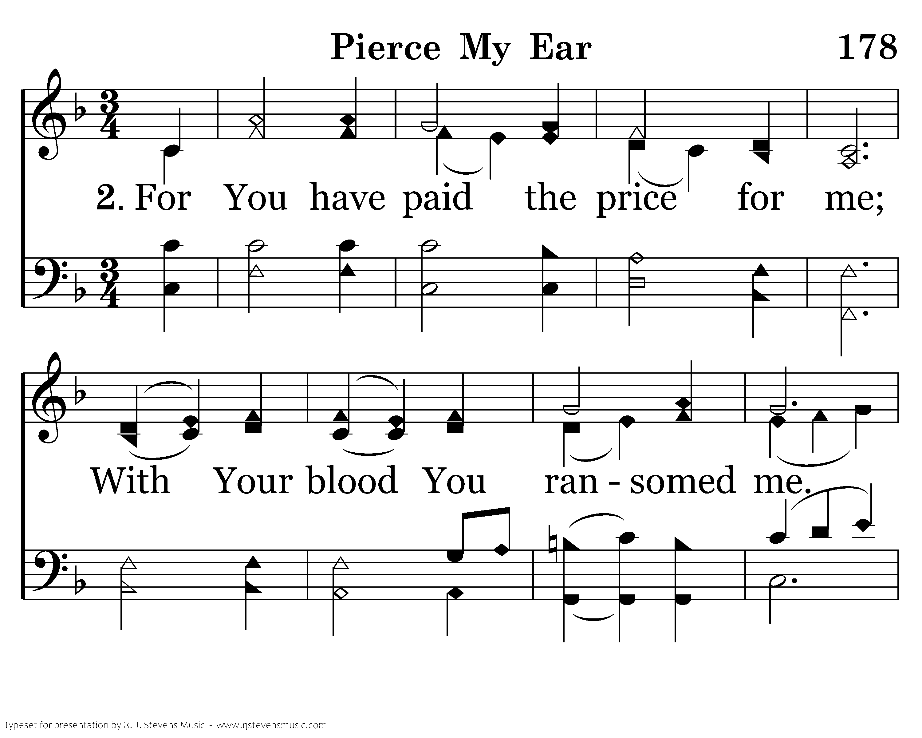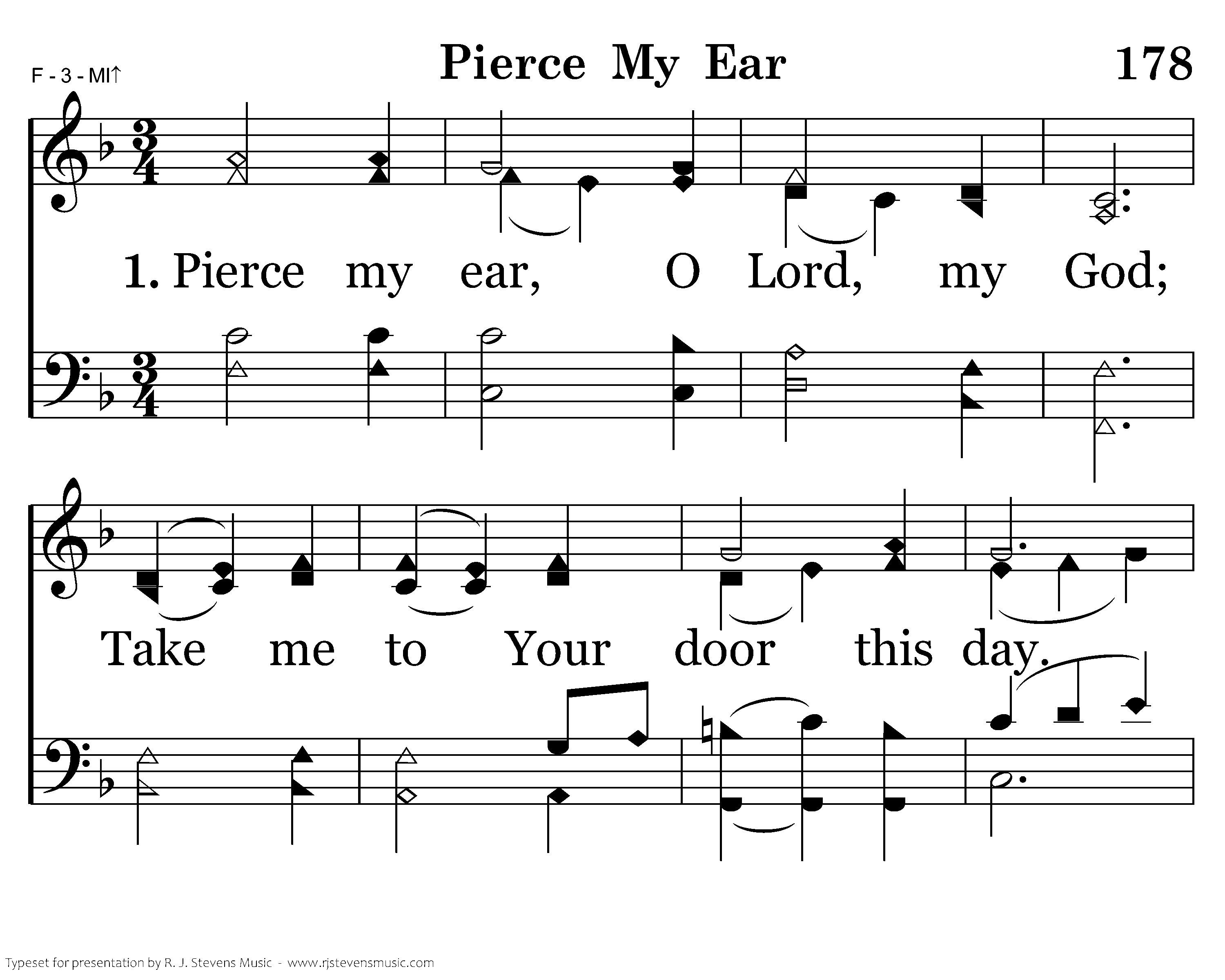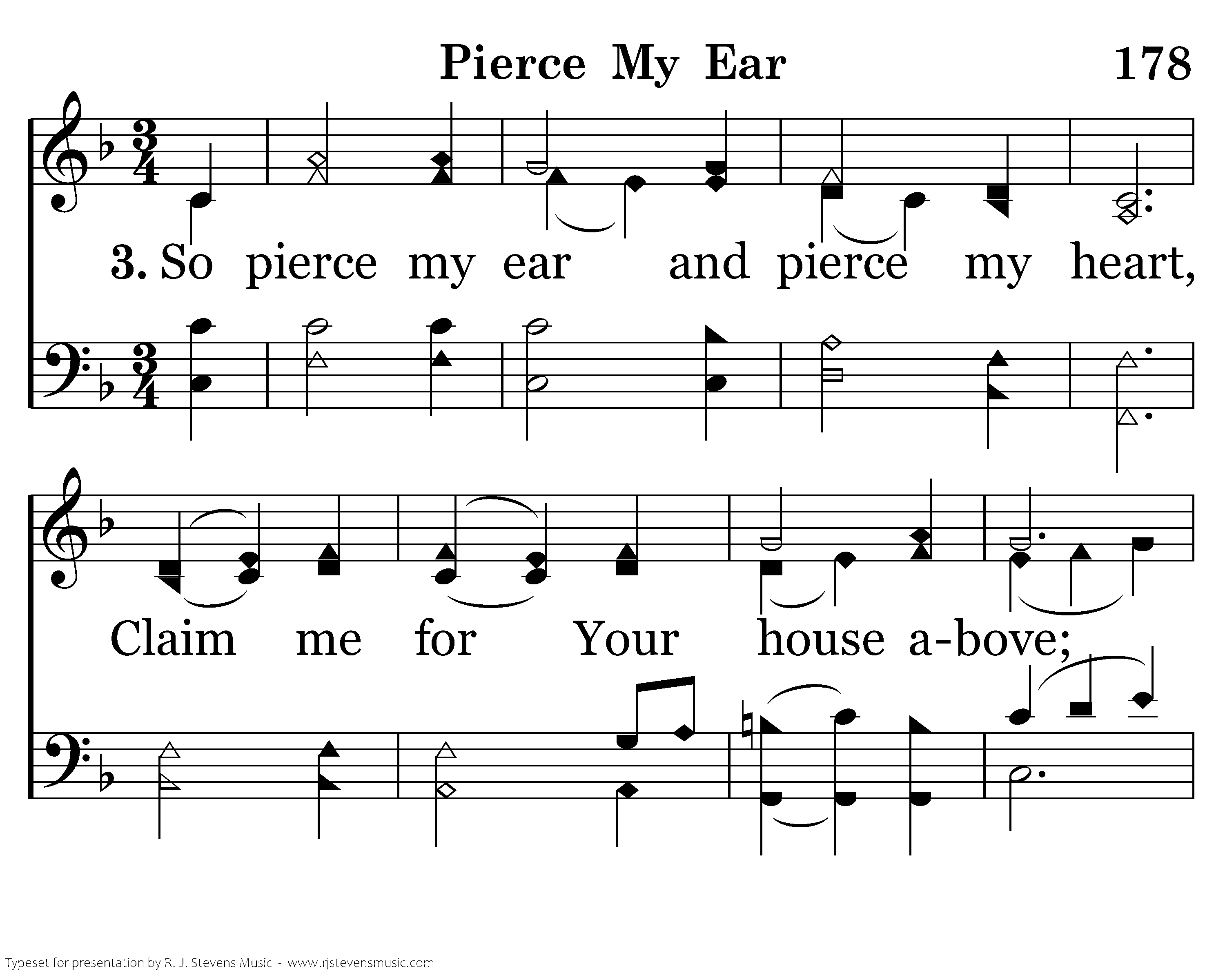 Pierce my ear and pierce my heart, Claim me for Your house above; Yours, and never to depart, Forever bound by love.