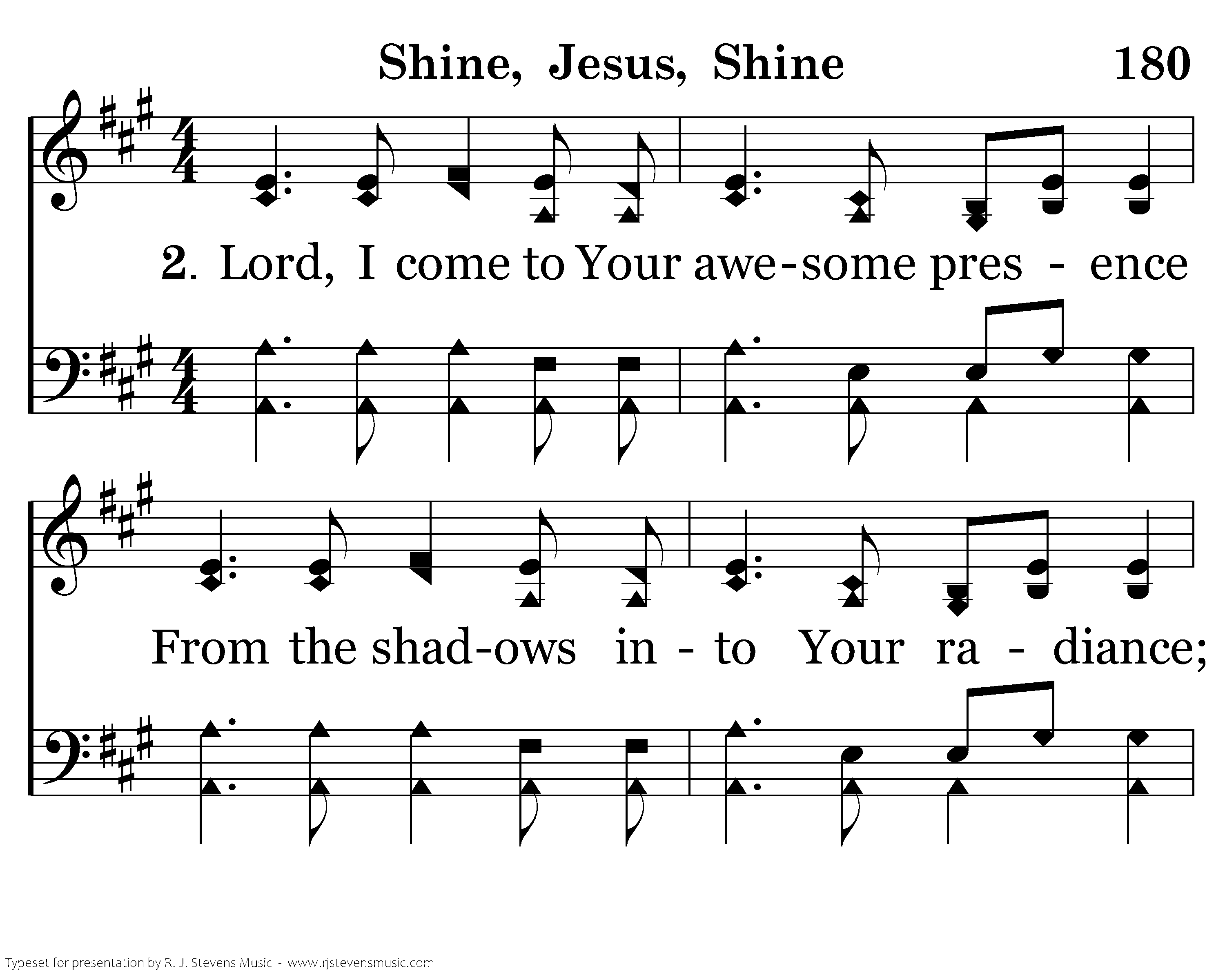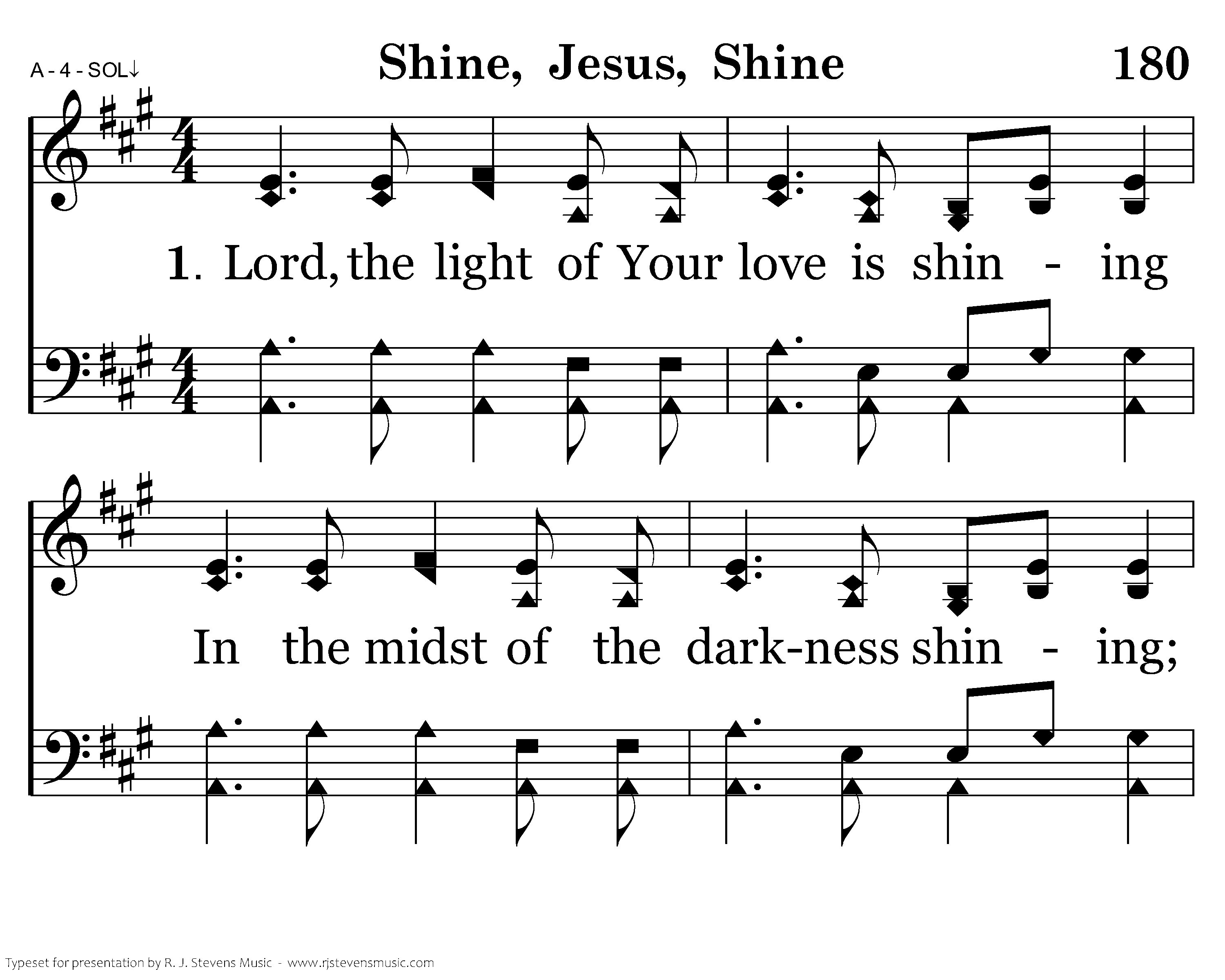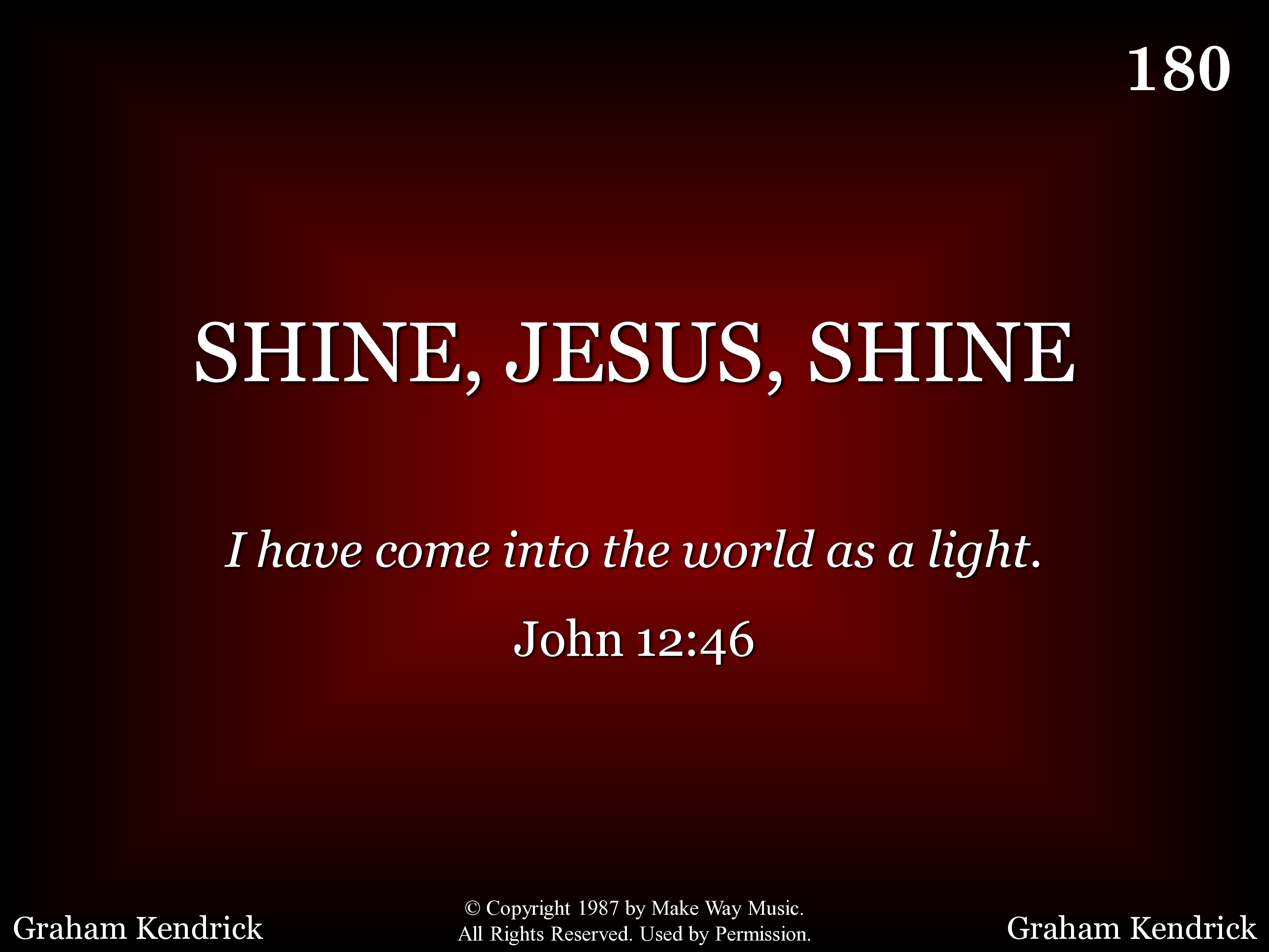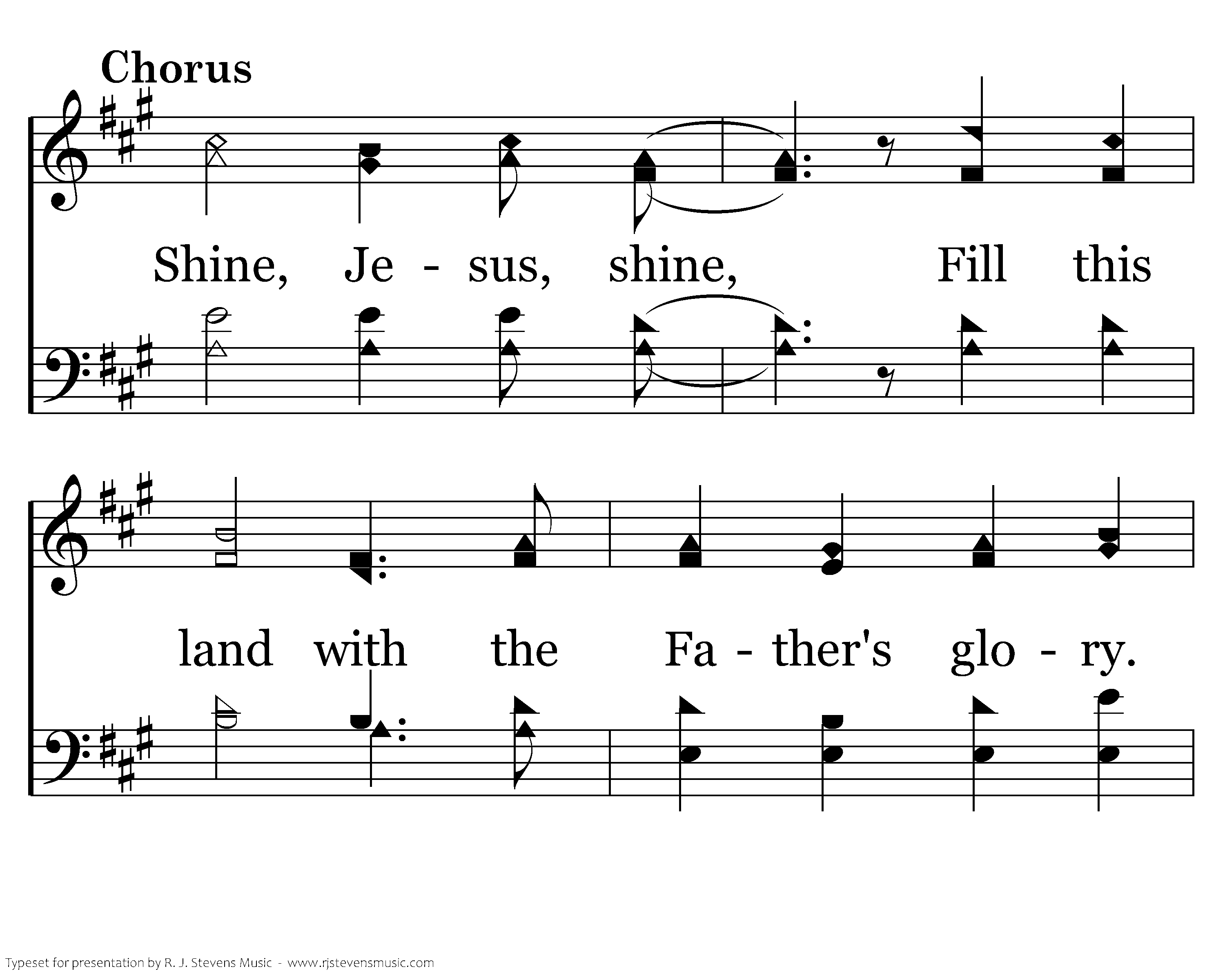 Shine, Jesus, shine, Fill this land with the Father's glory. Blaze, Spirit, blaze, Set our hearts on fire; Flow, river, flow, Flood the nations with grace and mercy, Send forth Your Word, Lord, and let there be light.