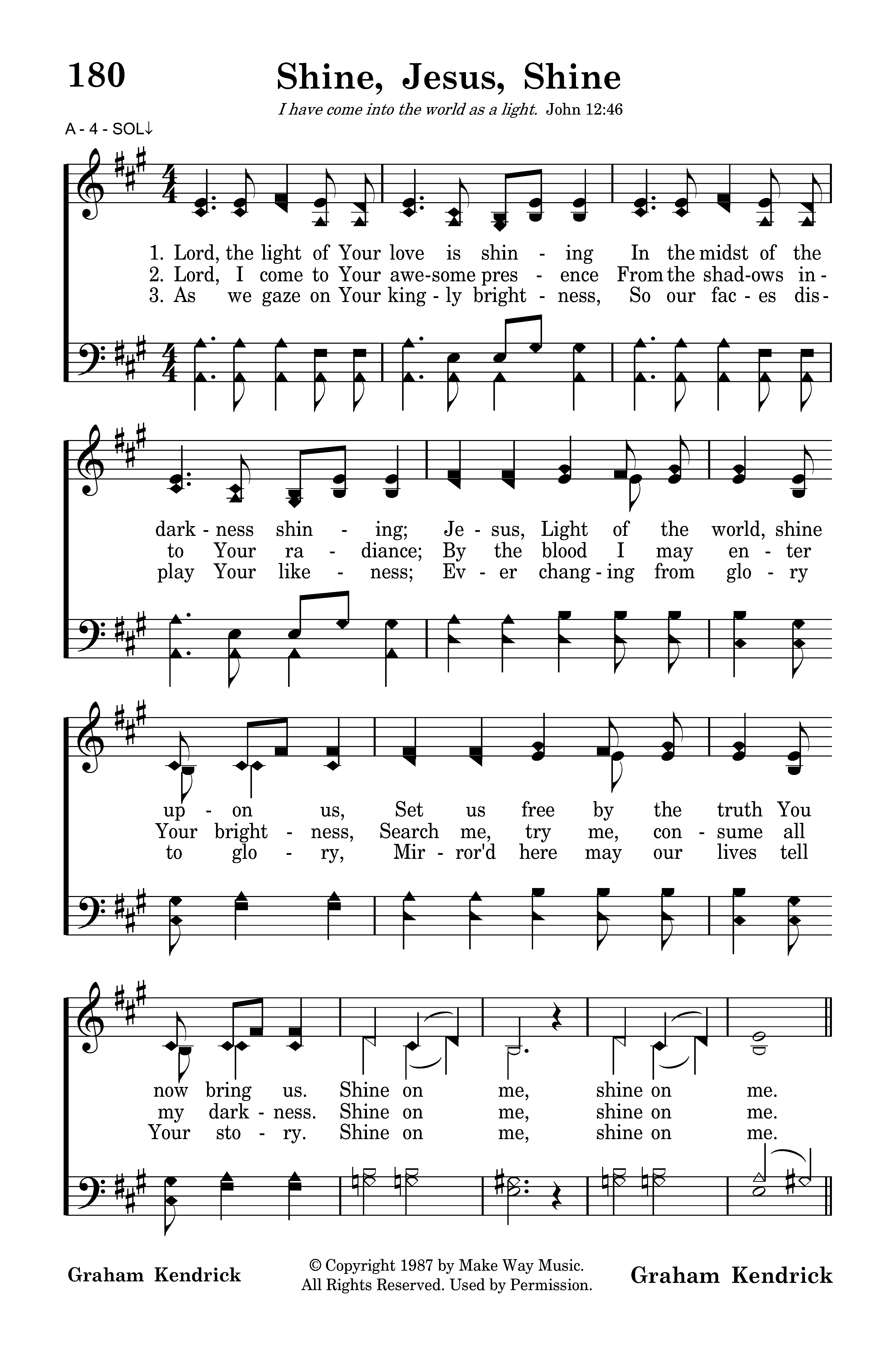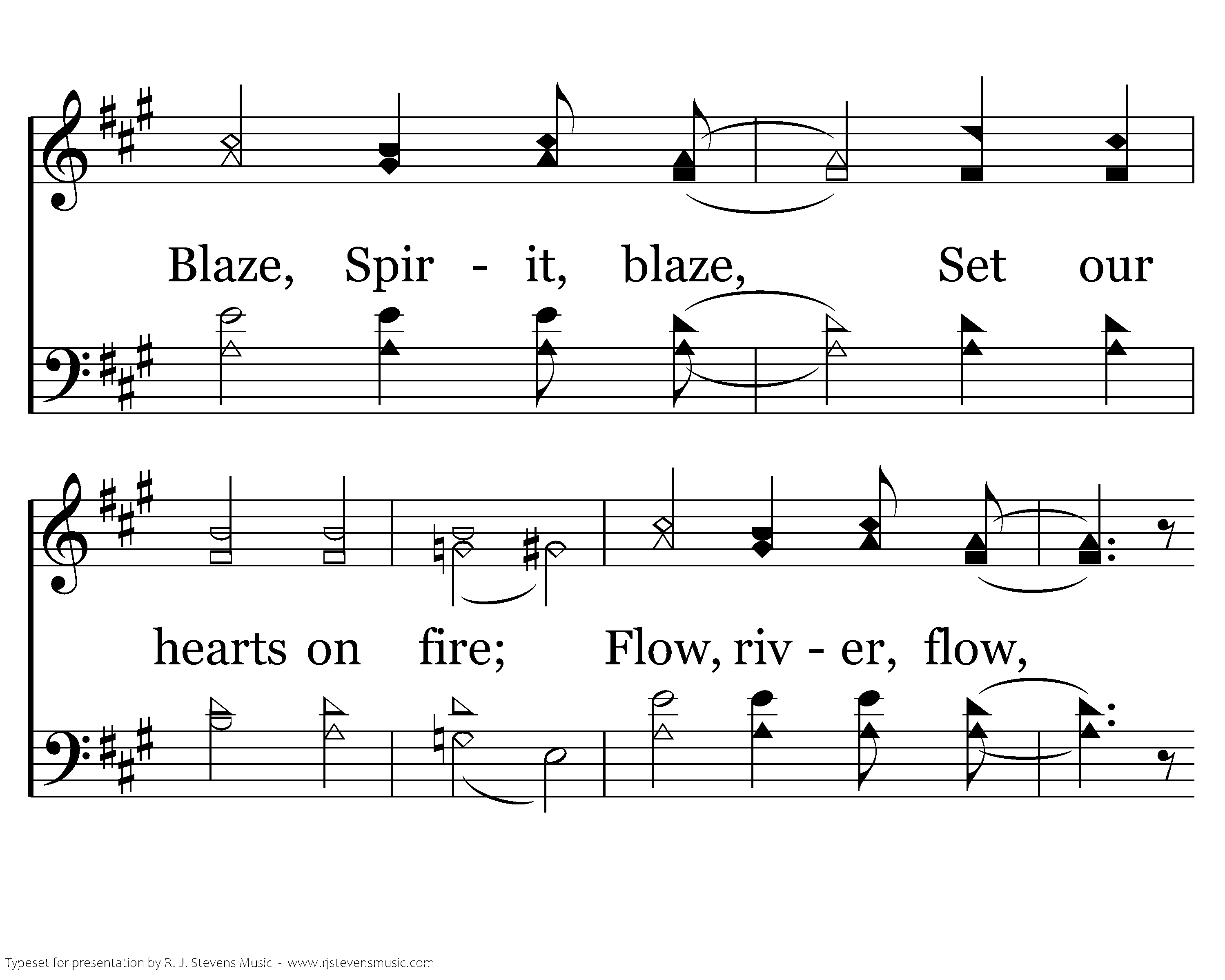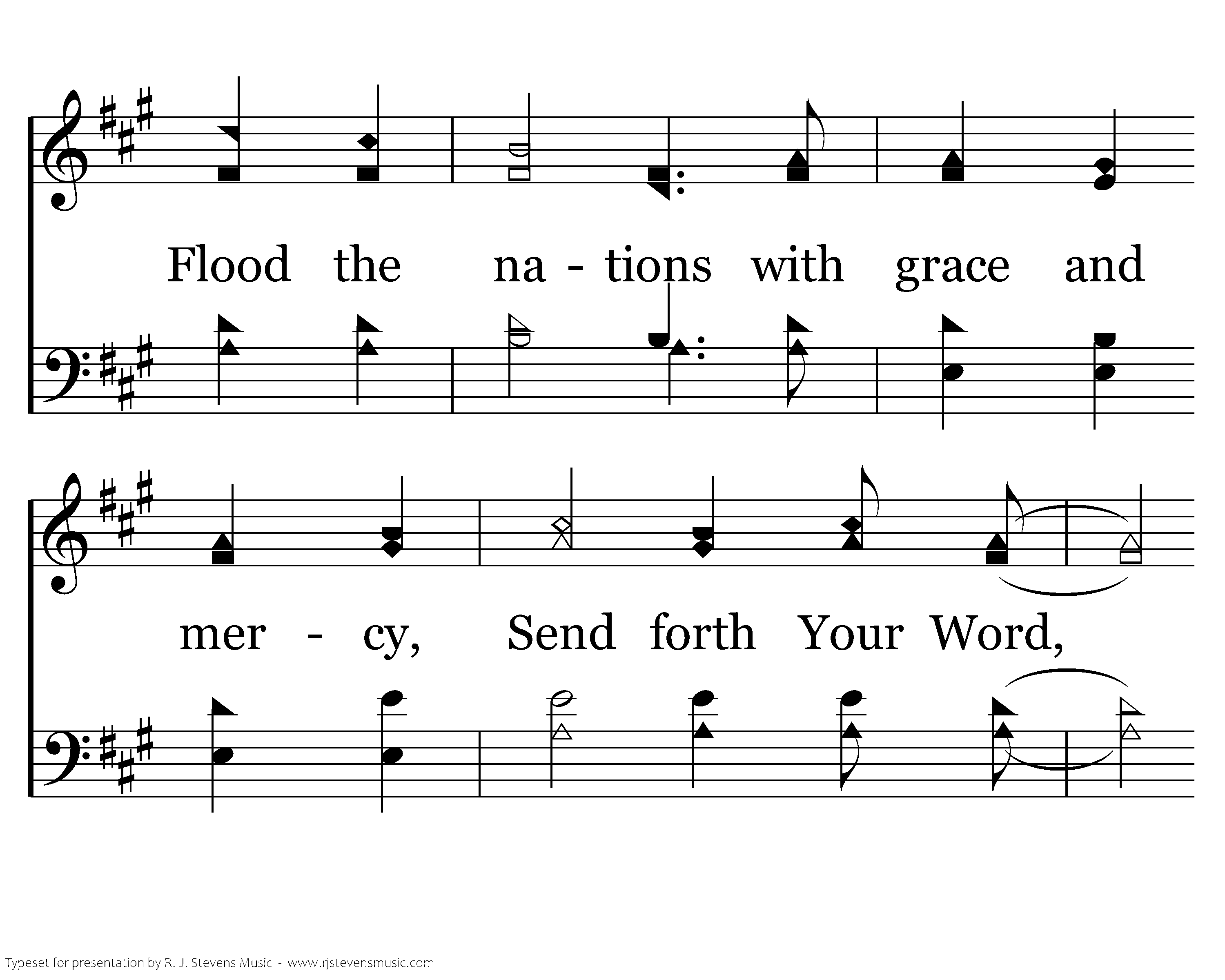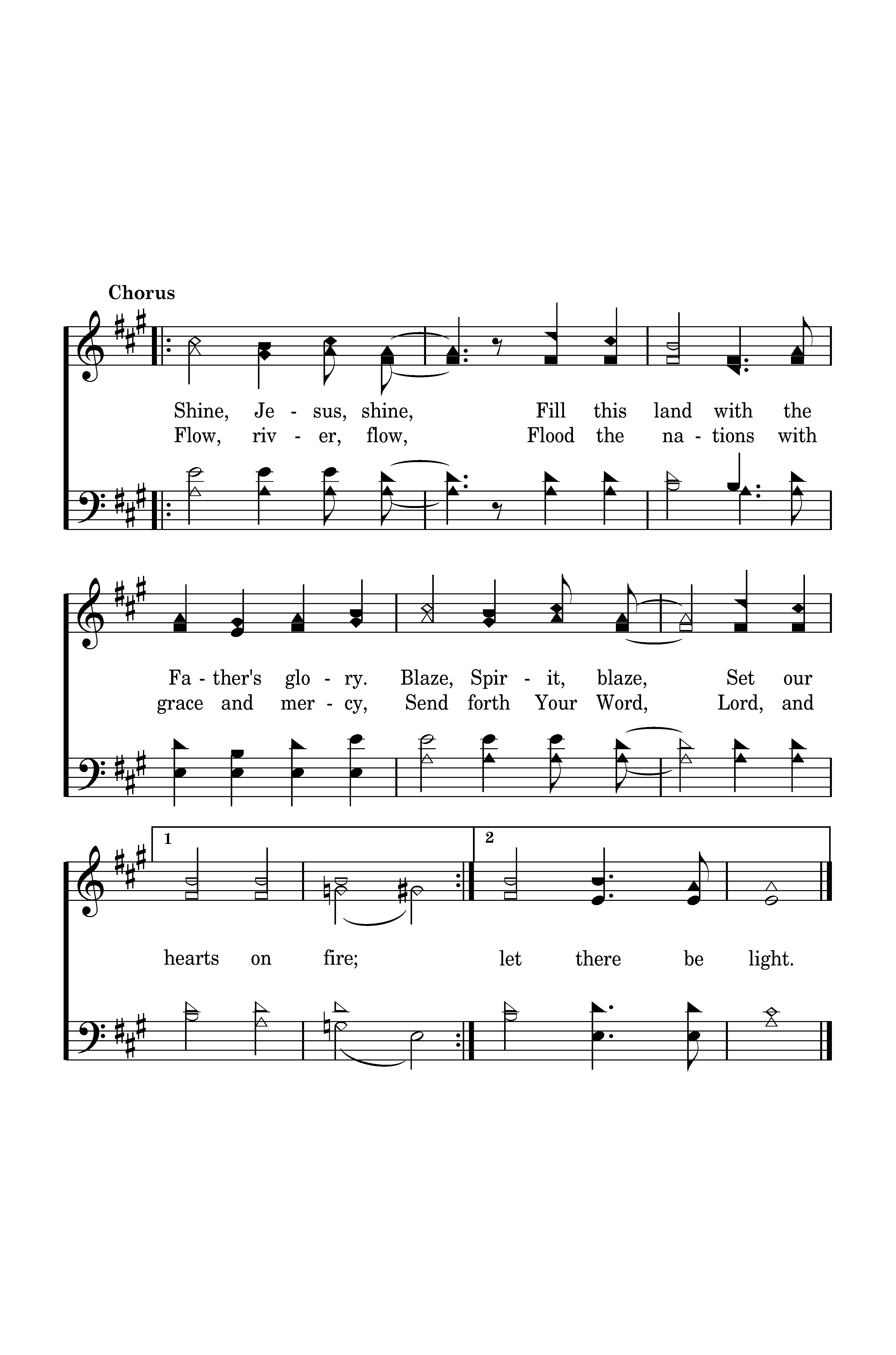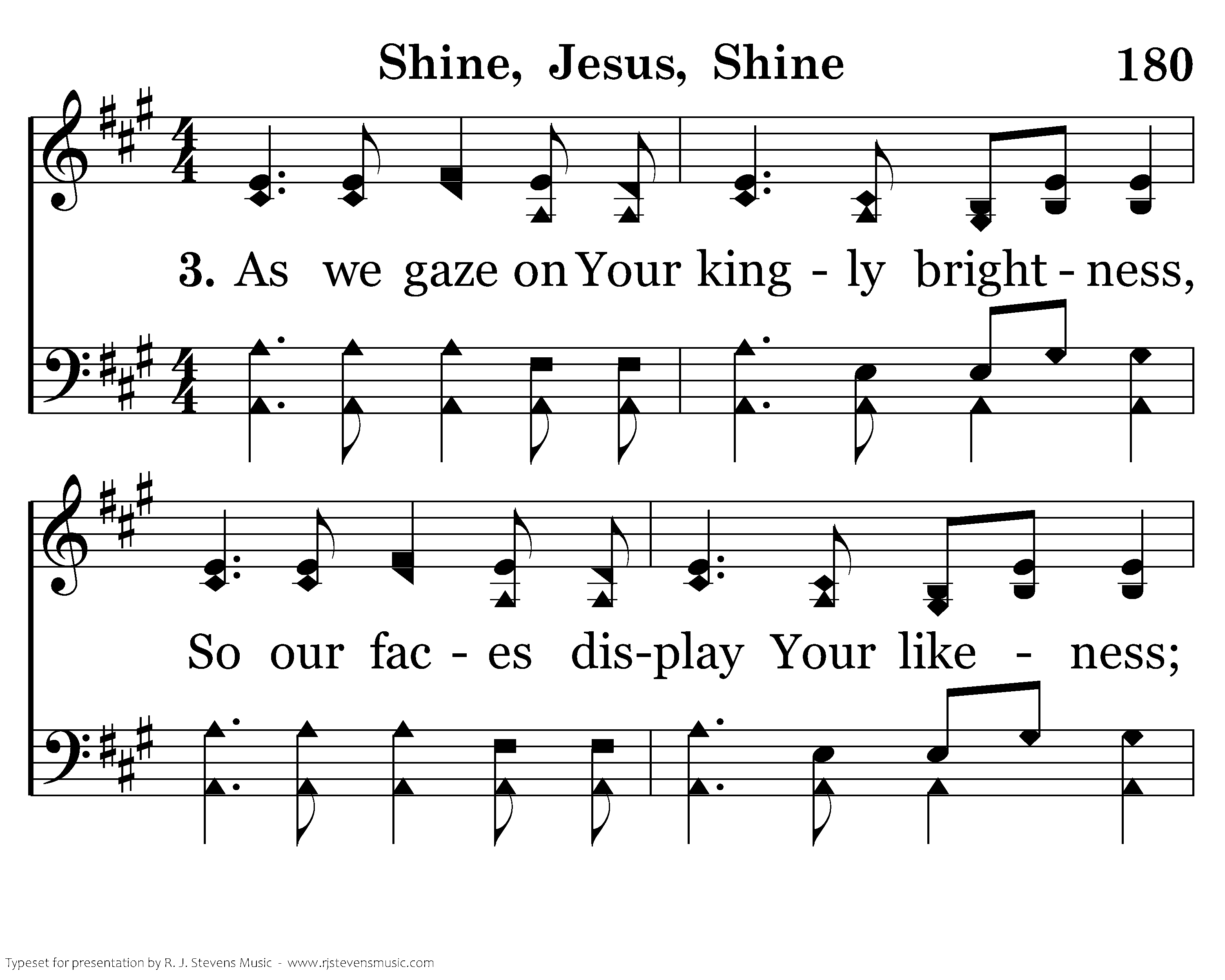 Shine, Jesus, shine, Fill this land with the Father's glory. Blaze, Spirit, blaze, Set our hearts on fire; Flow, river, flow, Flood the nations with grace and mercy, Send forth Your Word, Lord, and let there be light.