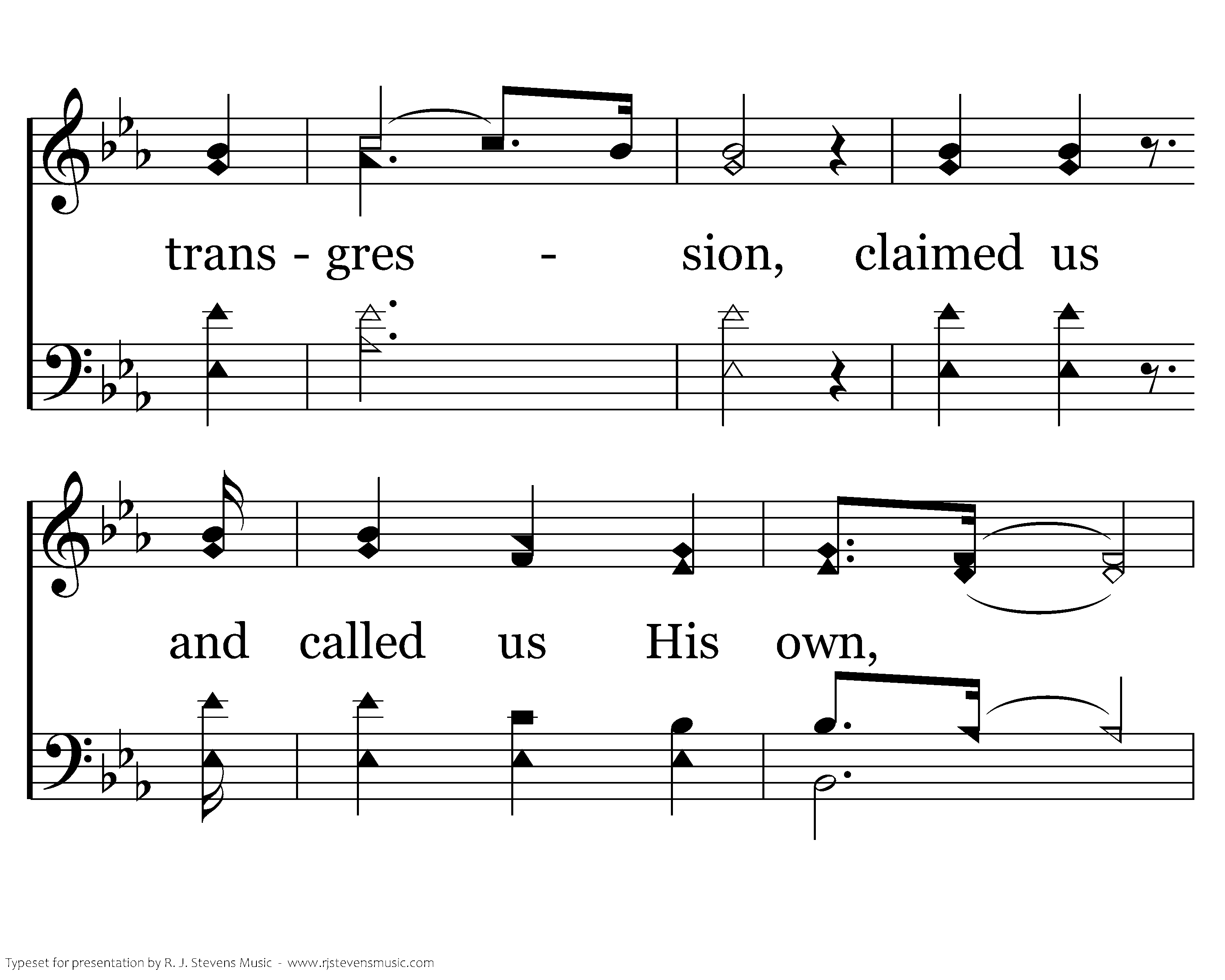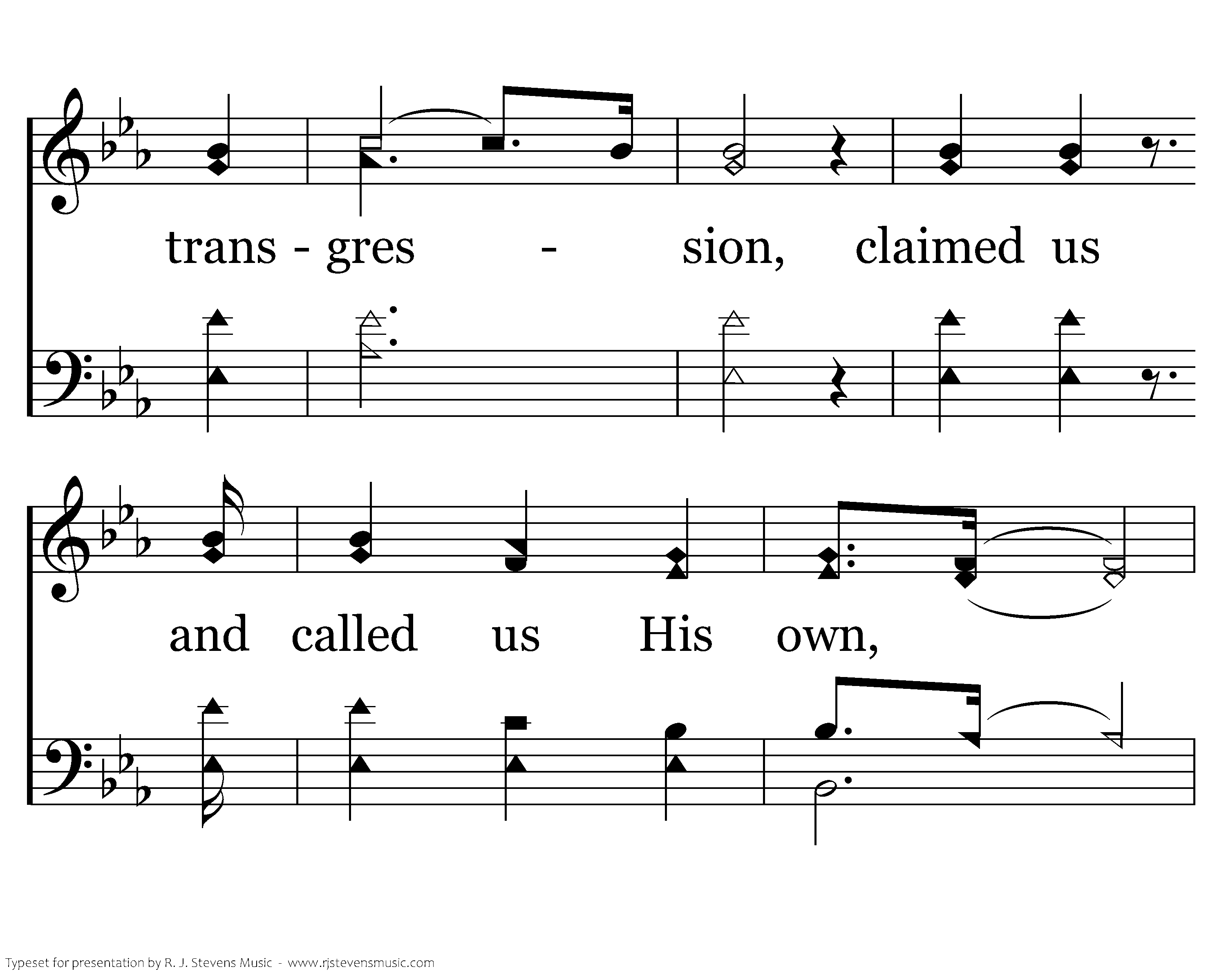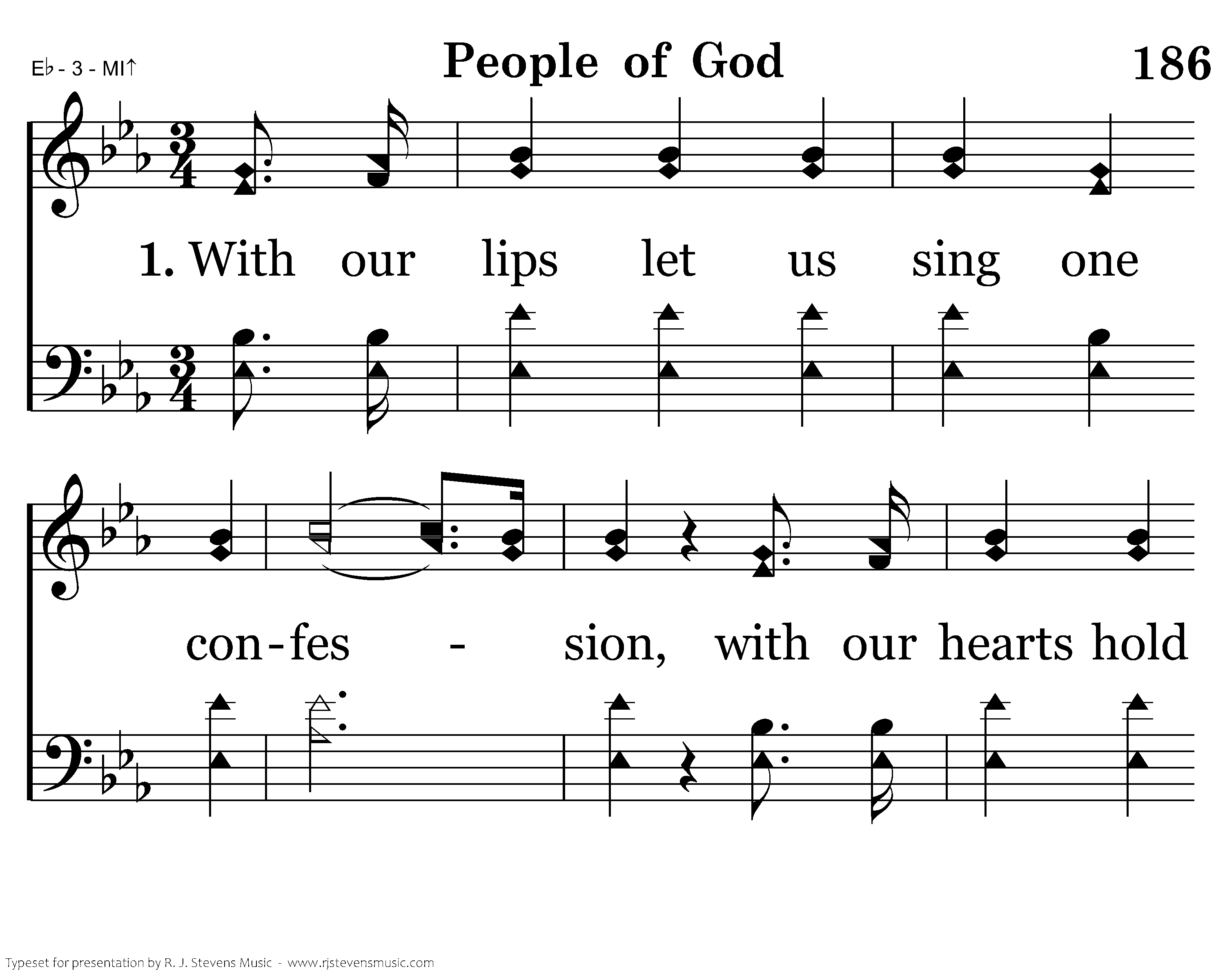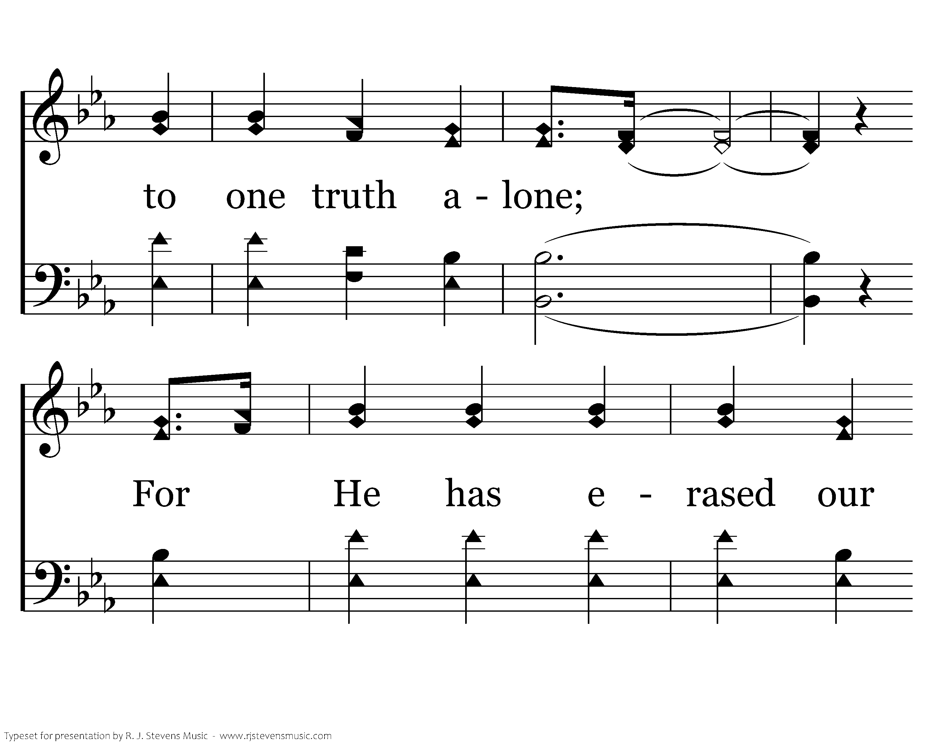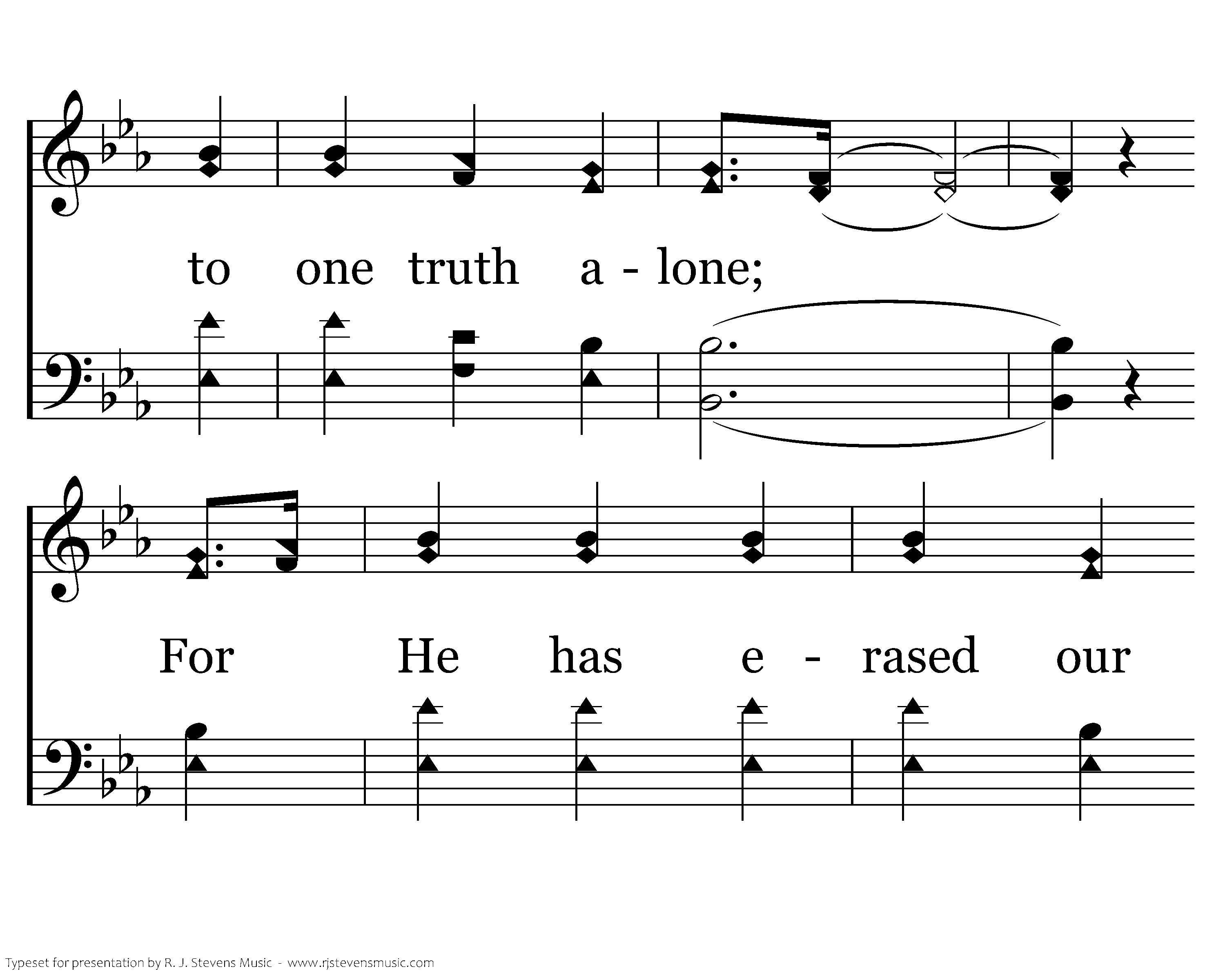 With our lips let us sing one confession, with our hearts hold to one truth alone; For He has erased our transgression, claimed us and called us His own, His very own.