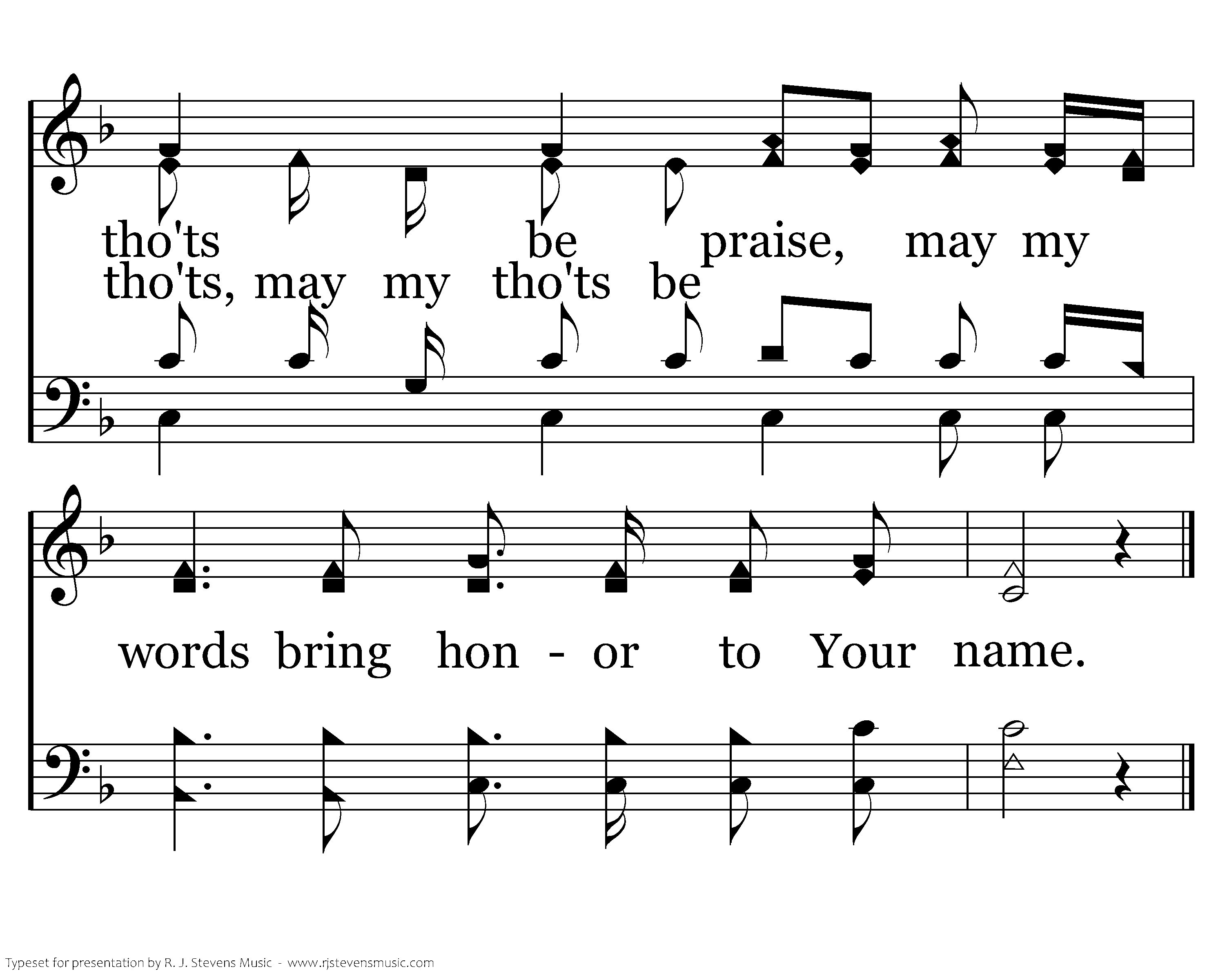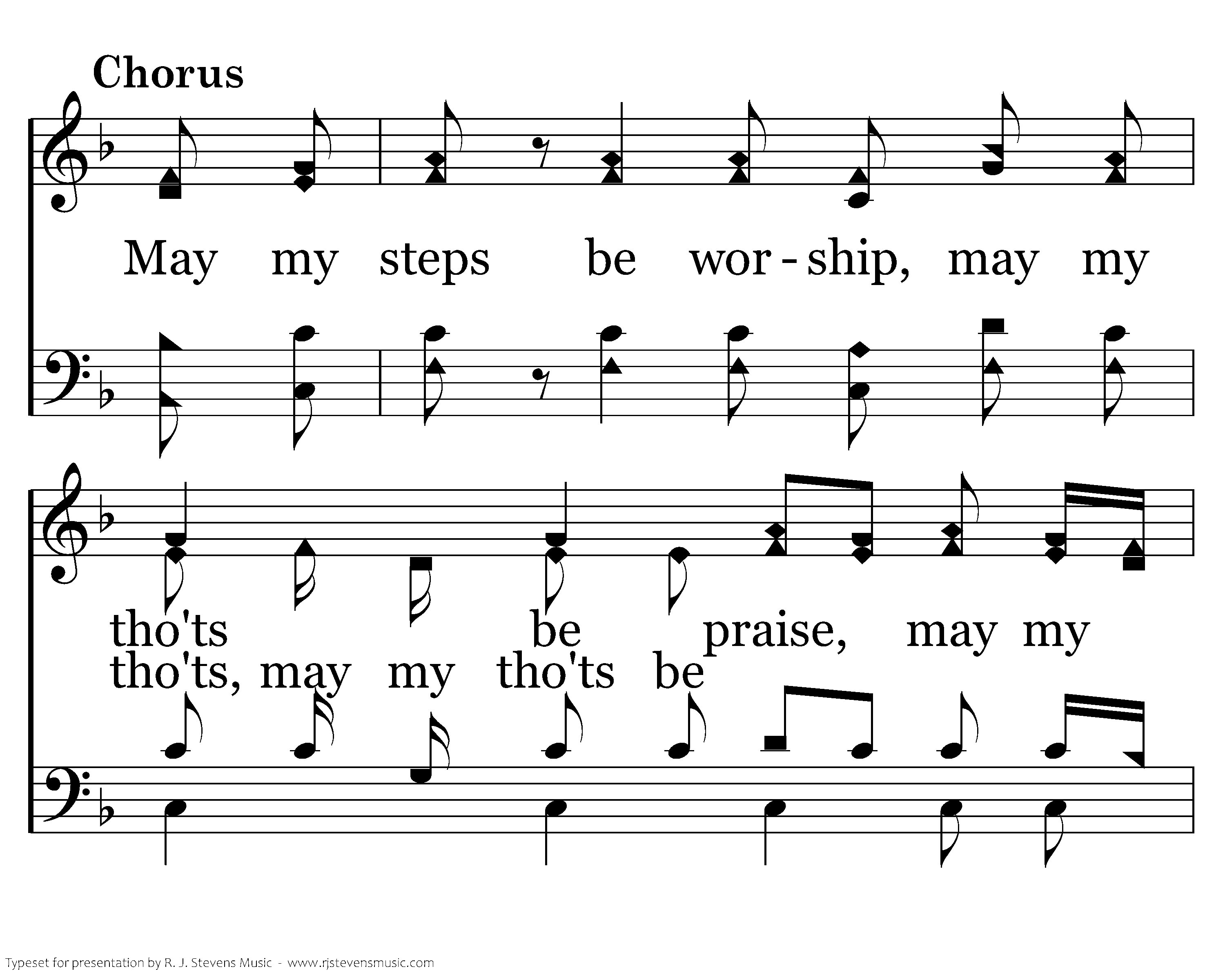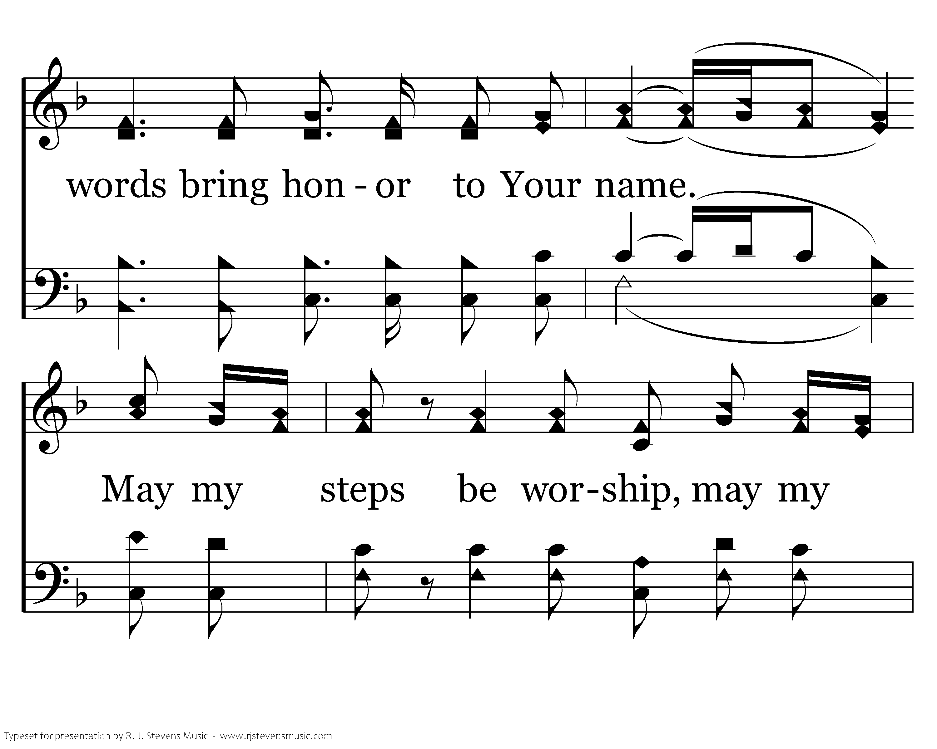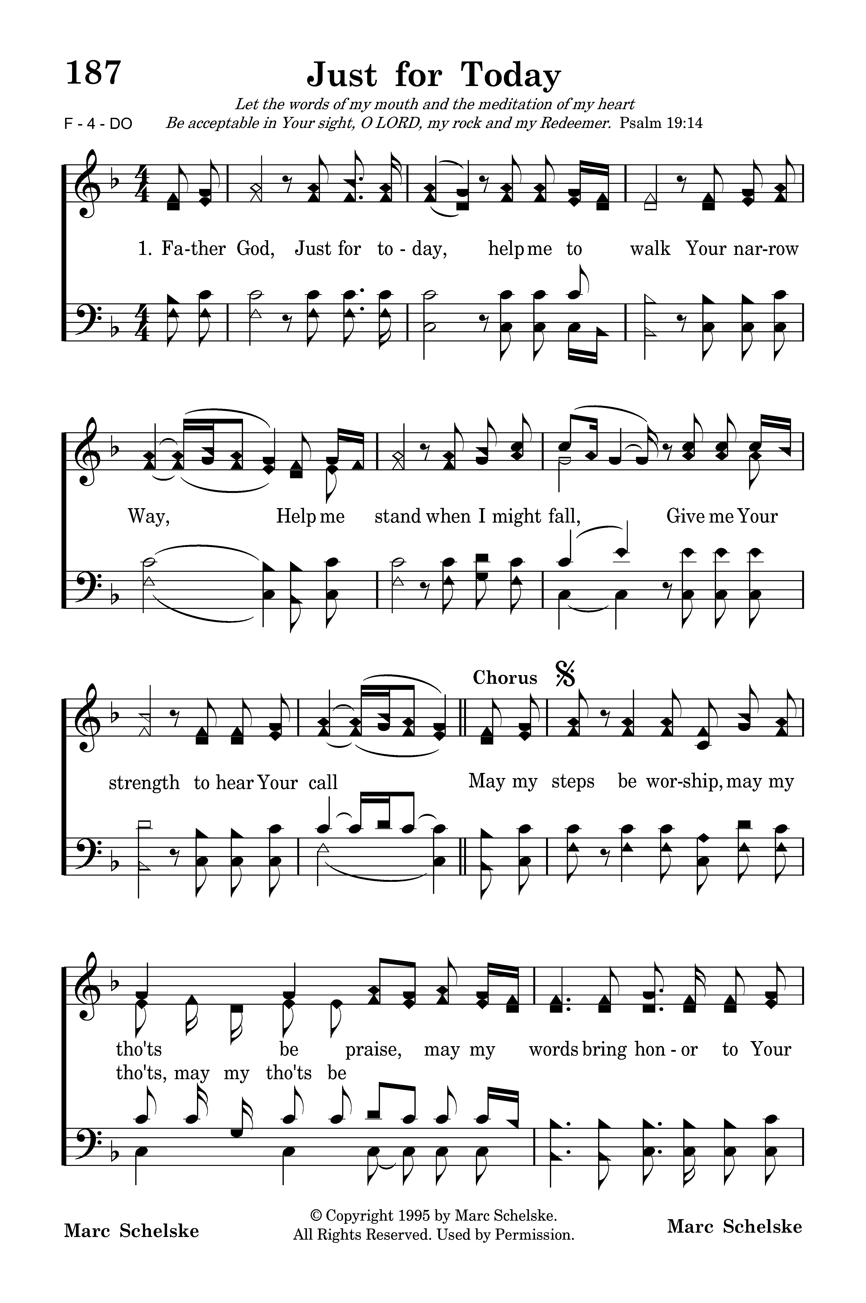Father God, Just for today, help me to walk Your narrow Way, Help me stand when I might fall, Give me Your strength to hear Your call May my steps be worship, may my tho'ts be praise, may my words bring honor to Your name. May my steps be worship, may my tho'ts be praise, may my words bring honor to Your name. name.