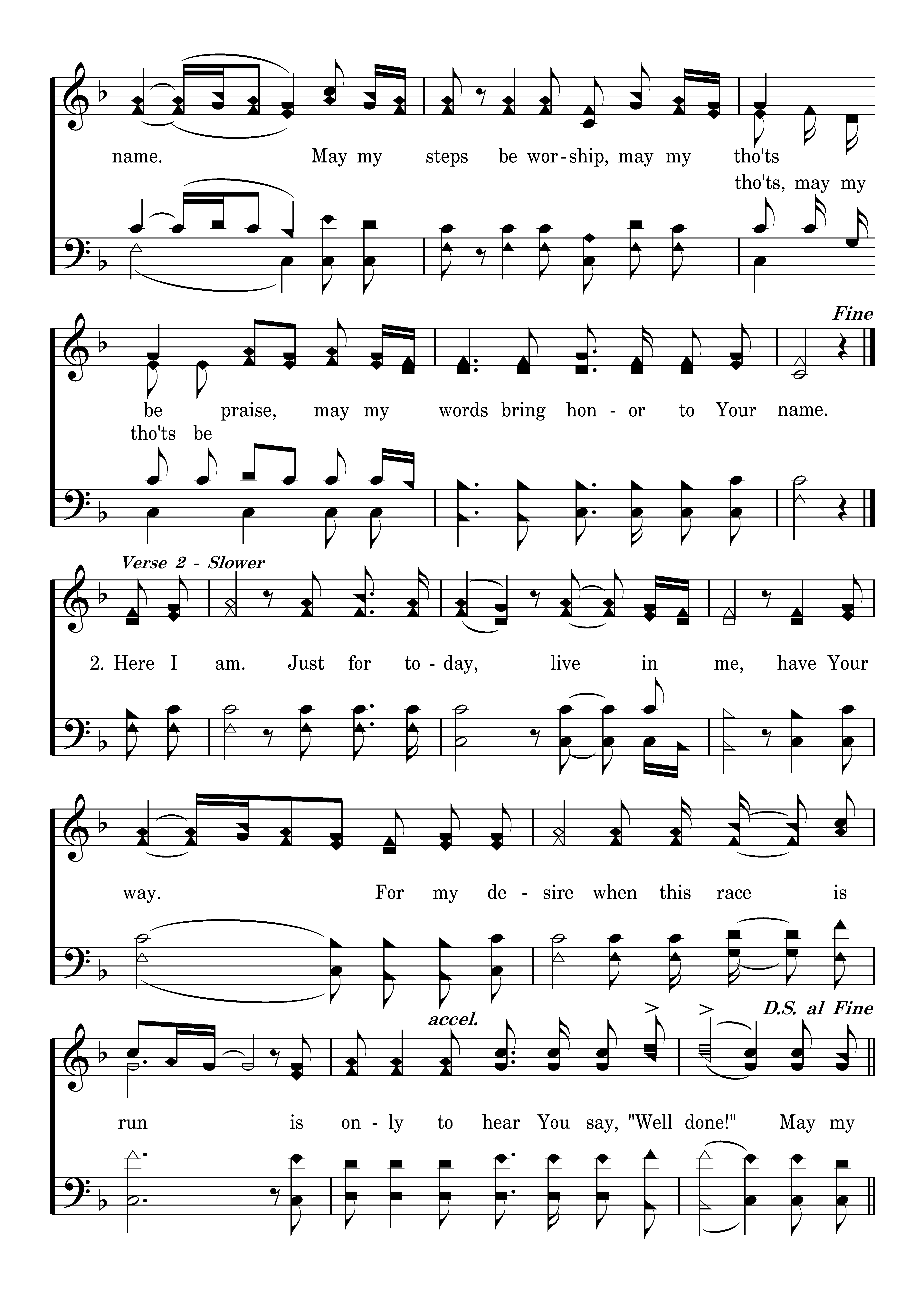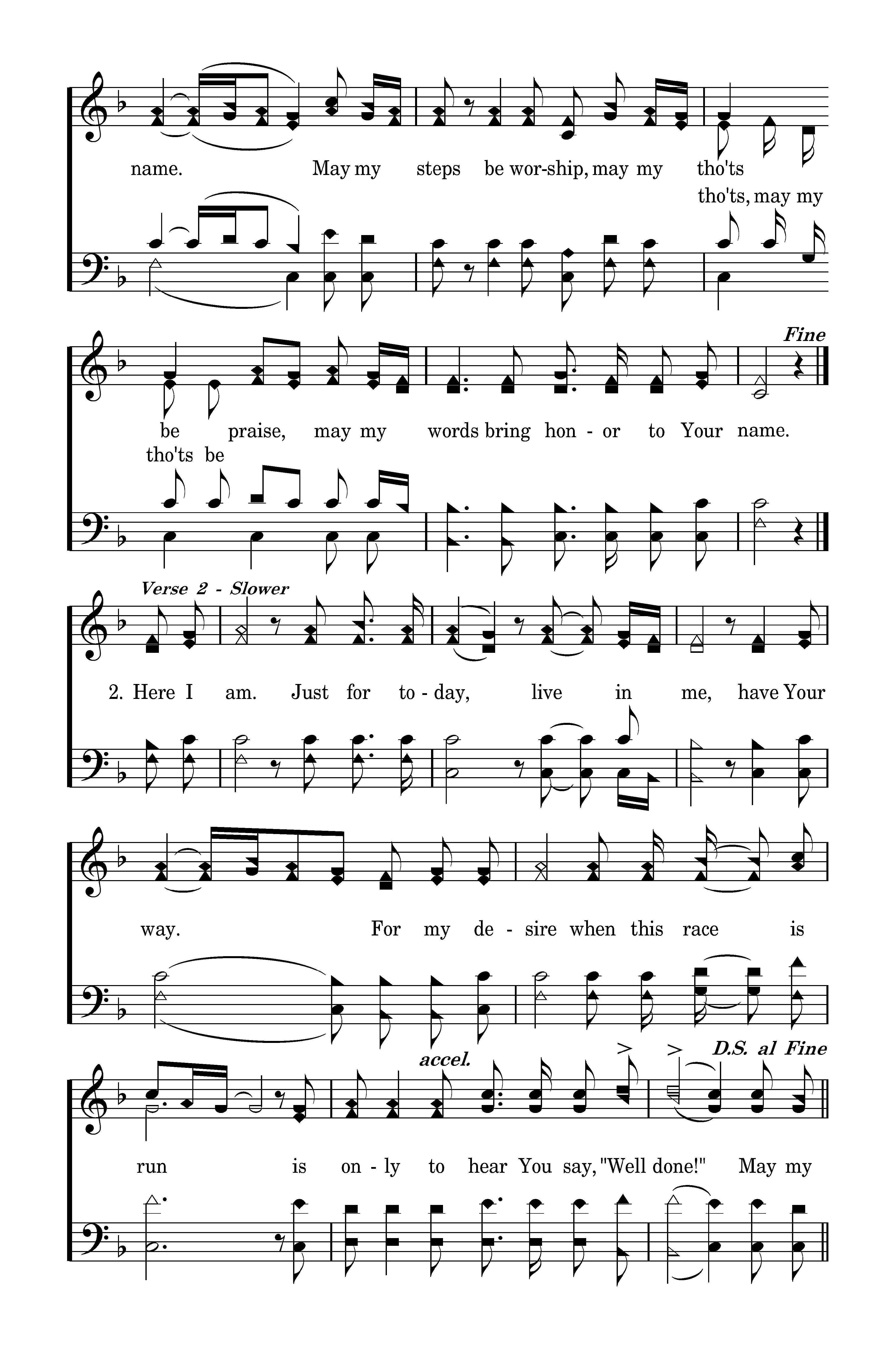 Here I am. Just for today, live in me, have Your way. For my desire when this race is run is only to hear You say, "Well done!" May my me, May my steps be worship, may my tho'ts be praise, may my words bring honor to Your name. May my steps be worship, may my tho'ts be praise, may my words bring honor to Your name. name.