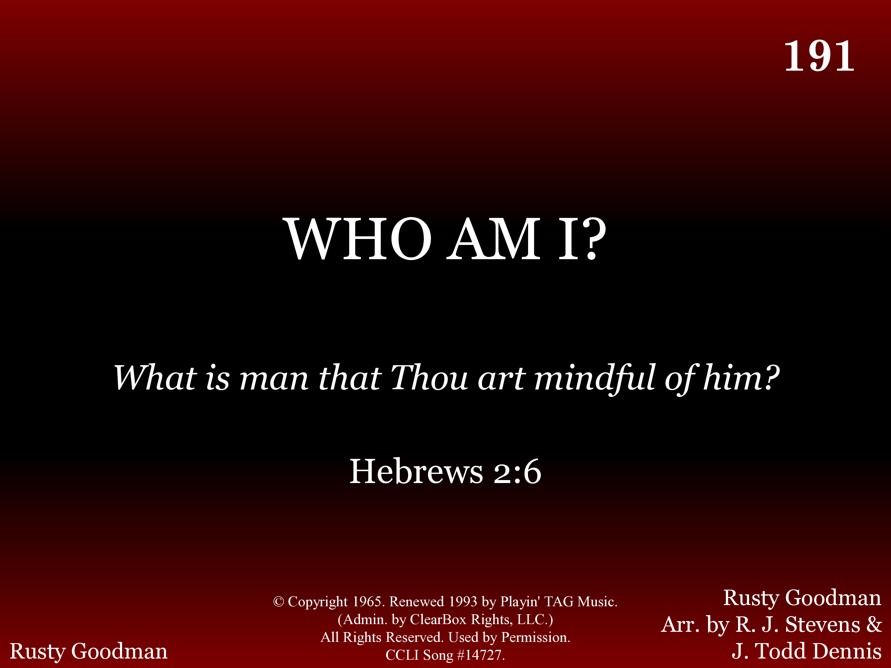 - Copyright © 1965. Renewed 1993 by Playin' TAG Music. (Admin. by ClearBox Rights, LLC.) All Rights Reserved. Used by Permission.