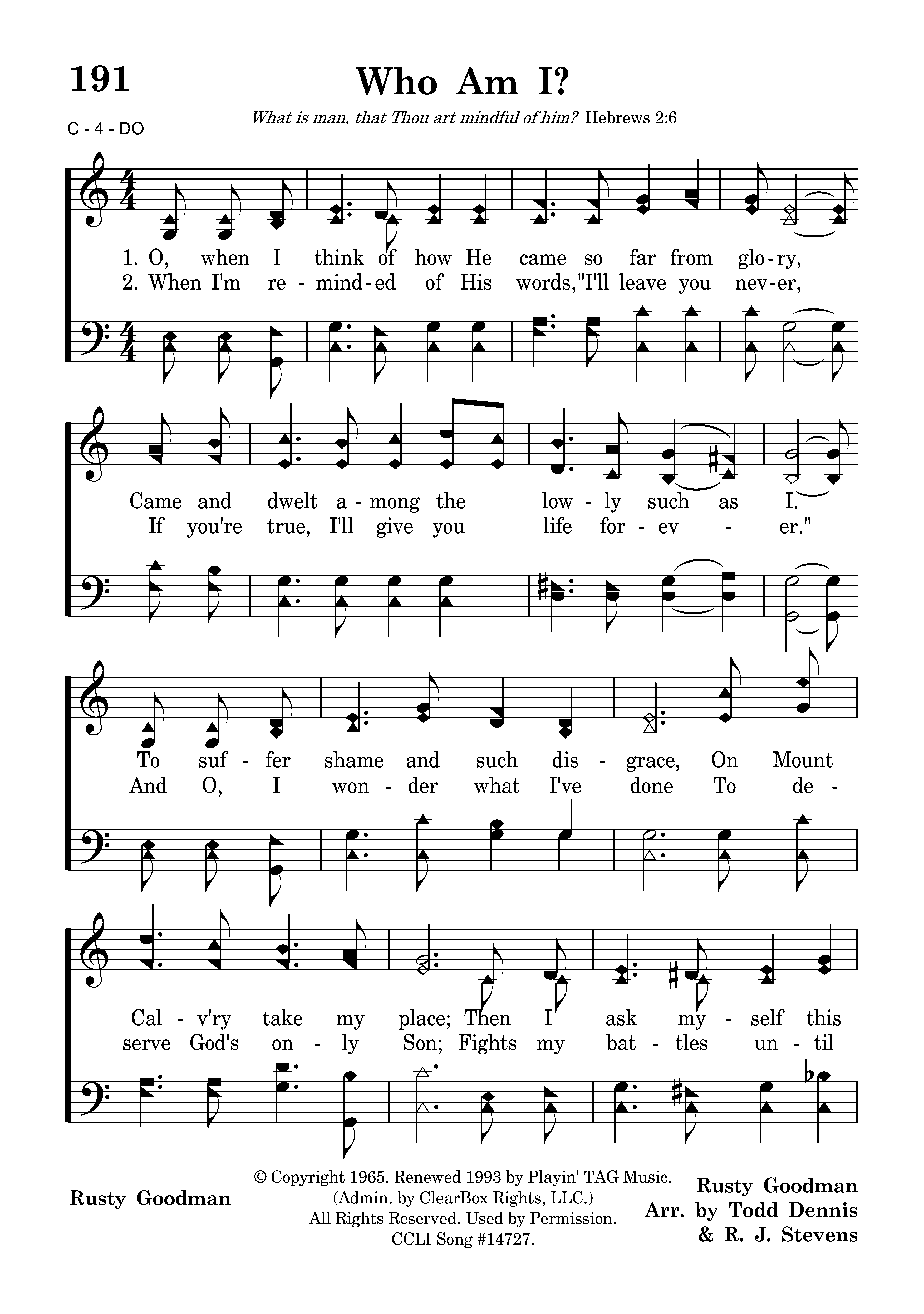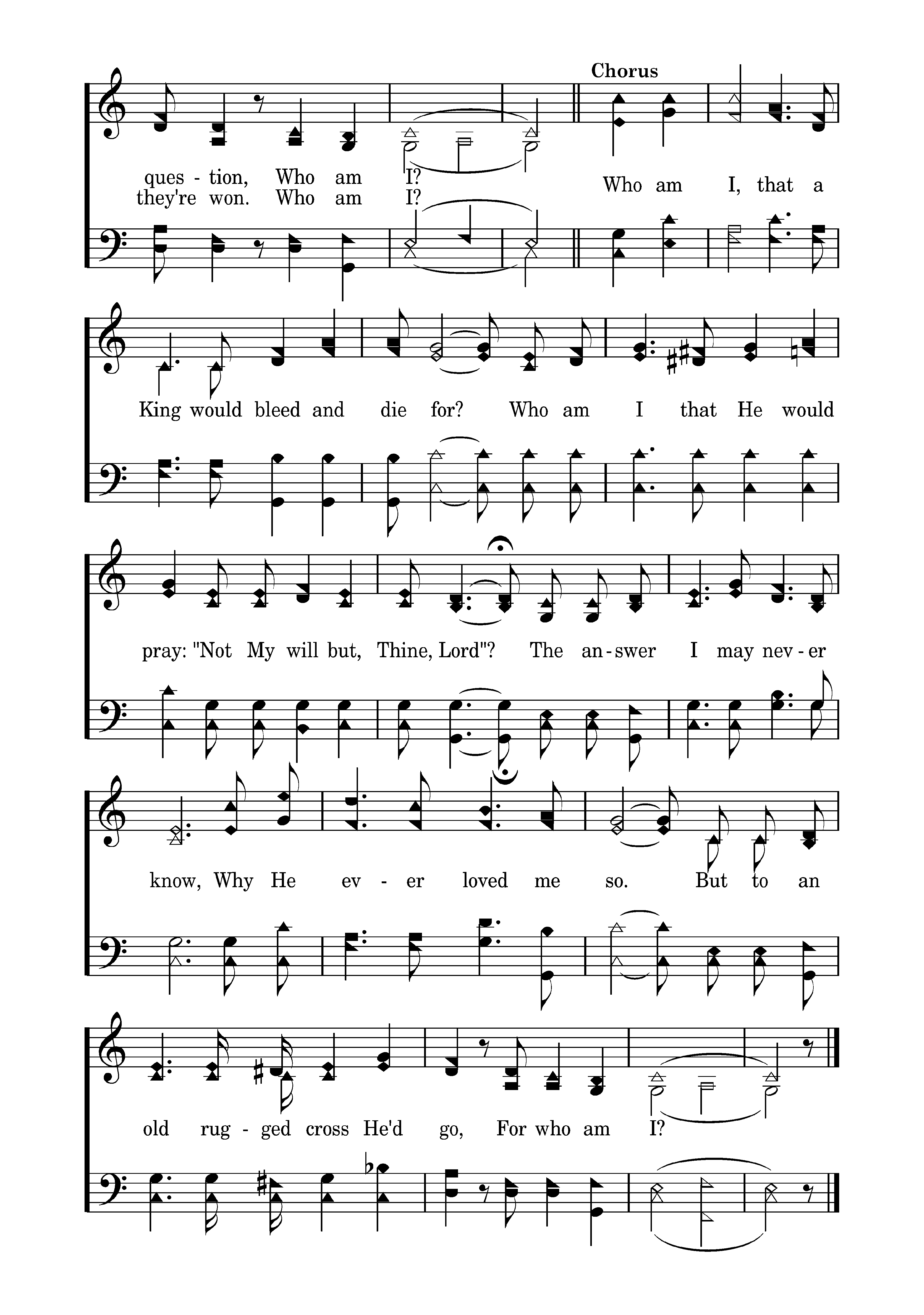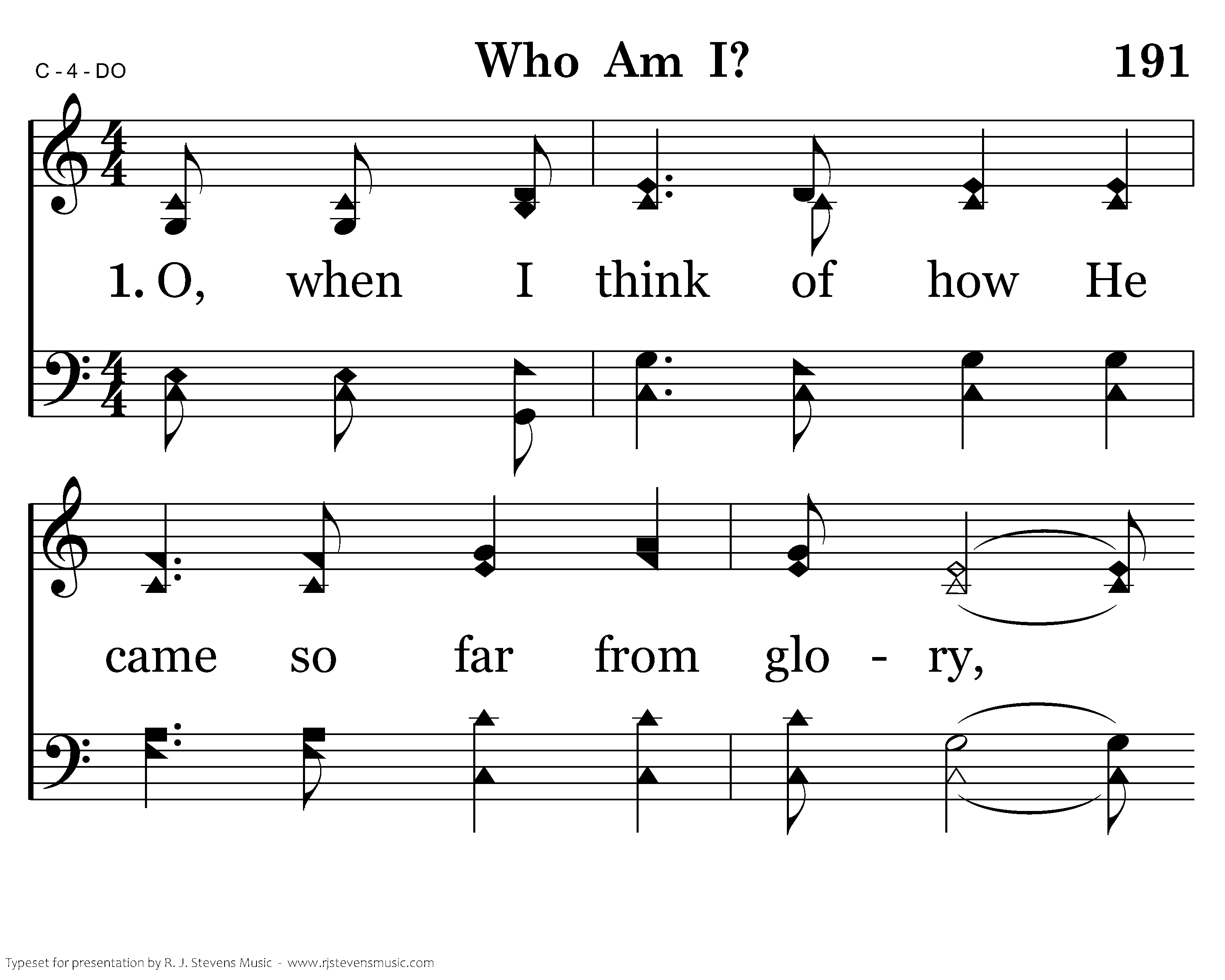 O, when I think of how He came so far from glory, Came and dwelt among the lowly such as I. To suffer shame and such disgrace On Mount Calv'ry take my place; Then I ask myself this question, Who am I?