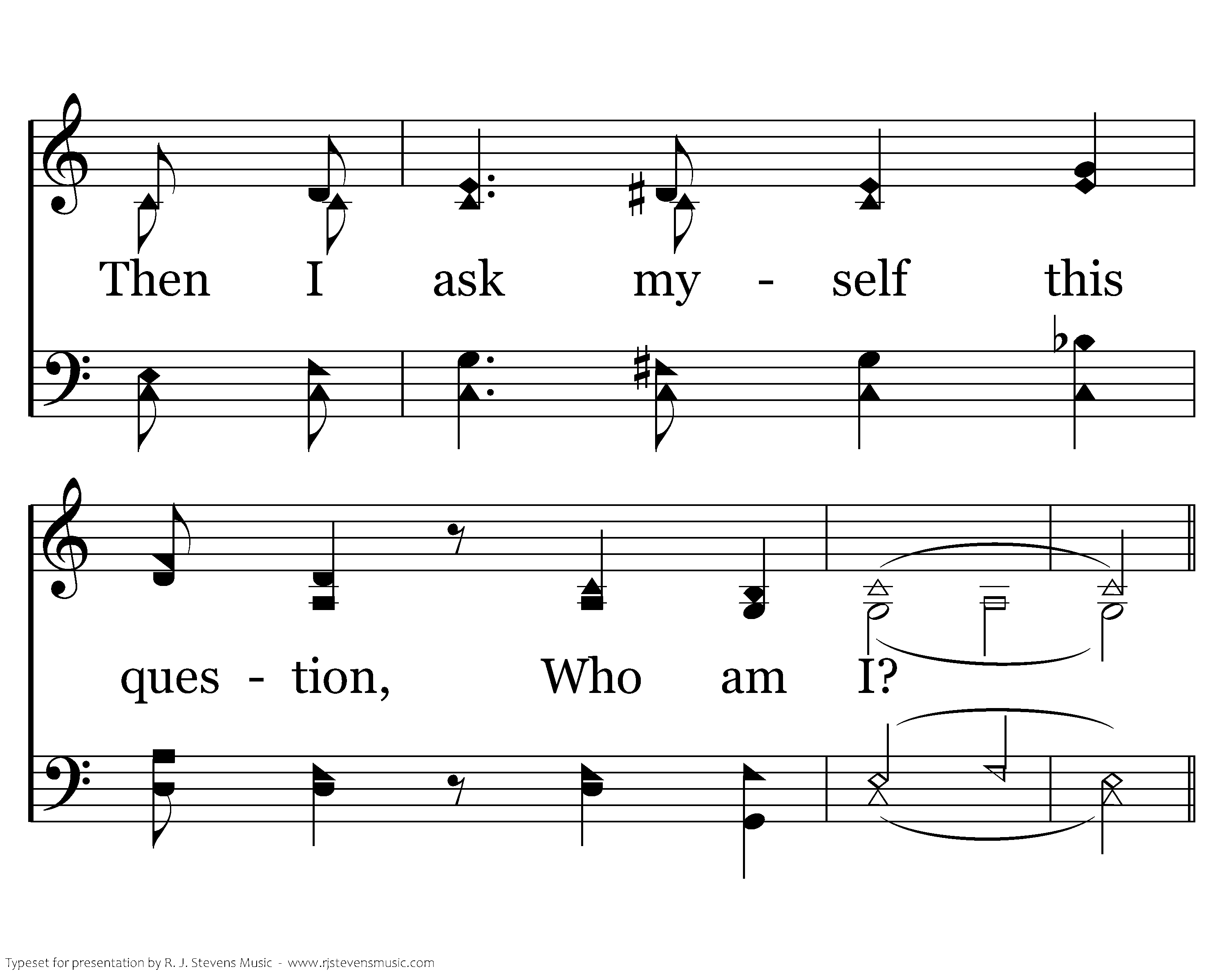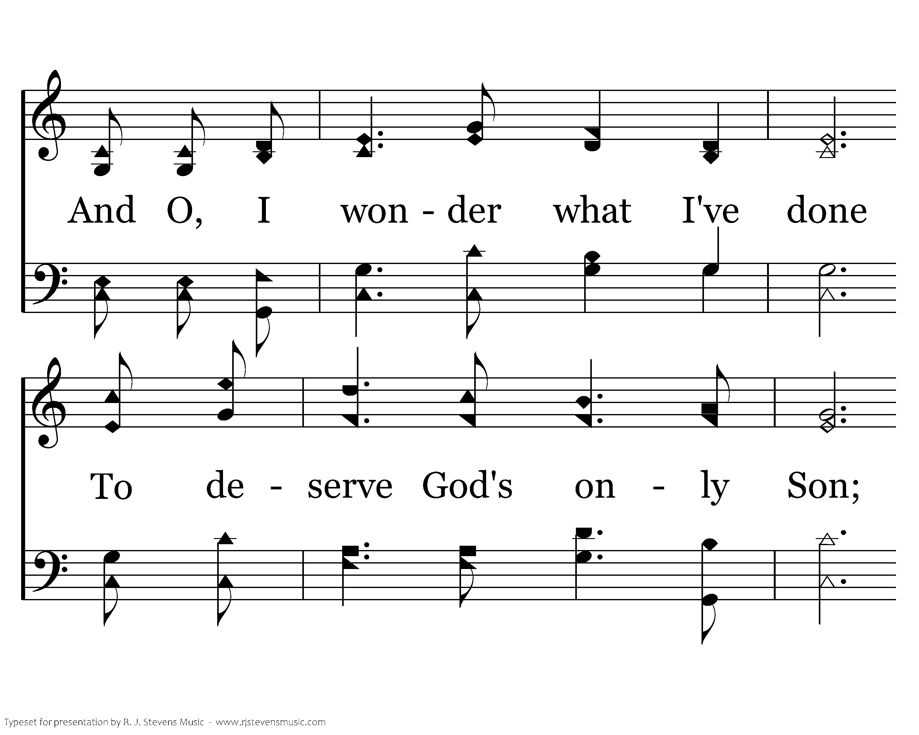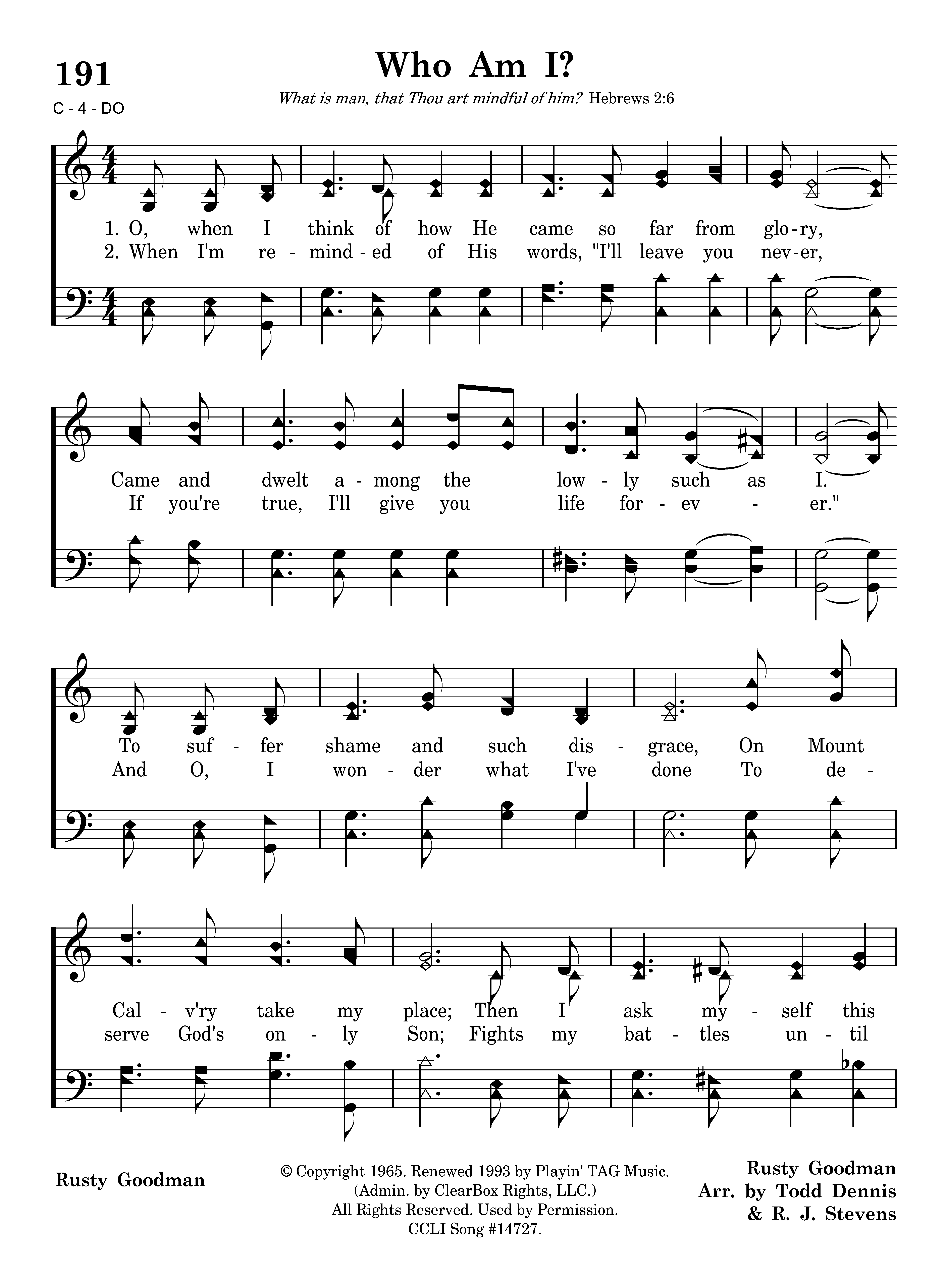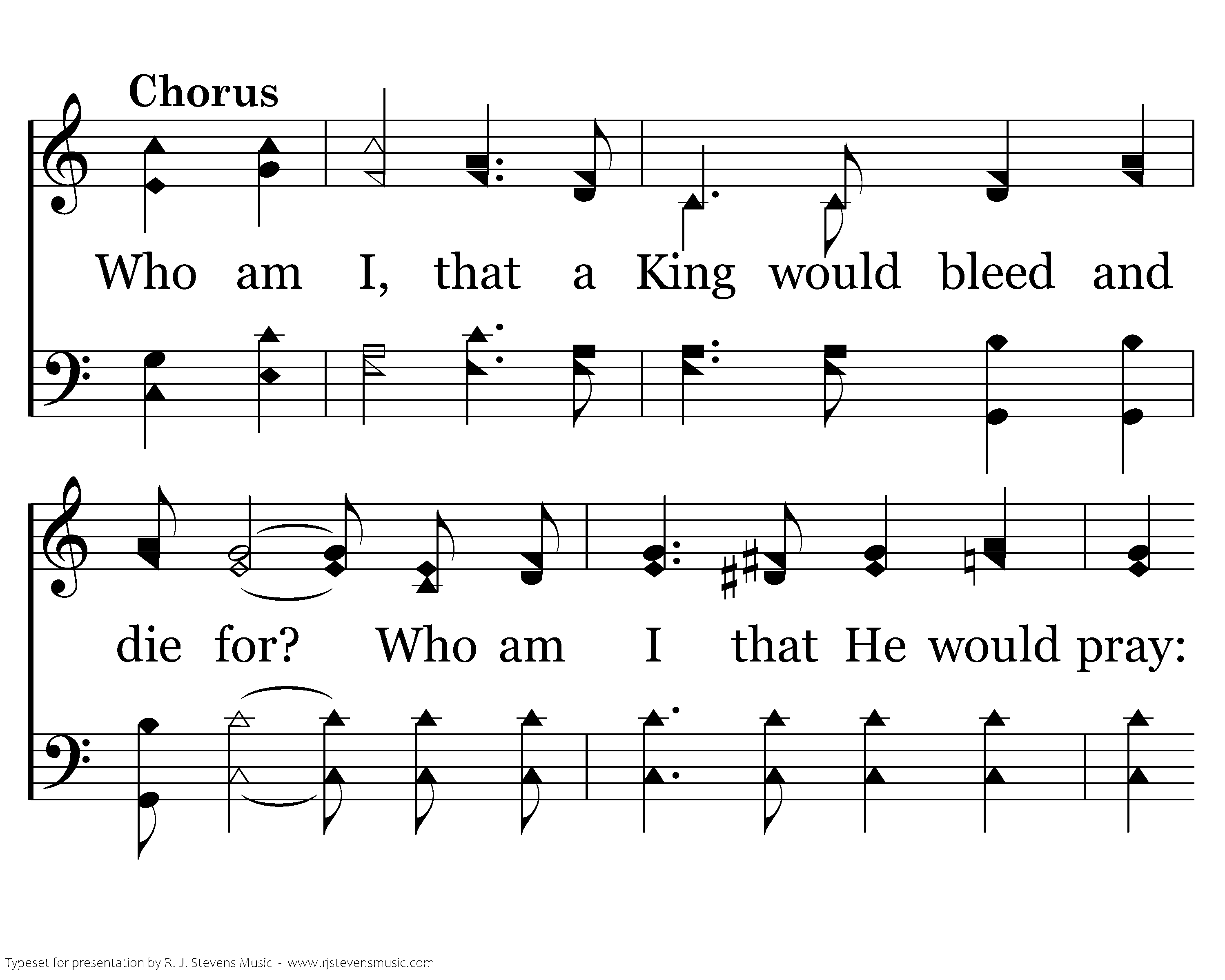 O, when I think of how He came so far from glory, Came and dwelt among the lowly such as I. To suffer shame and such disgrace On Mount Calv'ry take my place; Then I ask myself this question, Who am I?