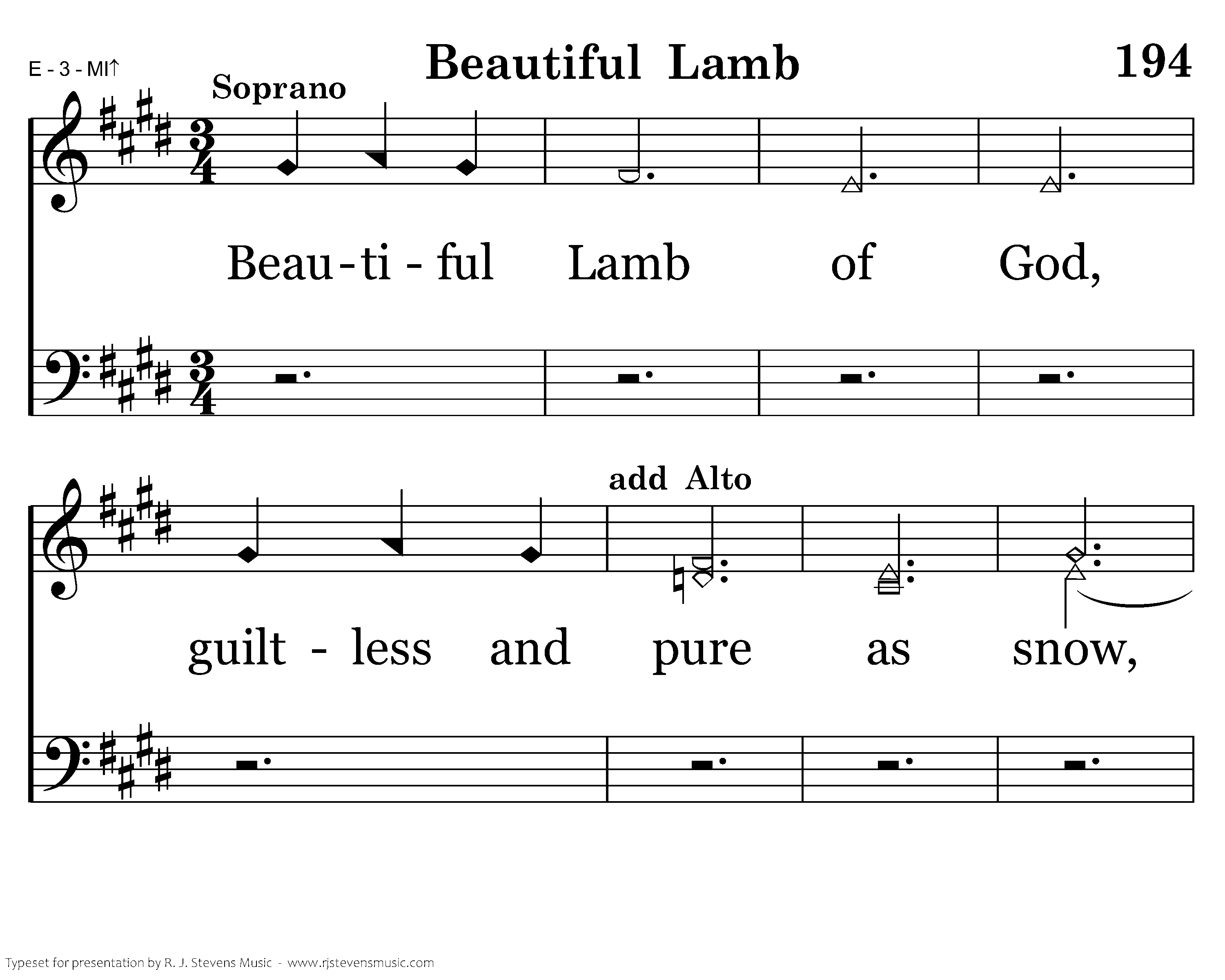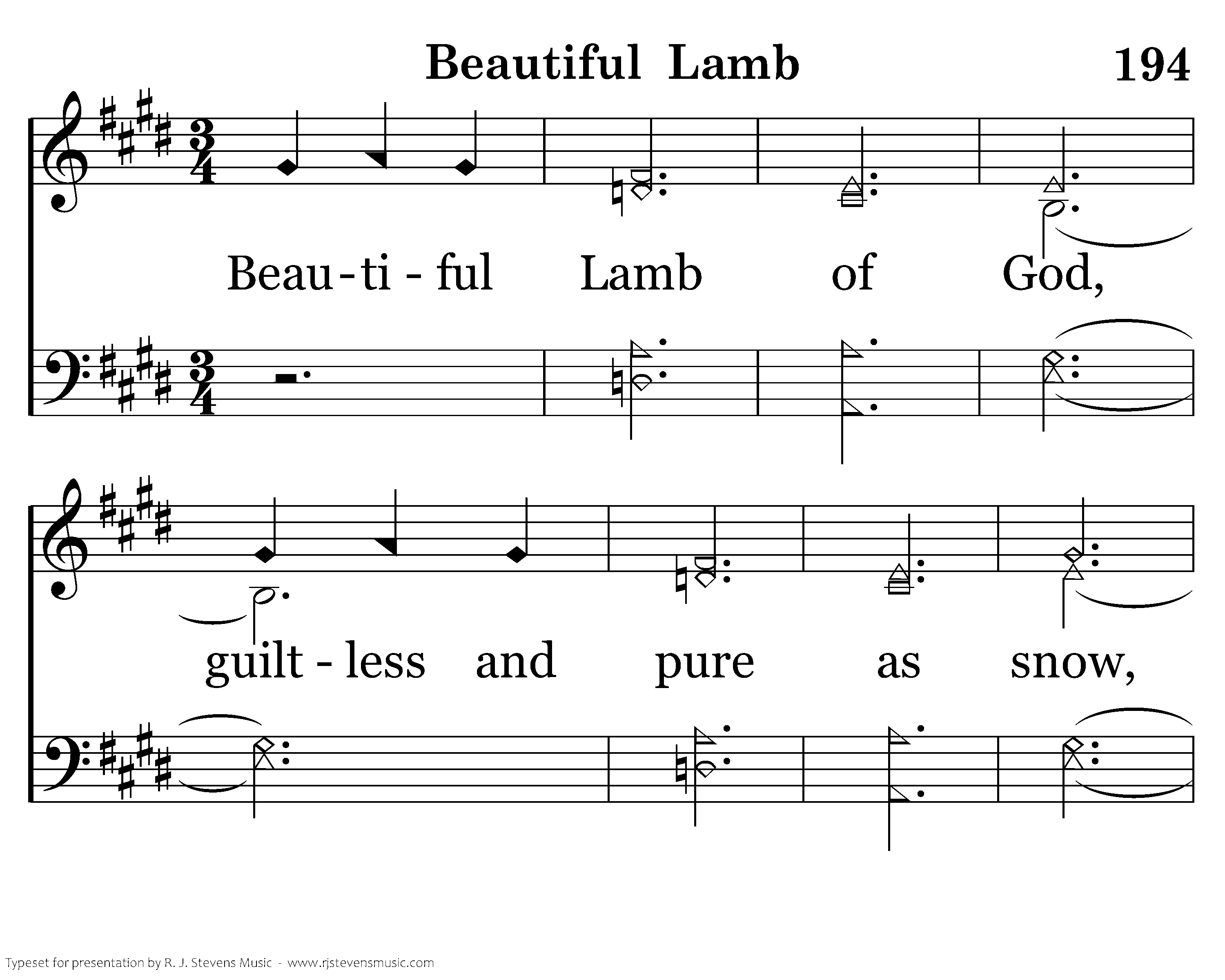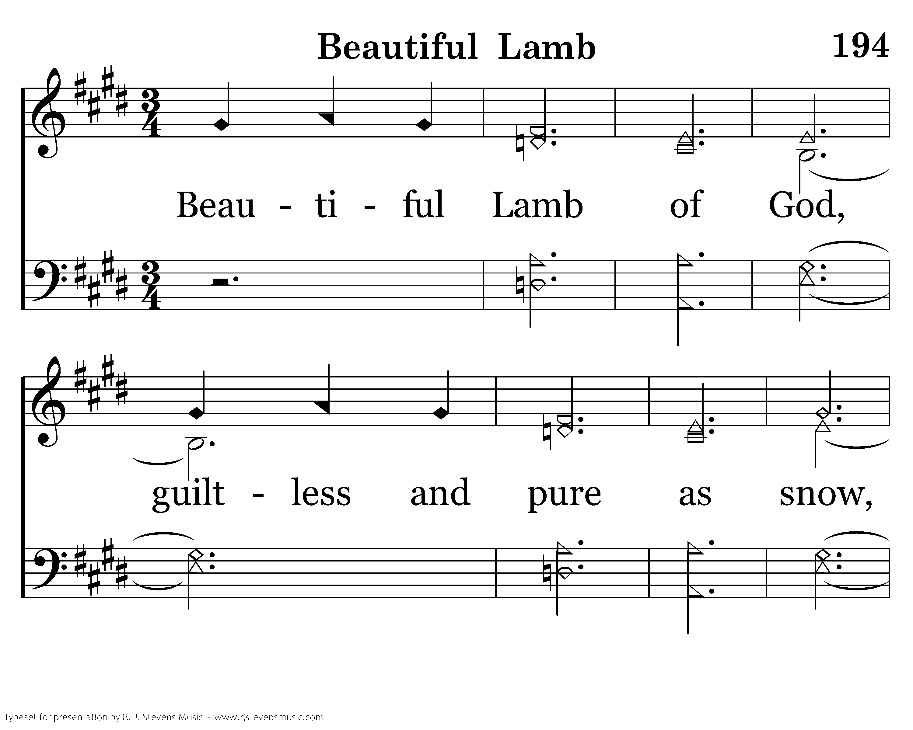 Beautiful Lamb of God, guiltless and pure as snow, Gentle and merciful, beautiful Lamb of God. Like sheep we've gone astray, Each turn to his own way, But Jesus take our sins away.