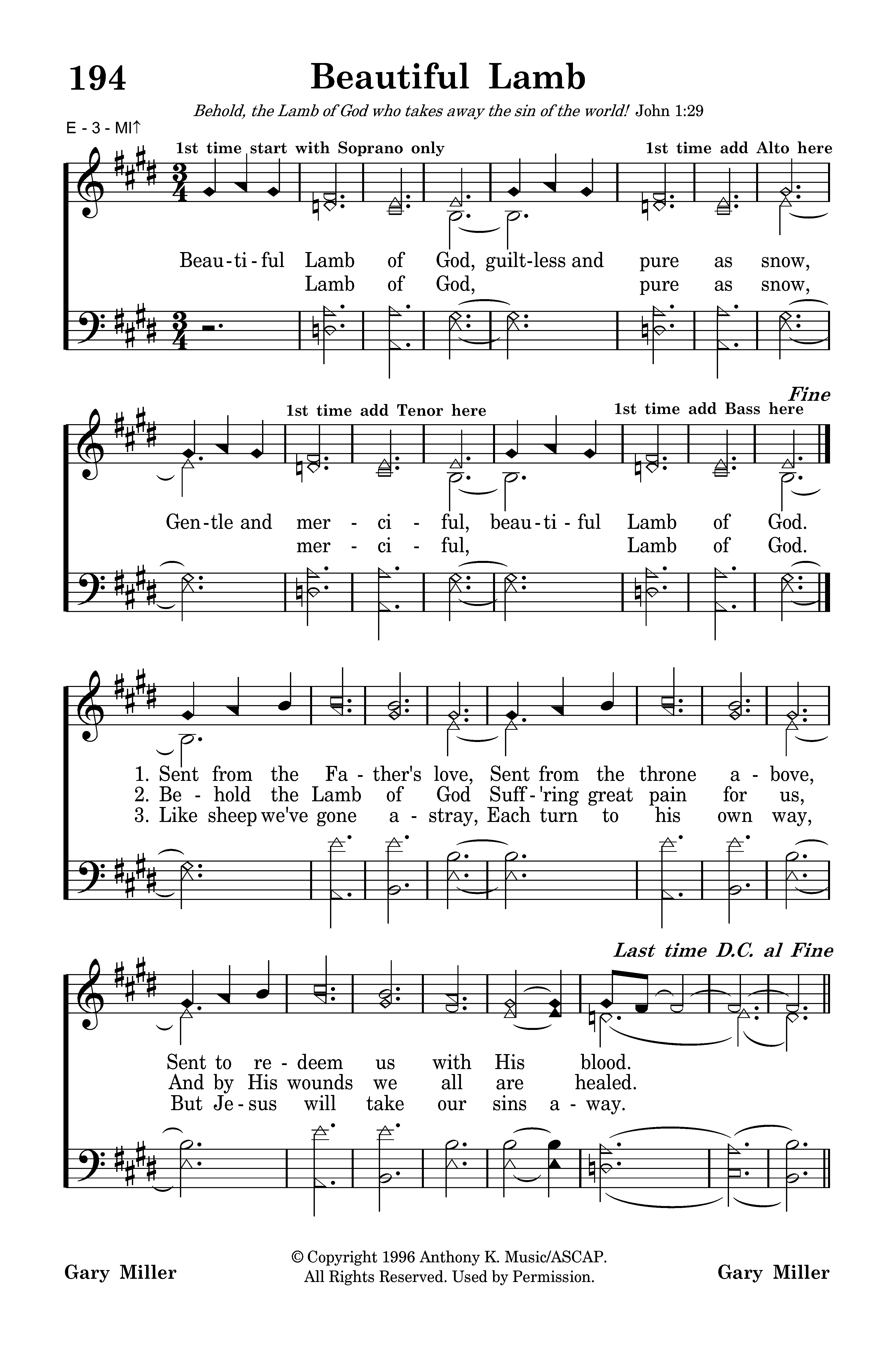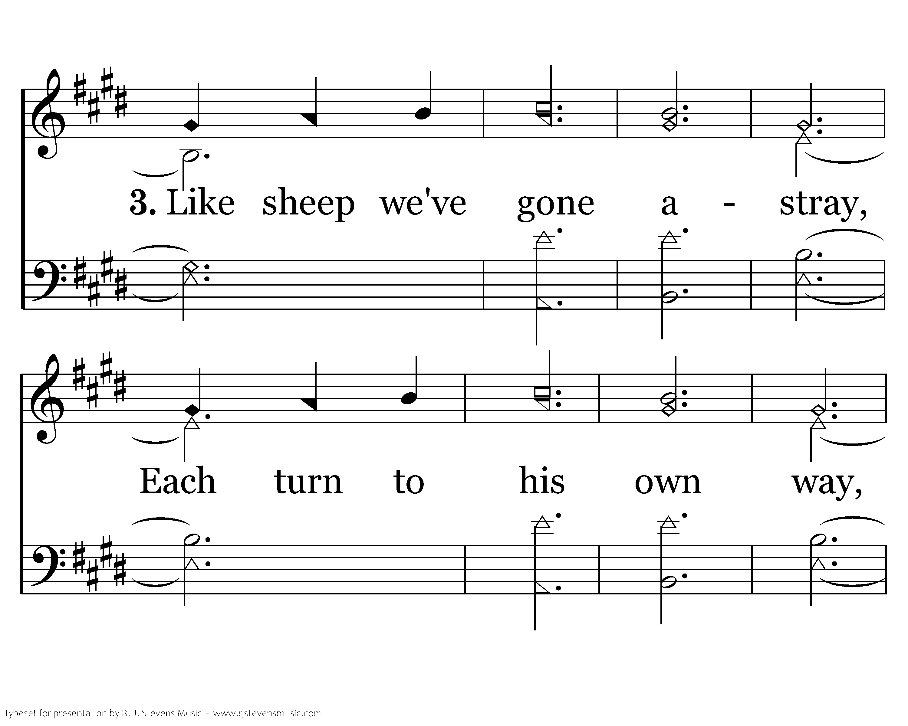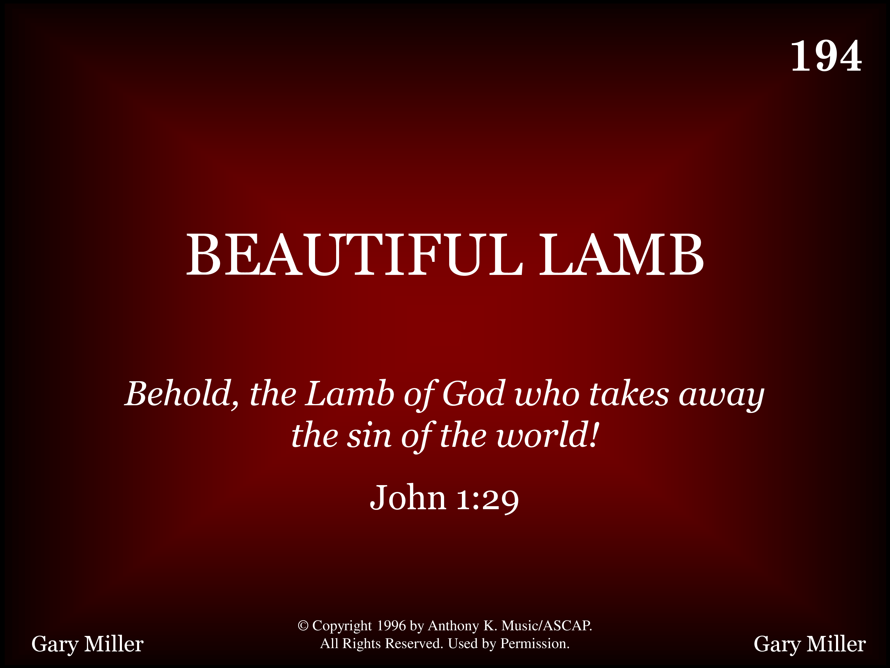 Beautiful Lamb of God, guiltless and pure as snow, Gentle and merciful, beautiful Lamb of God. Like sheep we've gone astray, Each turn to his own way, But Jesus take our sins away.