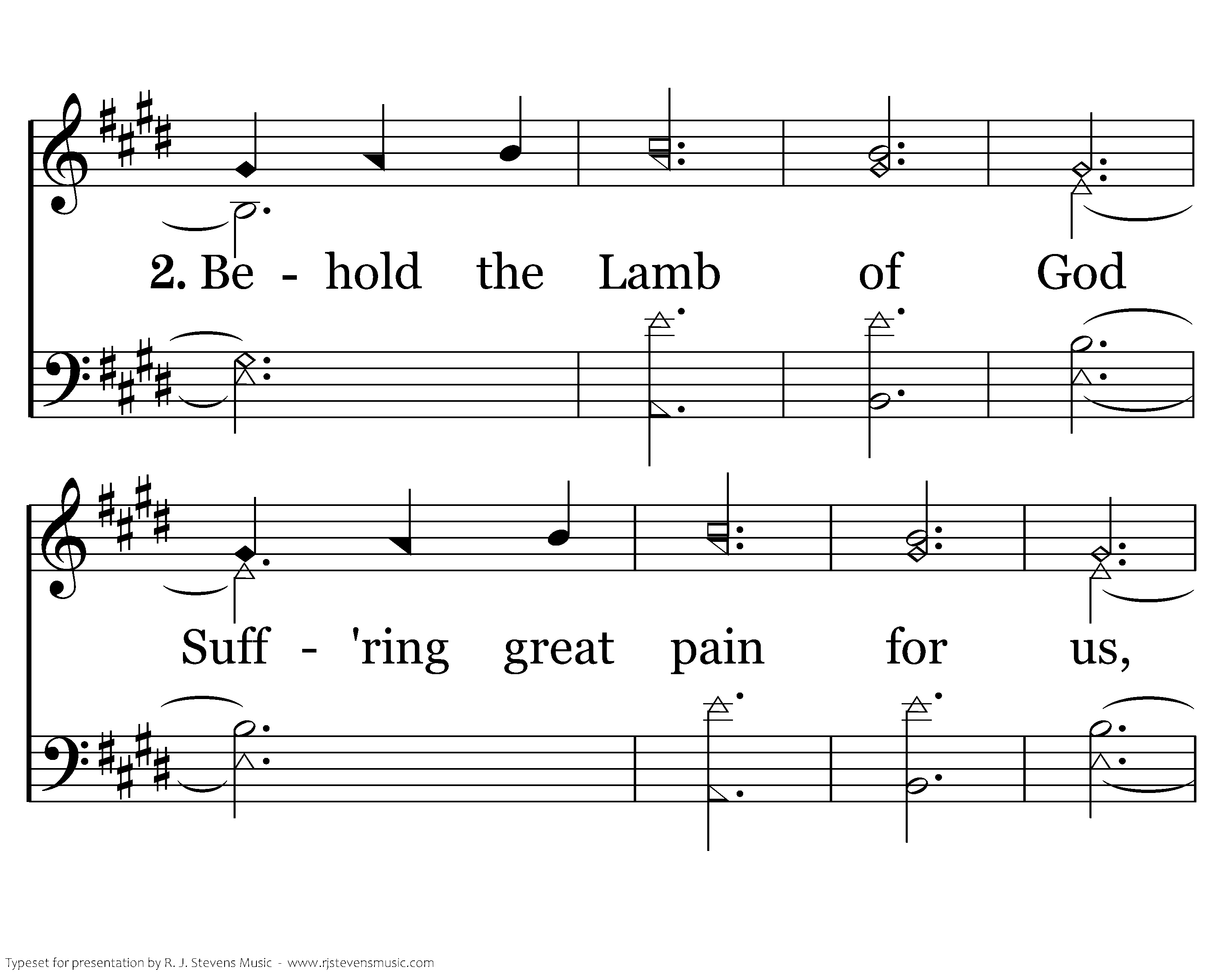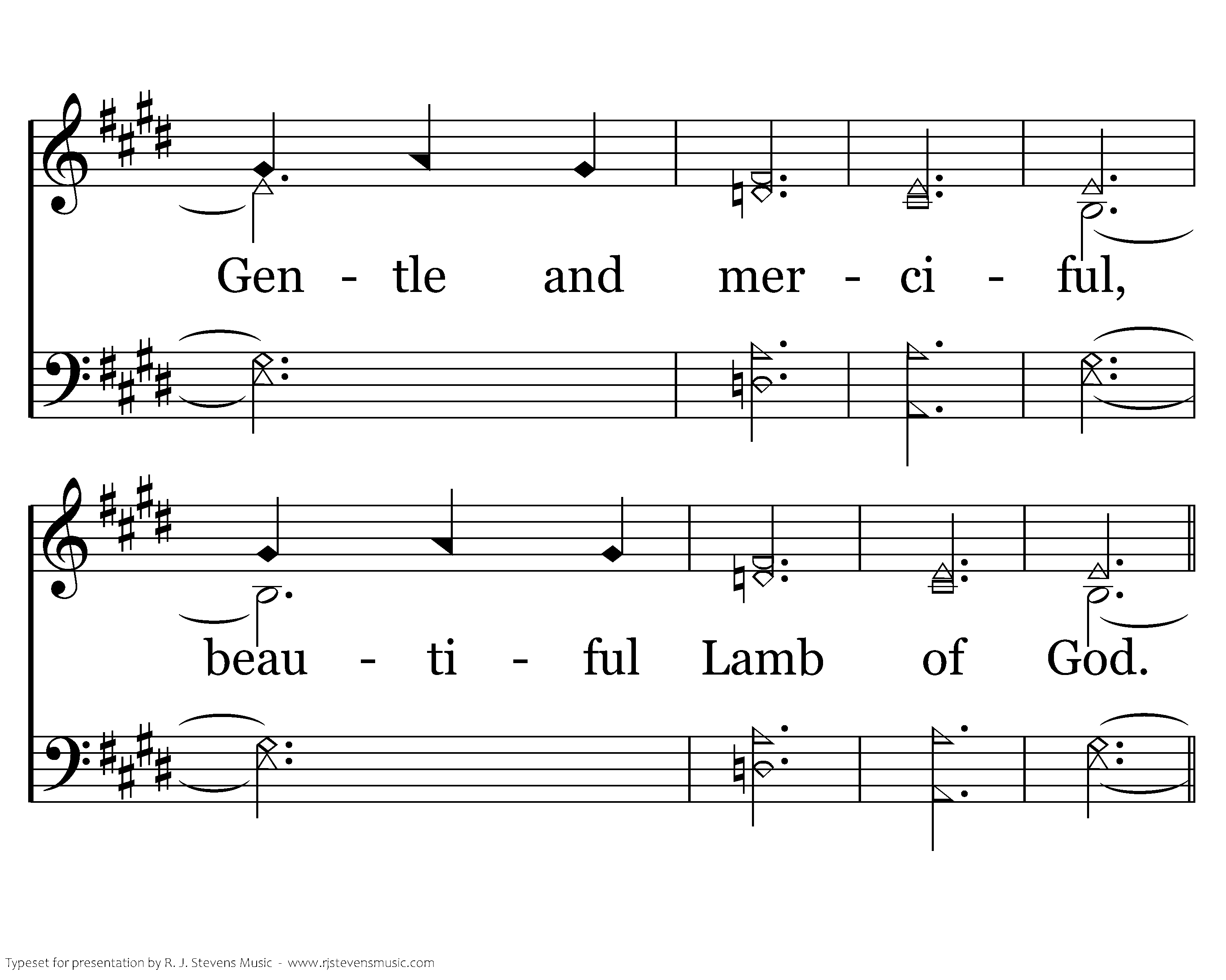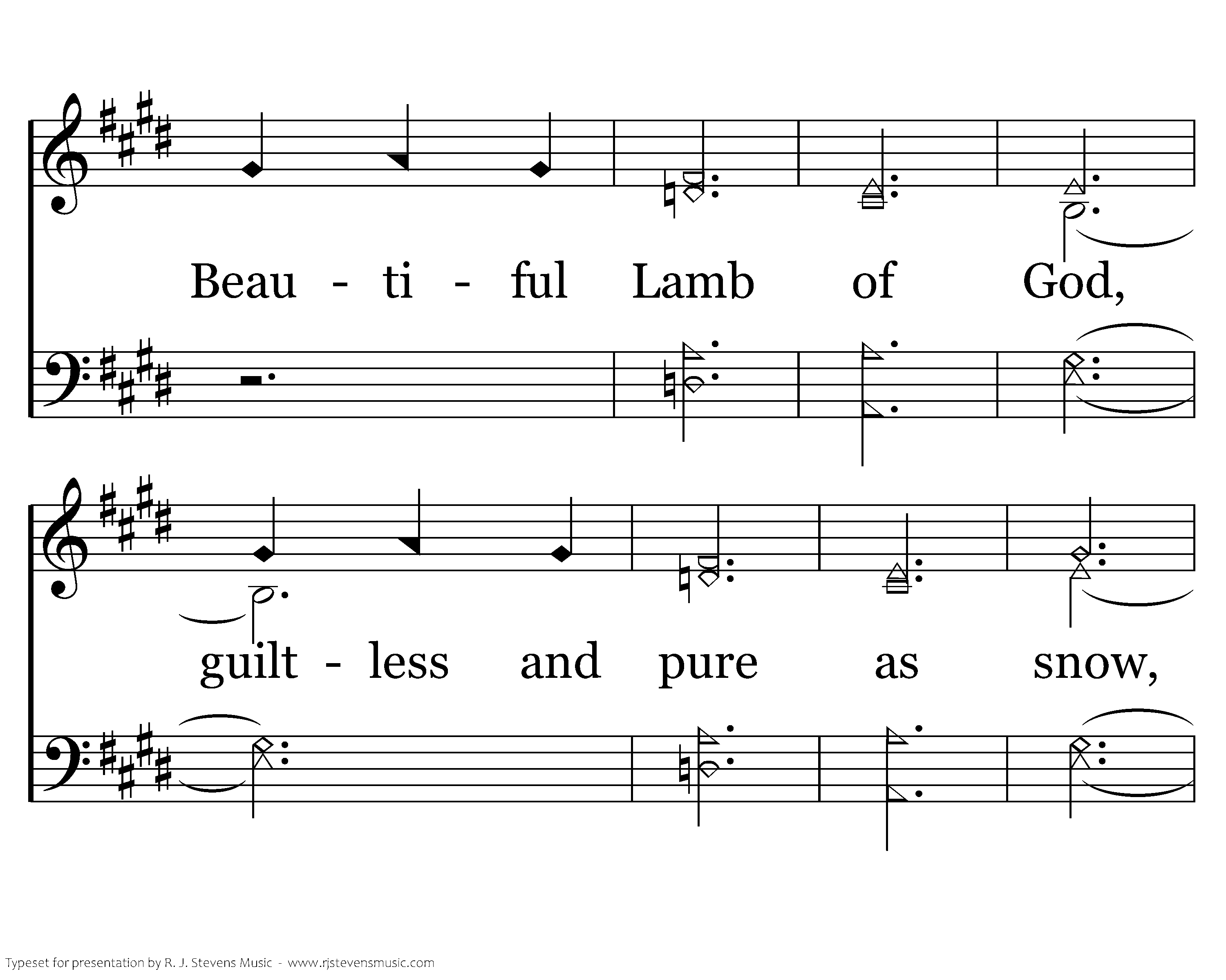 Beautiful Lamb of God, guiltless and pure as snow, Gentle and merciful, beautiful Lamb of God. Behold the Lamb of God Suff'ring great pain for us, And by His wounds we all are healed.