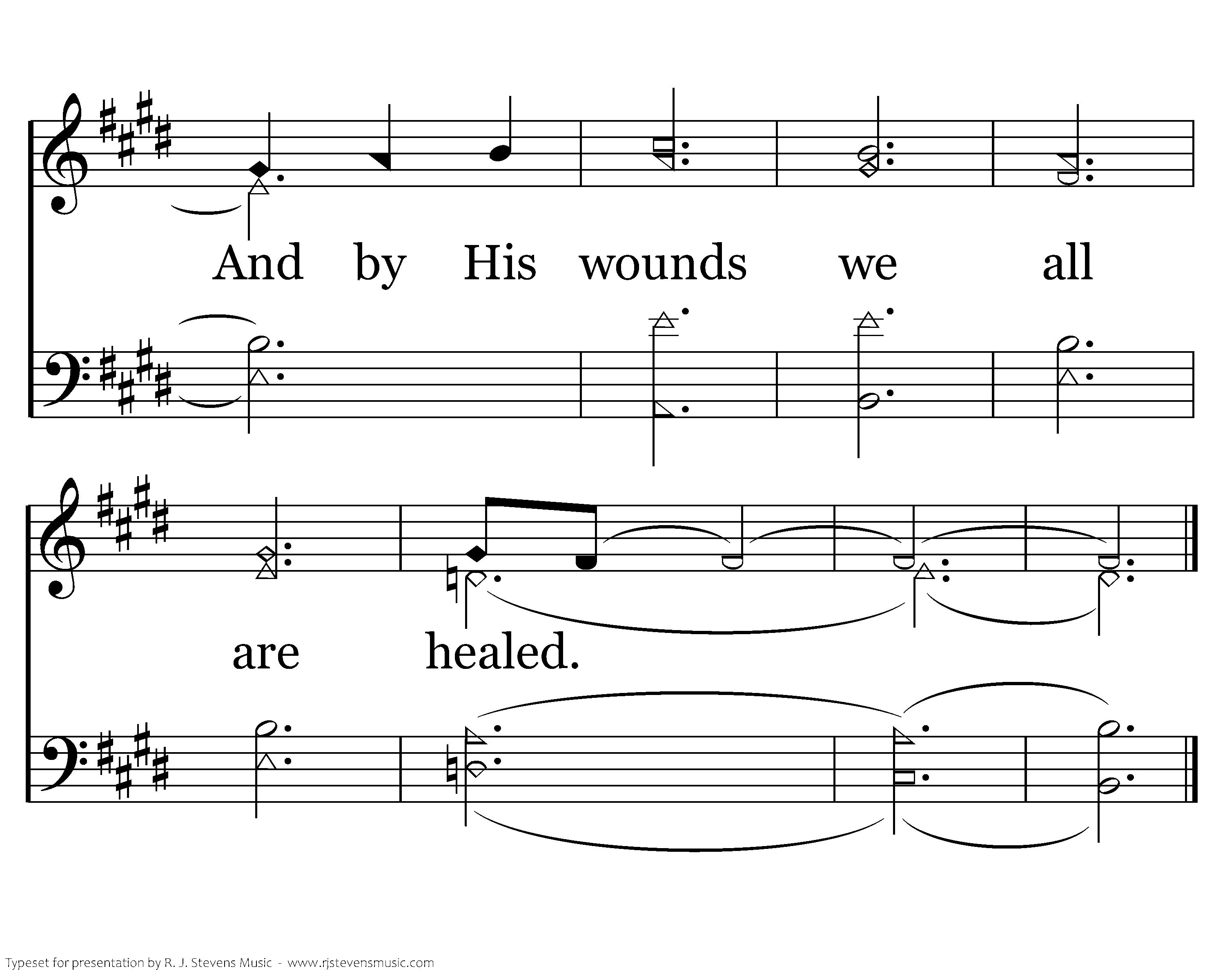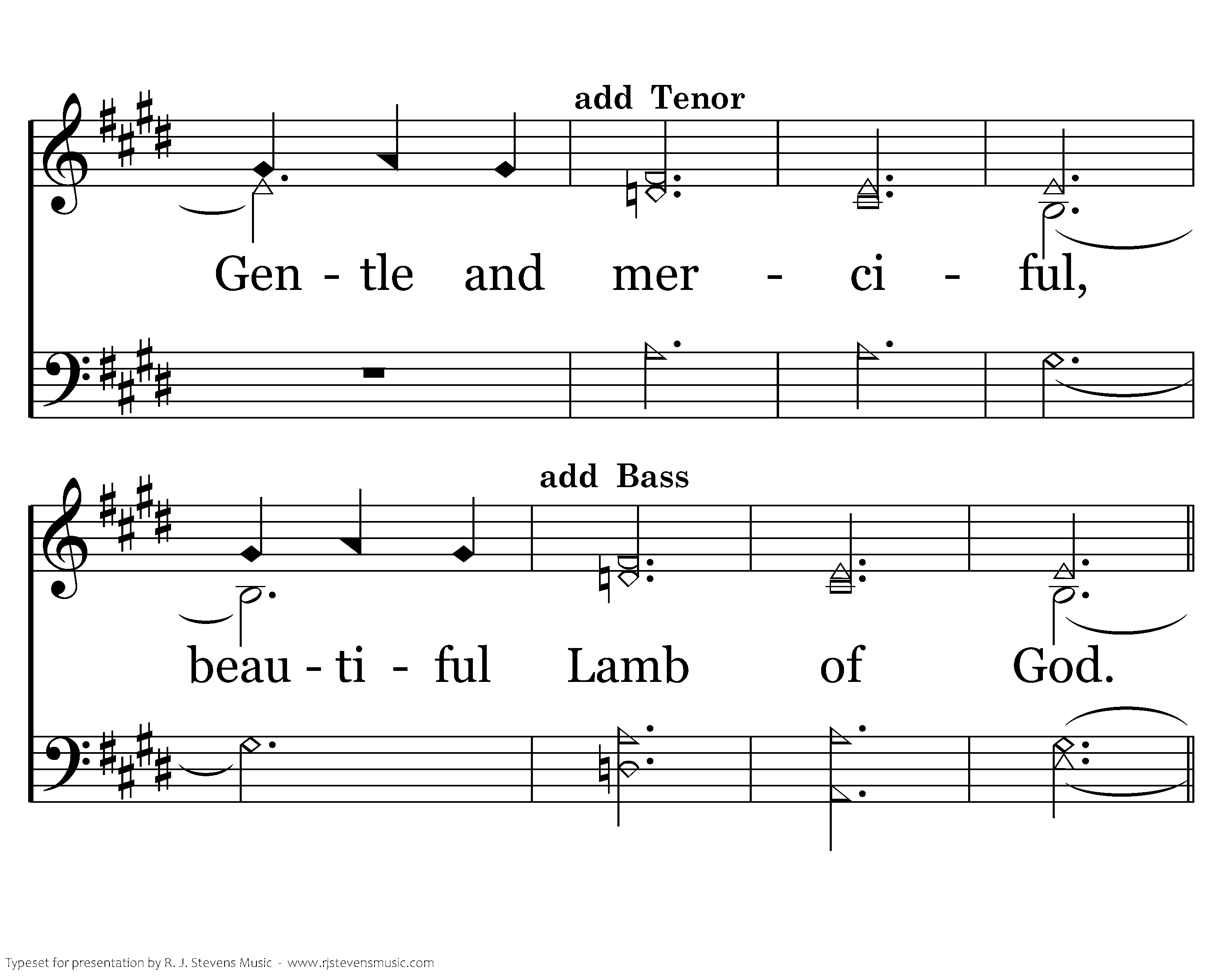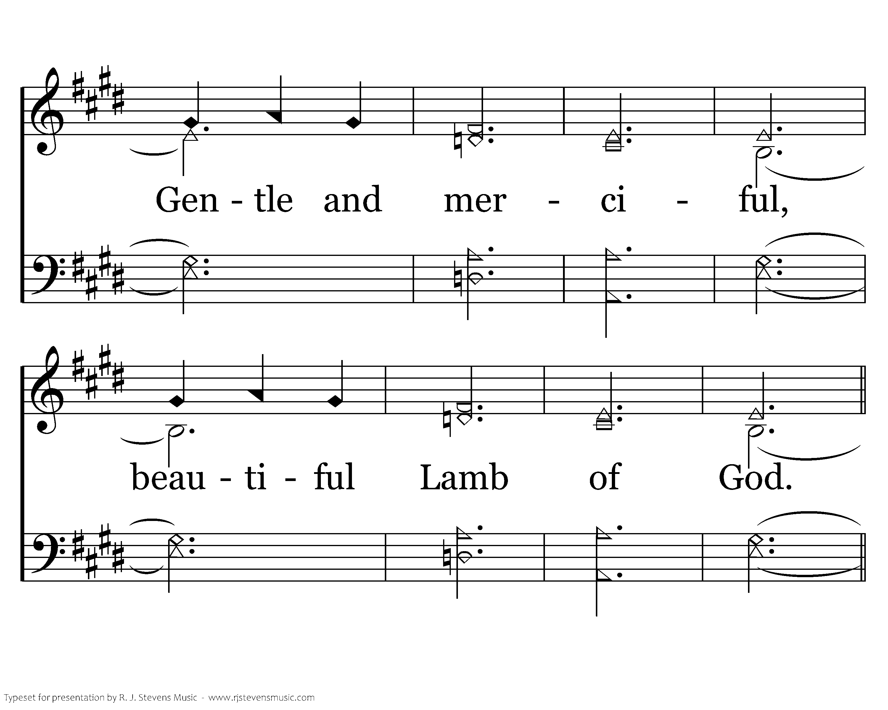 Beautiful Lamb of God, guiltless and pure as snow, Gentle and merciful, beautiful Lamb of God. Behold the Lamb of God Suff'ring great pain for us, And by His wounds we all are healed.