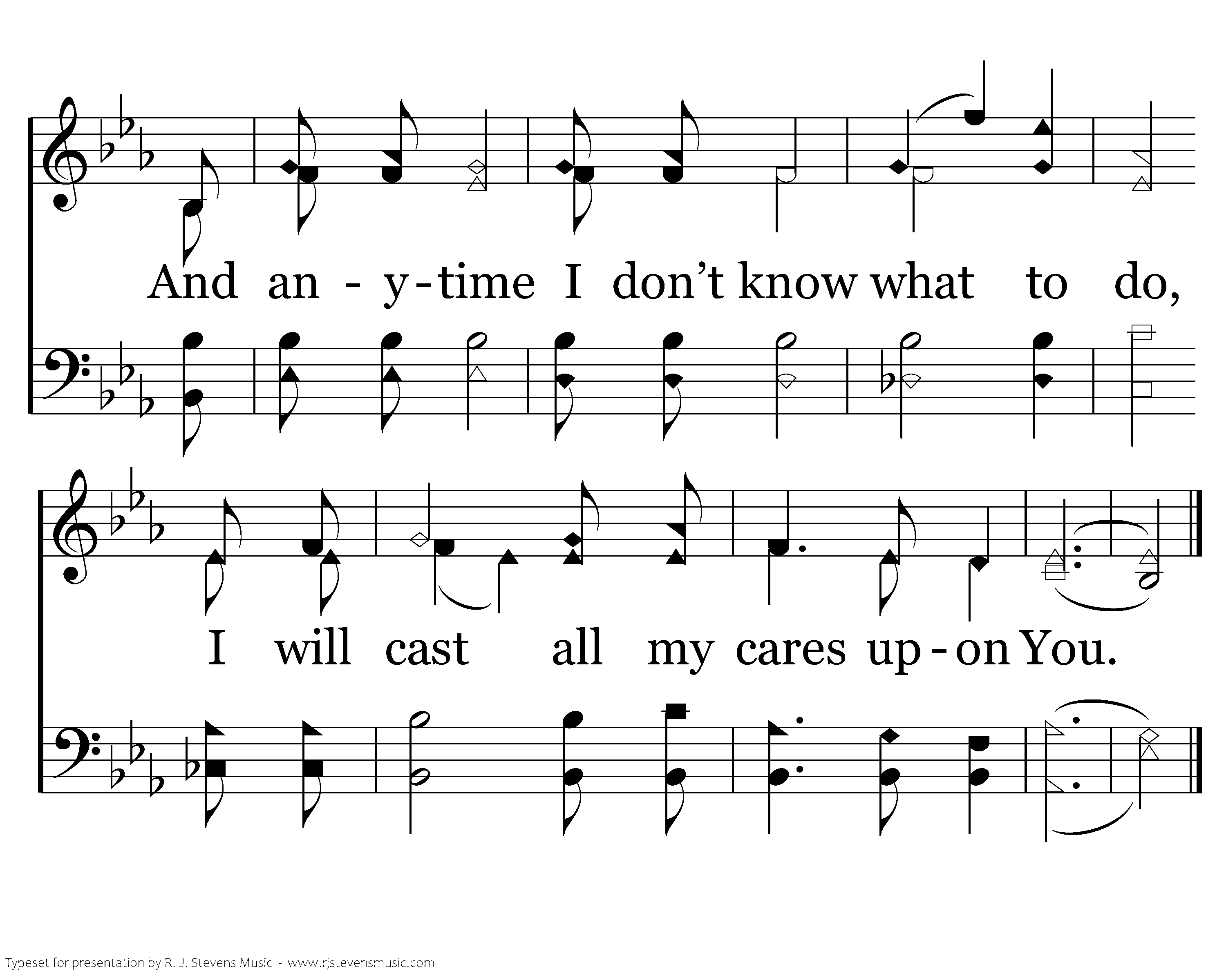 Cast my cares upon You. Lay burdens down at Your feet. Anytime I will cast all my cares upon You. I cast all my cares upon You. I lay all of my burdens down at Your feet. And anytime I don’t know what to do, I will cast all my cares upon You.
