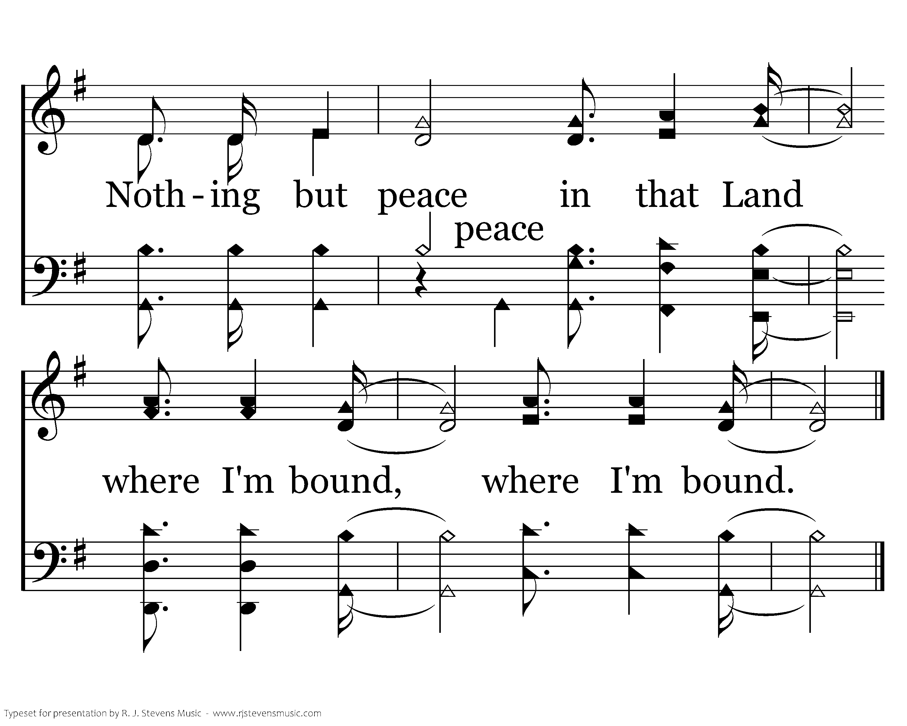Nothing but peace in that Land. Nothing but peace in that Land. Nothing but peace in that Land where I'm bound, where I'm bound. in that Land where I'm bound, where I'm bound.