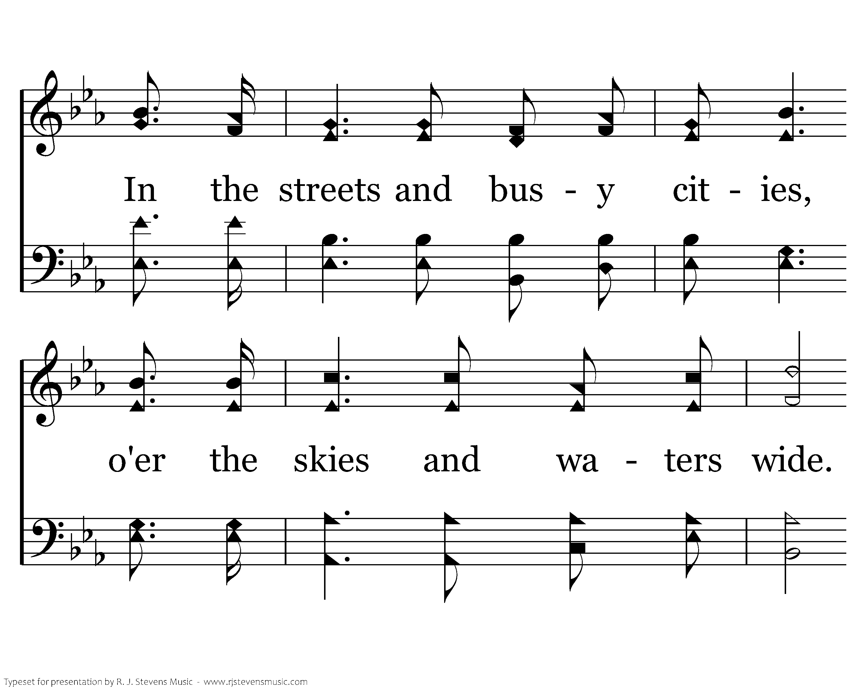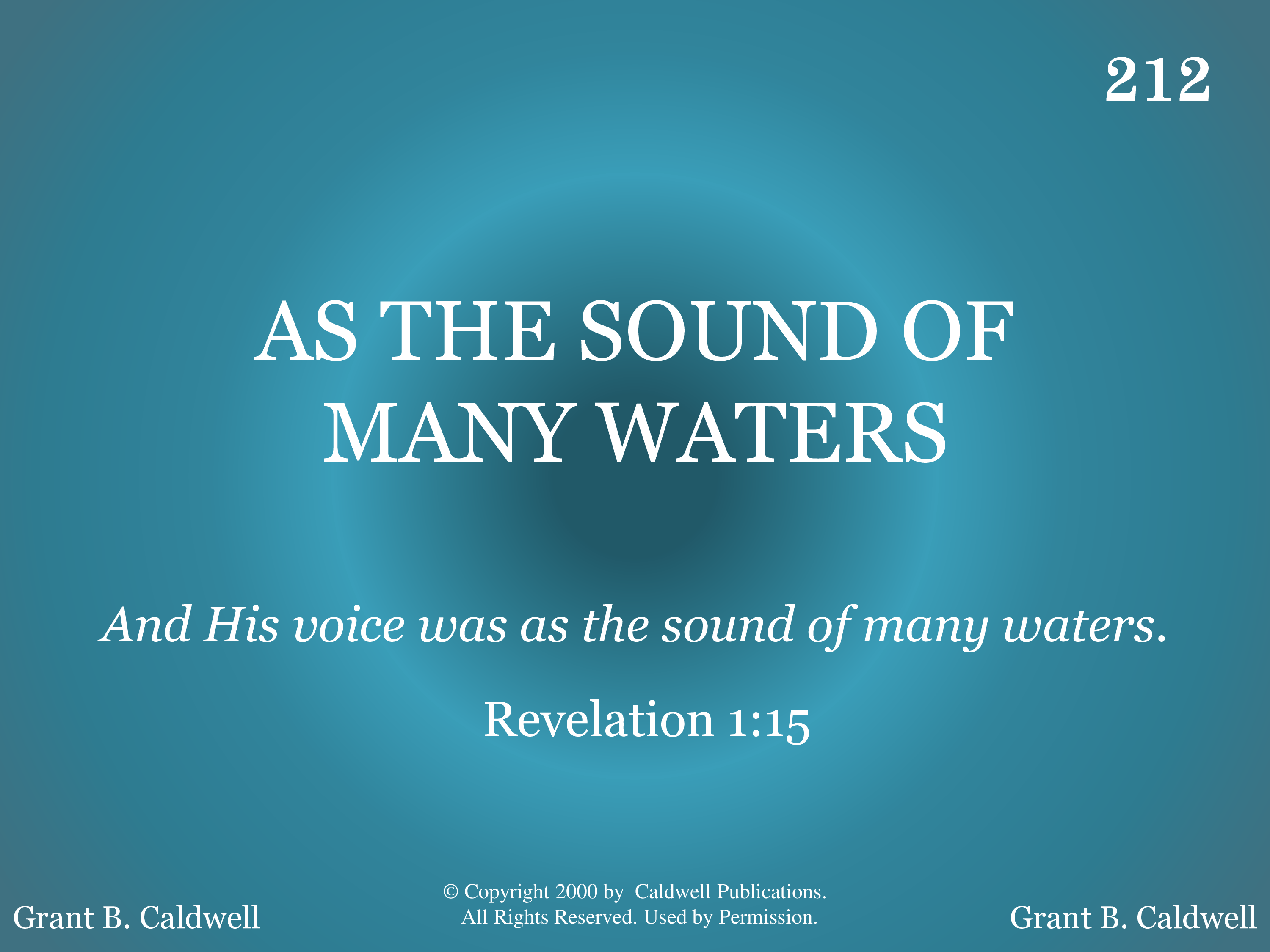 As the sound of many waters, so Your word, O God, is heard. Through the hills and forests' shadows, in the cattle and the bird. In the streets and busy cities, o'er the skies and waters wide. Ever in all of creation, it will surely still abide.