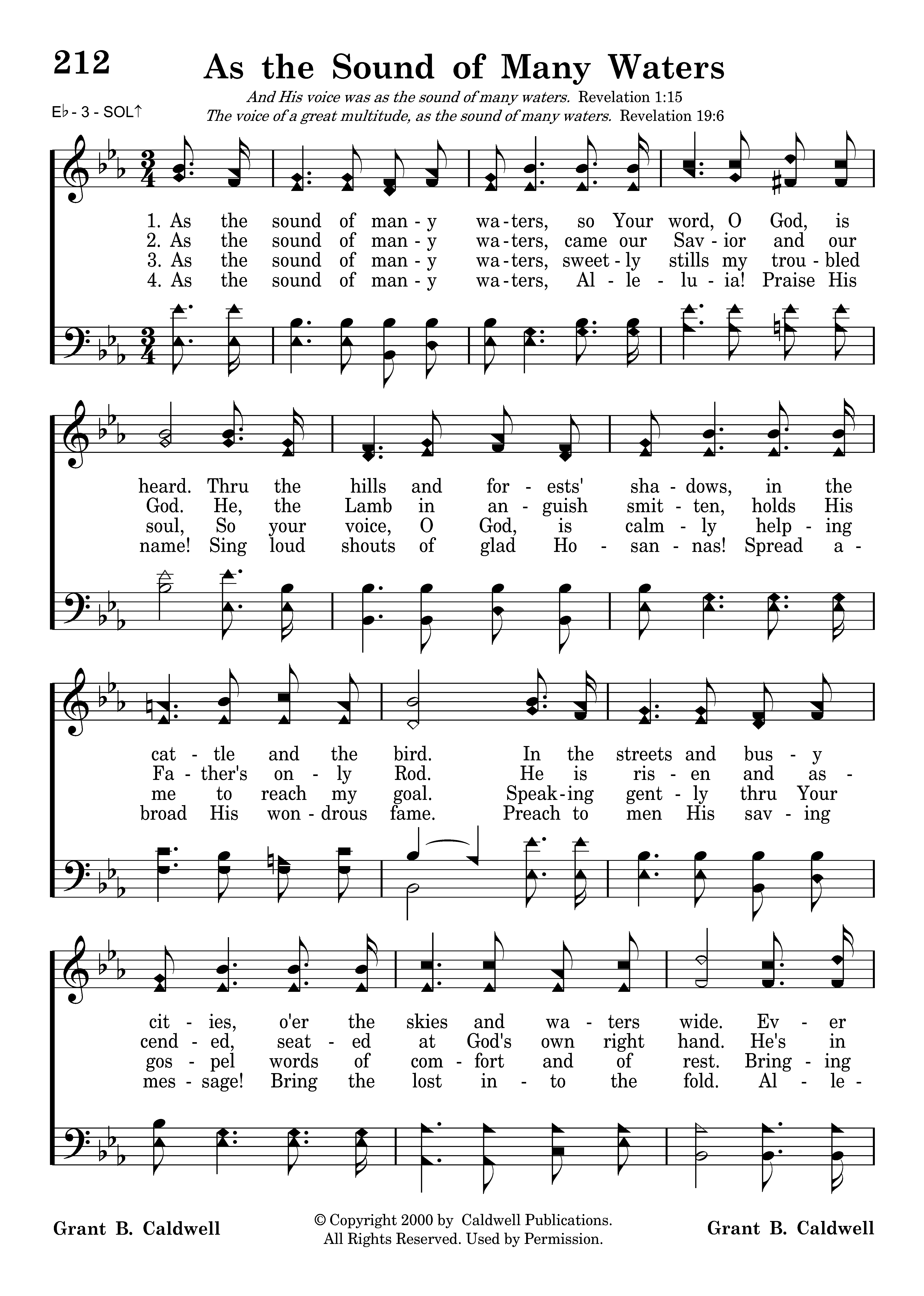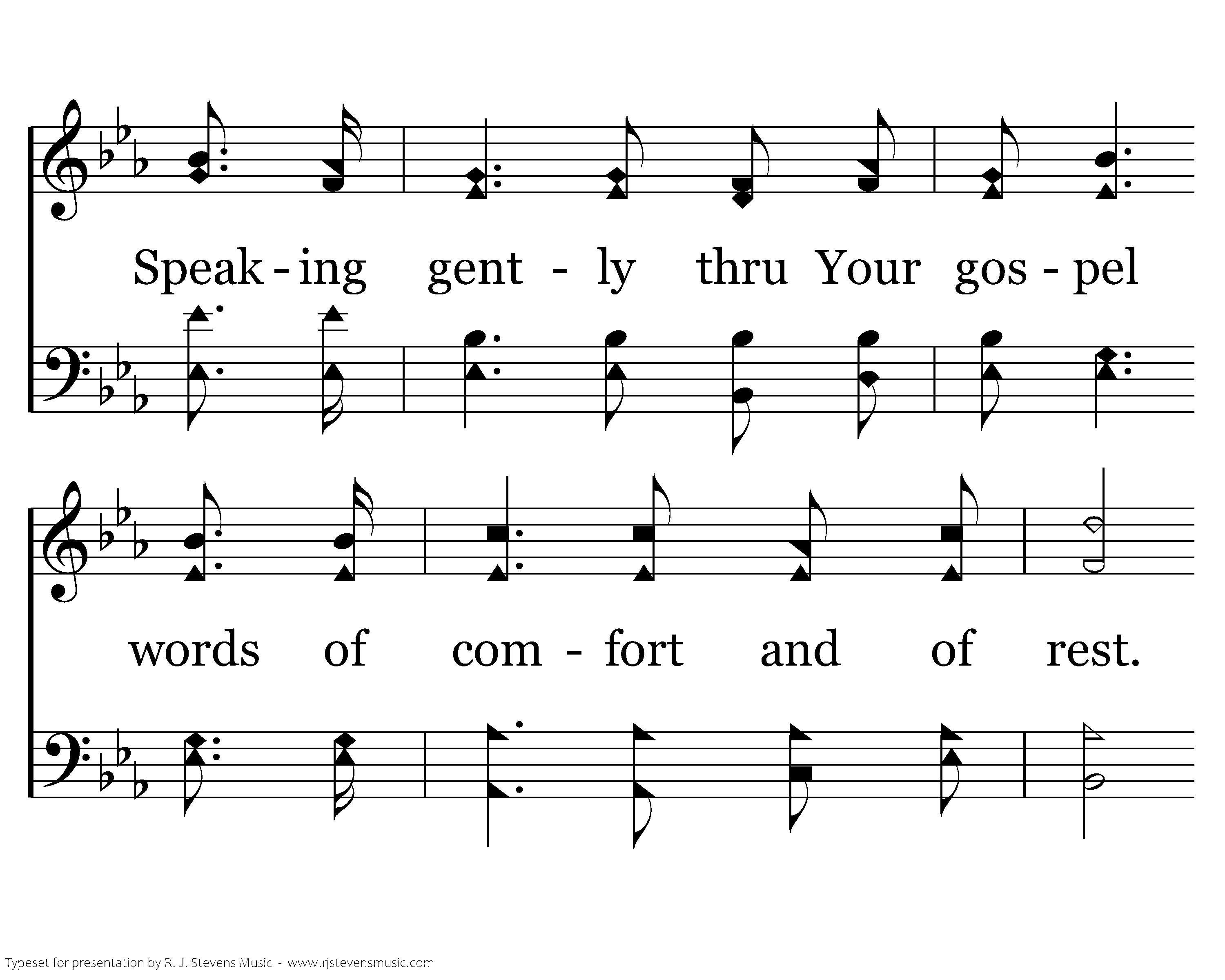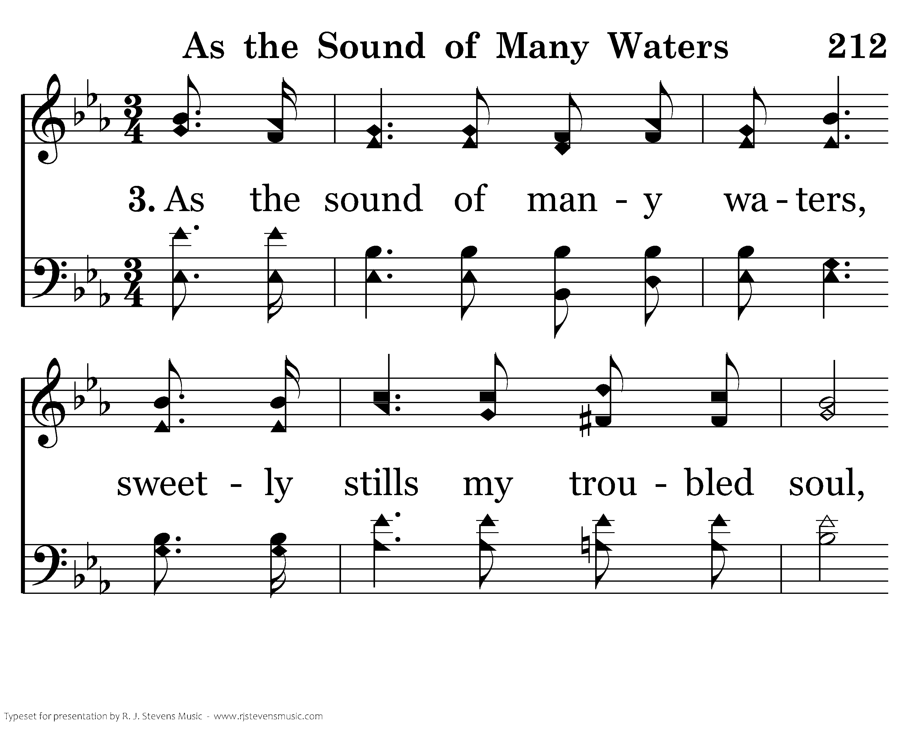As the sound of many waters, sweetly stills my troubled soul, So your voice, O God, is calmly helping me to reach my goal. Speaking gently through Your gospel words of comfort and of rest. Bringing me toward home securely, with my Savior and the blest.