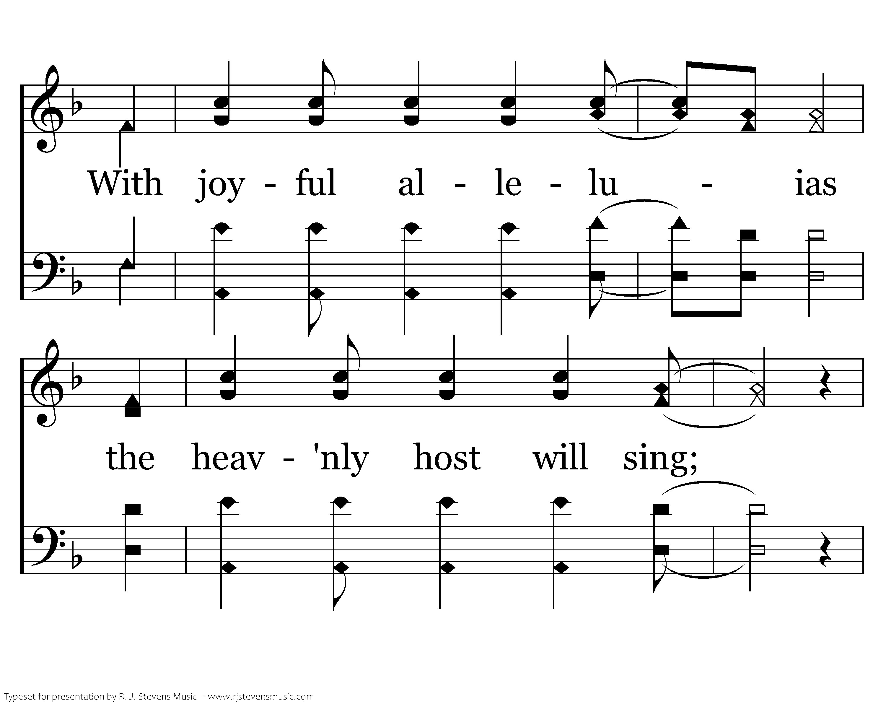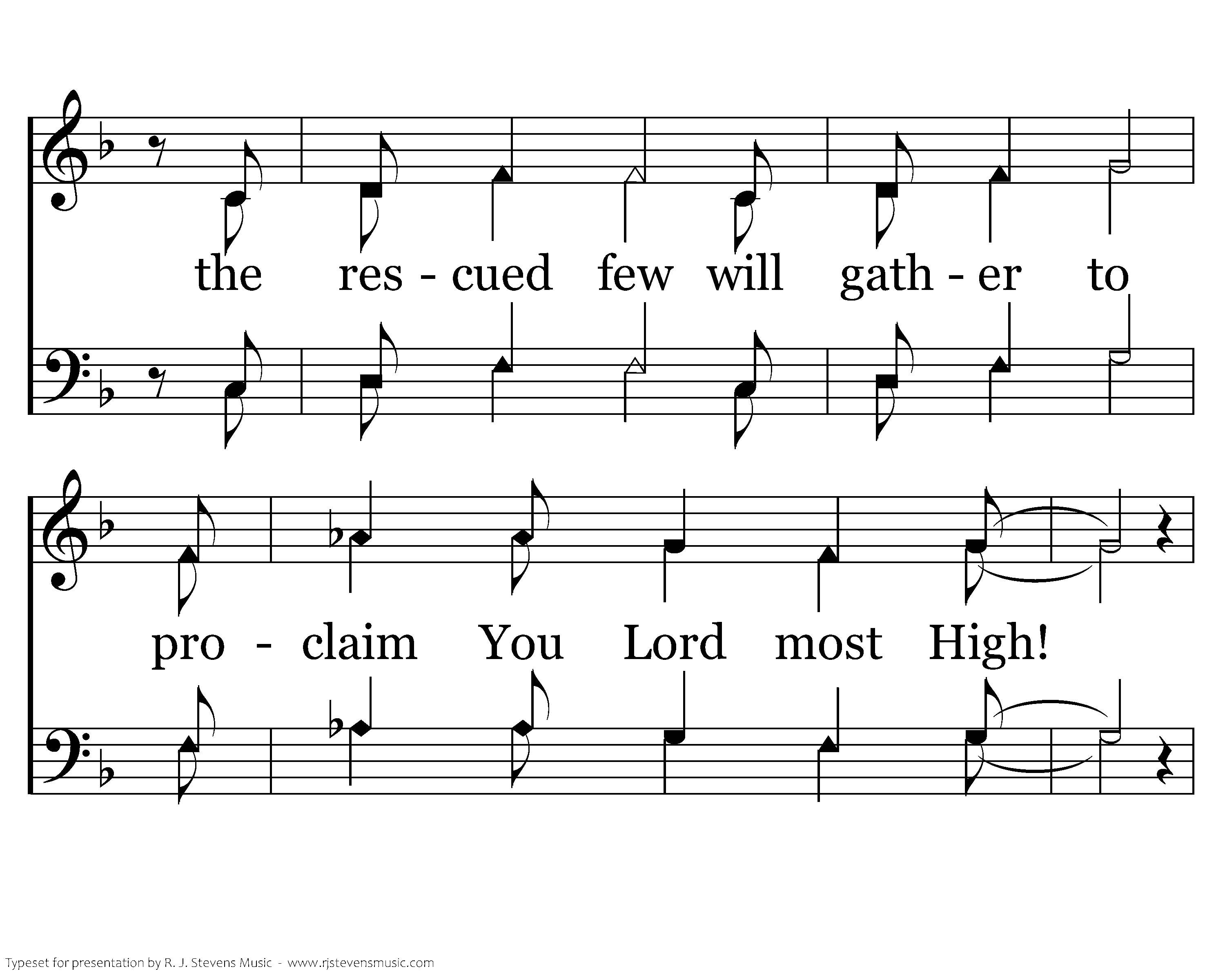 How excellent is Thy name, O Lord, how excellent is Thy name. Heaven and earth together proclaim how excellent is Thy name! How excellent is Thy name! One fine day when the trumpets play and the dead in Christ will rise the rescued few will gather to proclaim You Lord most High! With joyful alleluias the heav-'nly host will sing; ev'ry knee shall bow and tongue tell out: You are the King of kings!