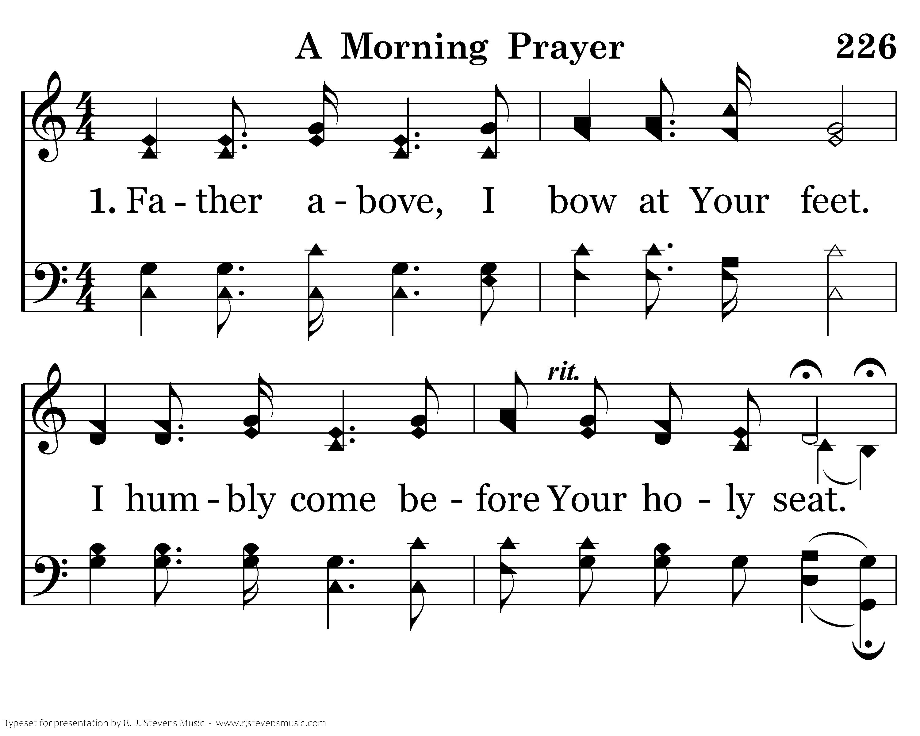 Fa-ther above, I bow at Your feet. I humbly come before Your holy seat. Gracious, O God, and great is Your fame. As day begins, I honor Your name.