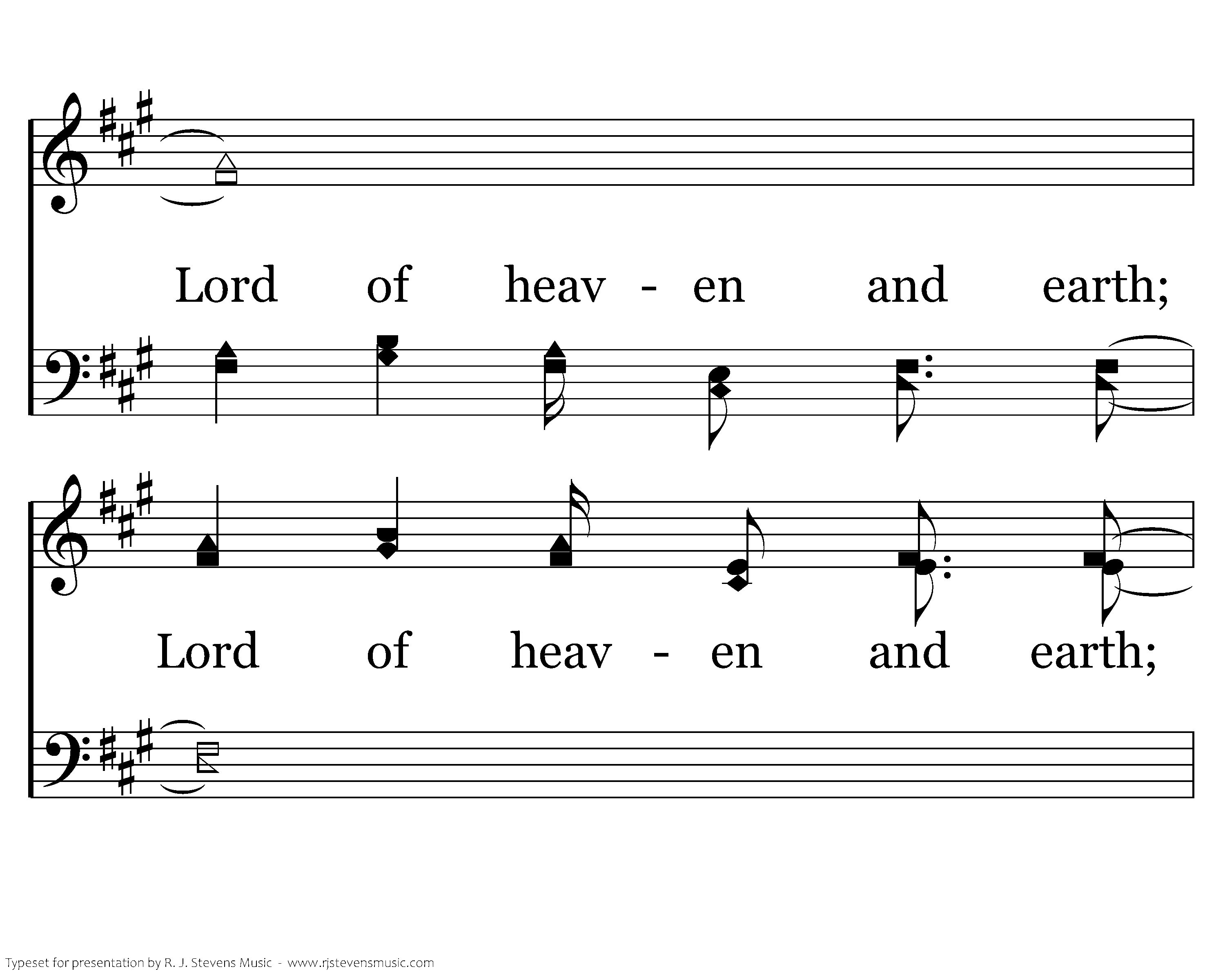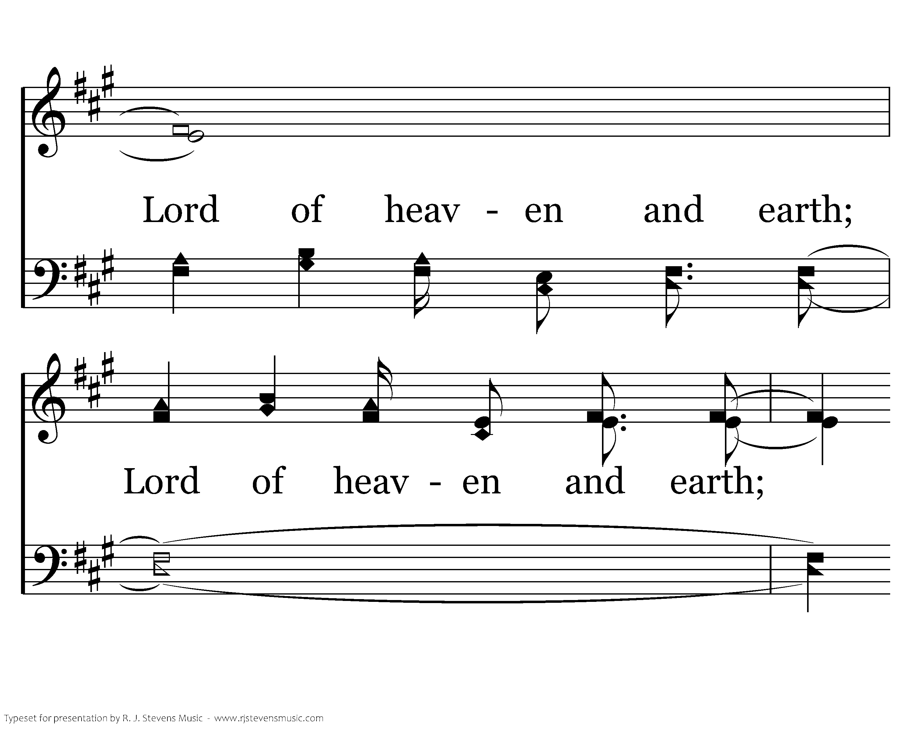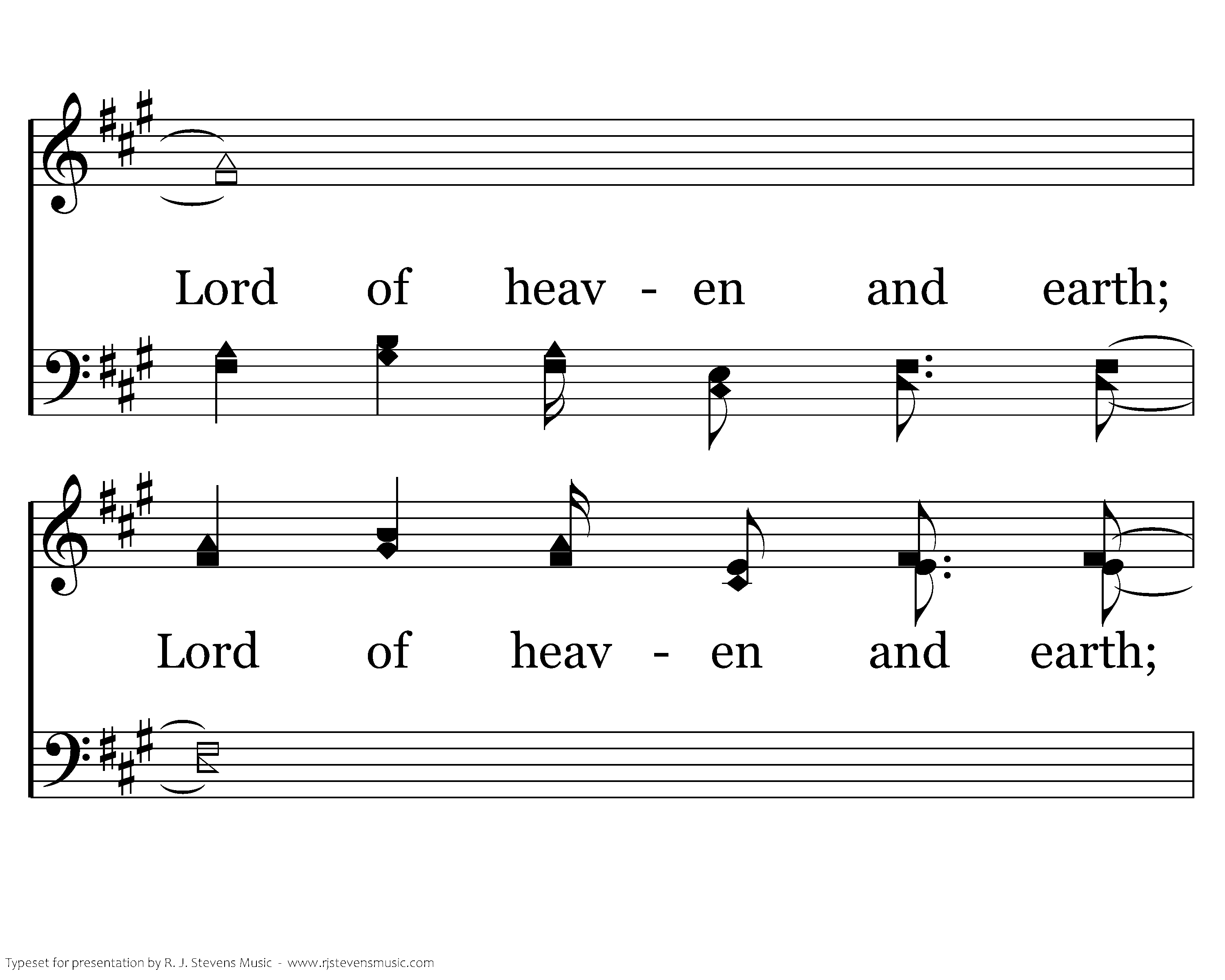Lord of all creation, of water, earth and sky; the heavens are Your tabernacle. Glory to the Lord on high. God of wonders beyond our galaxy: You are holy, holy. The universe declares Your majesty. You are holy, holy. Lord of heaven and earth; Lord of heaven and earth; Lord of heaven and earth; Lord of heaven and earth; Lord of heaven and earth; Hallelujah to the Lord of heaven and earth, Hallelujah to the Lord of heaven and earth! Hallelujah to the Lord of heaven and earth!
