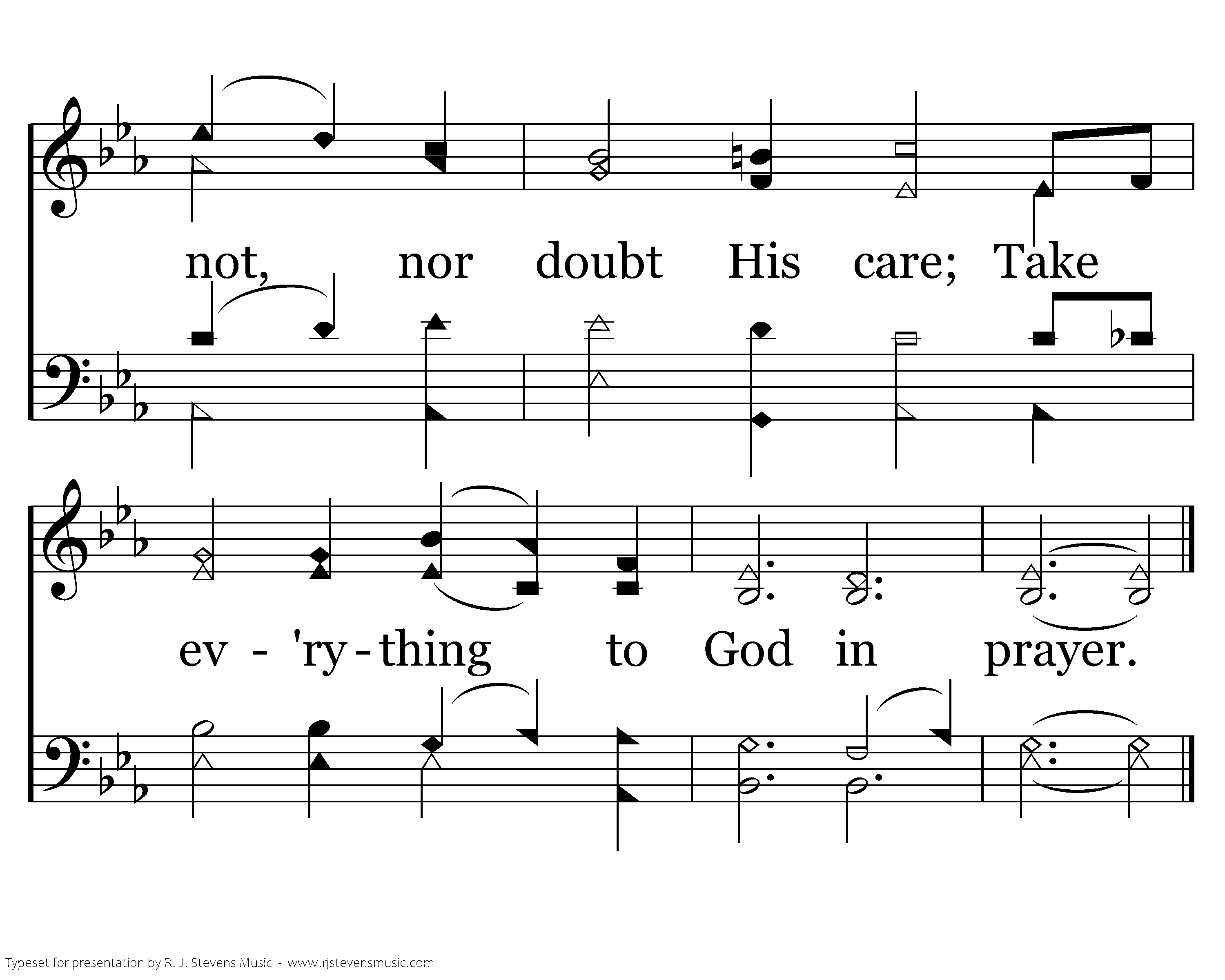 The Lord is at hand. The Lord is at hand. So worry not, nor doubt His care; Take ev'rything to God in prayer.