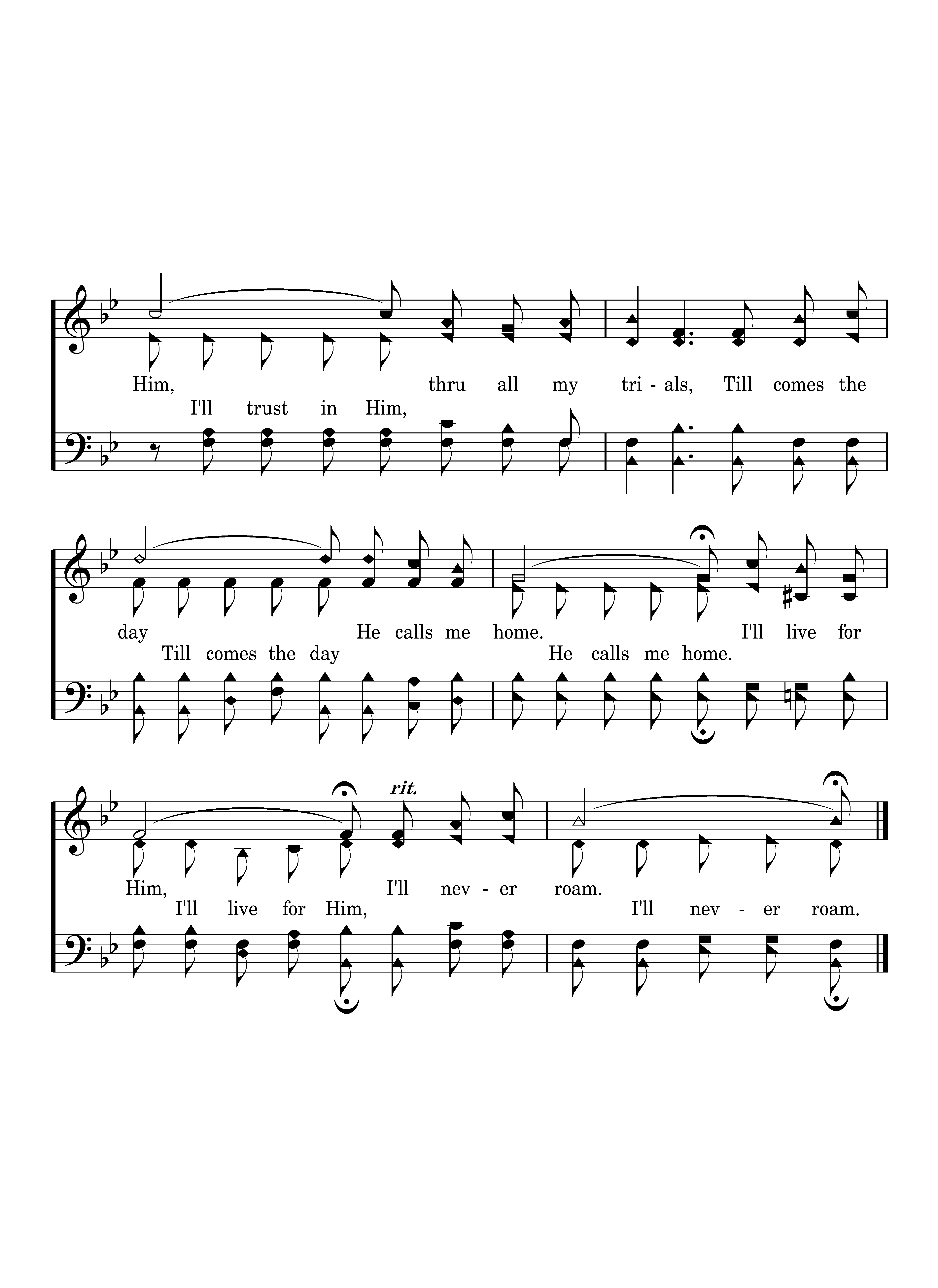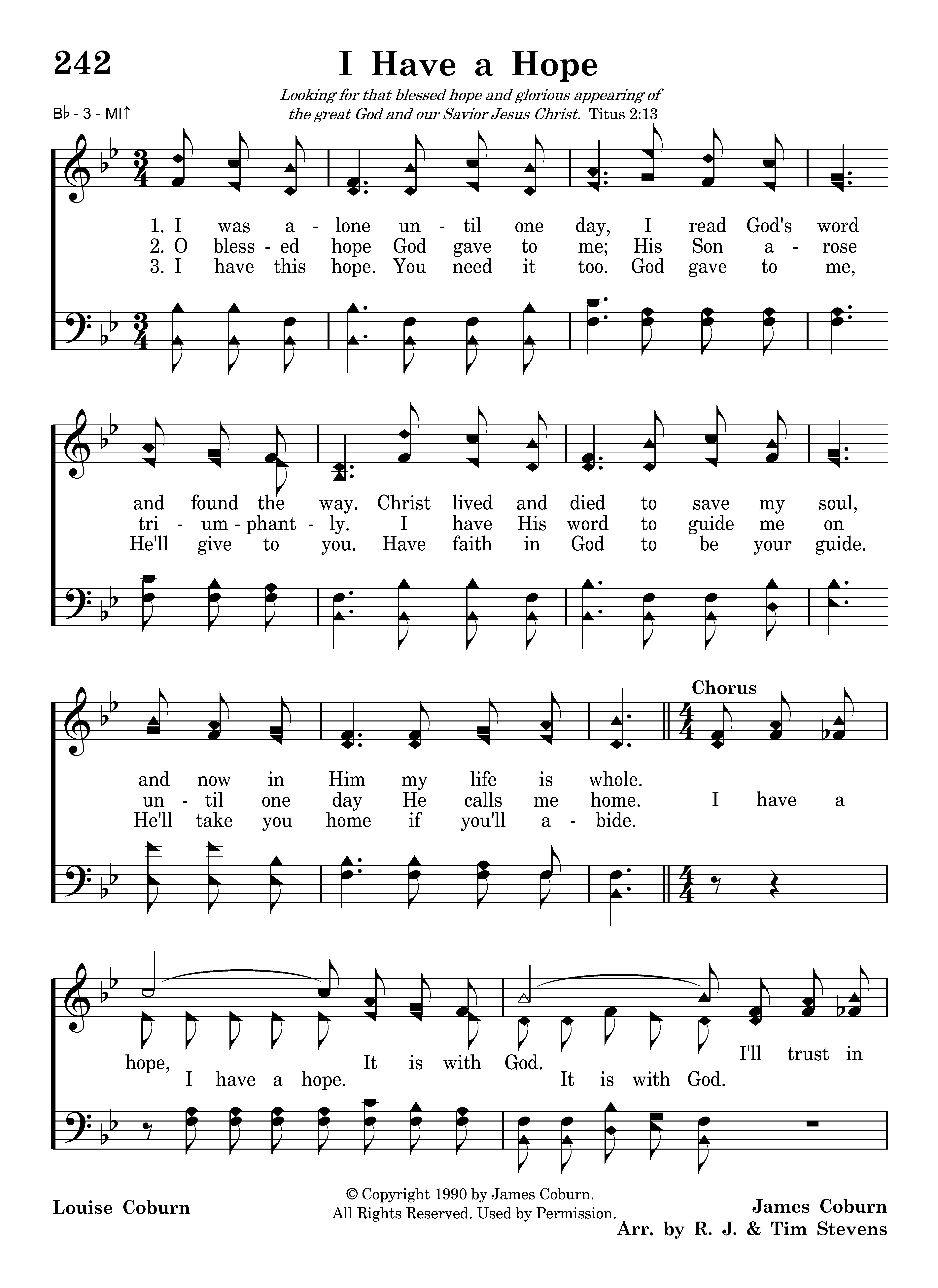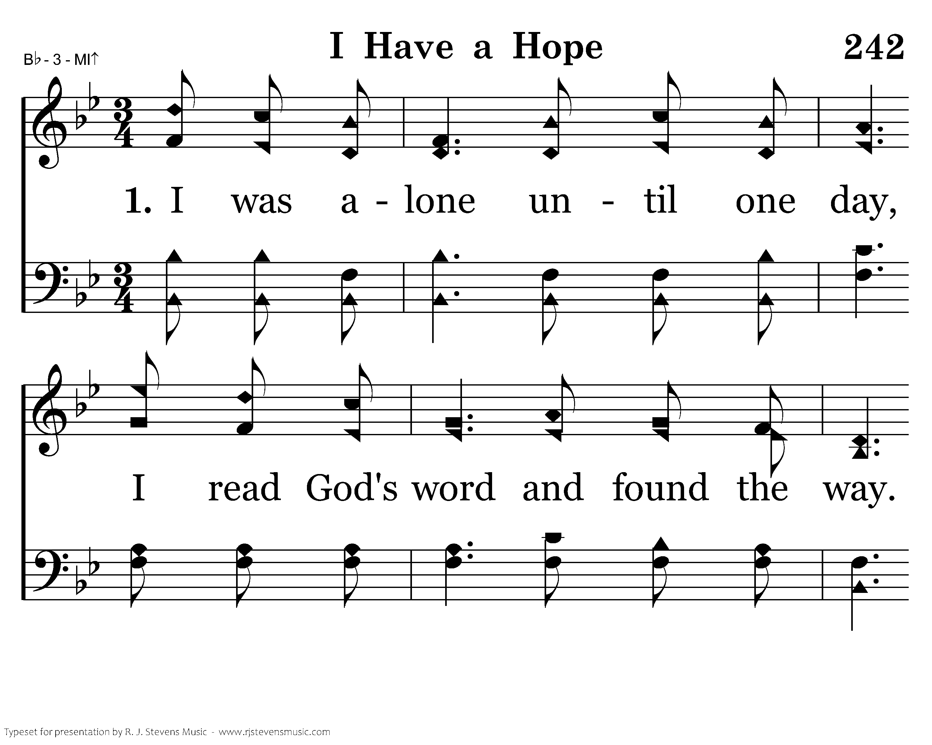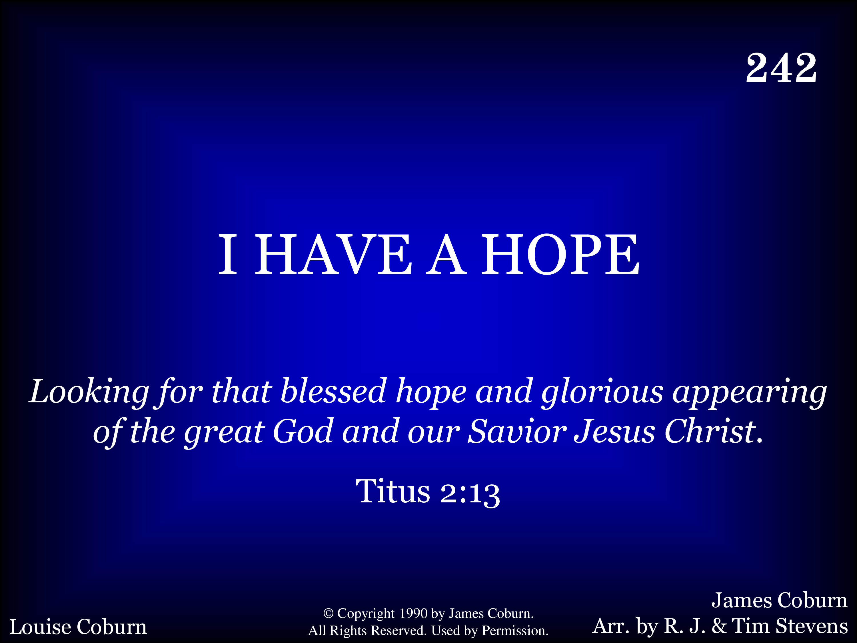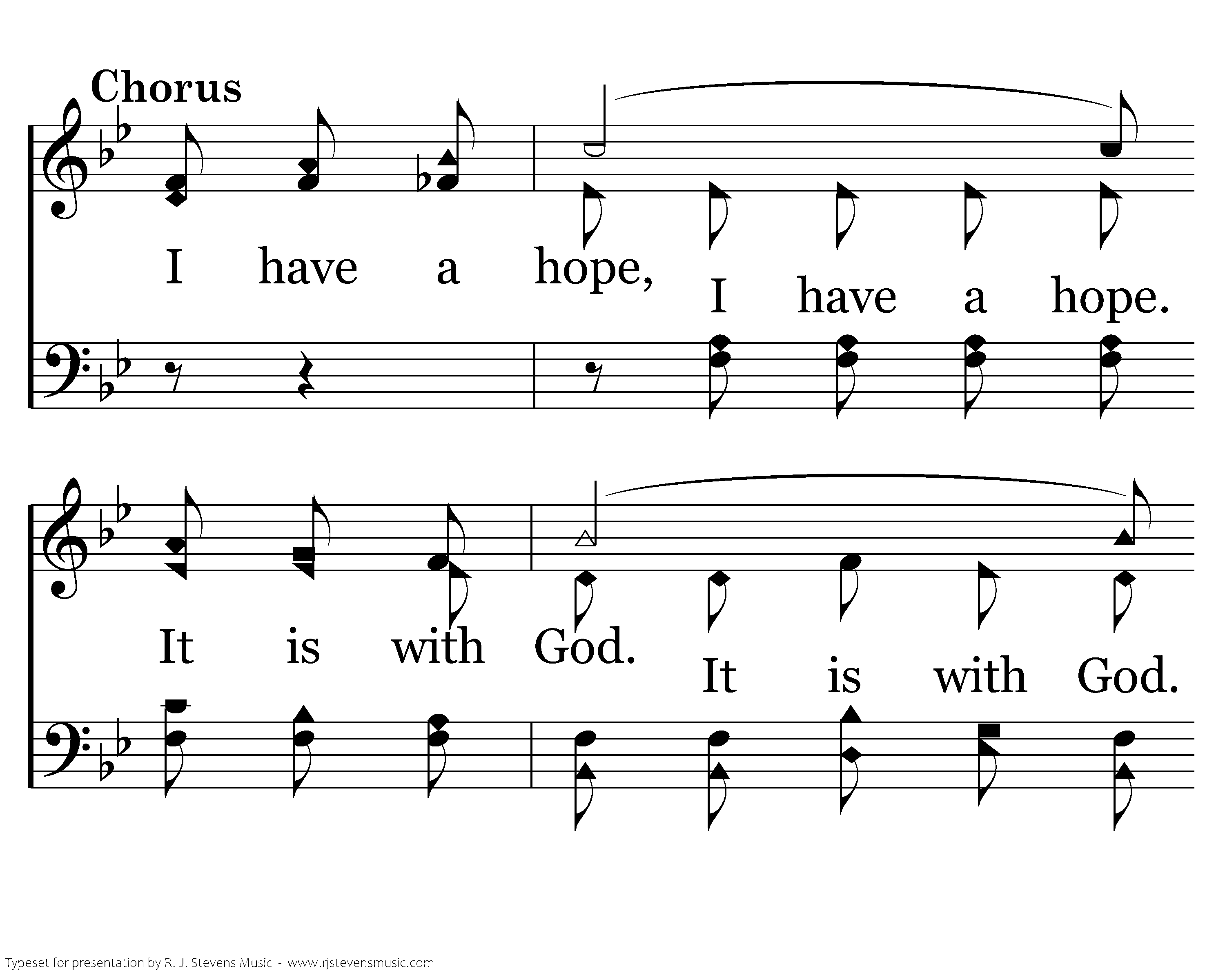 I have a hope, It is with God. I have a hope. It is with God. I'll trust in Him, thru all my trials, Till comes the day He calls me home.
