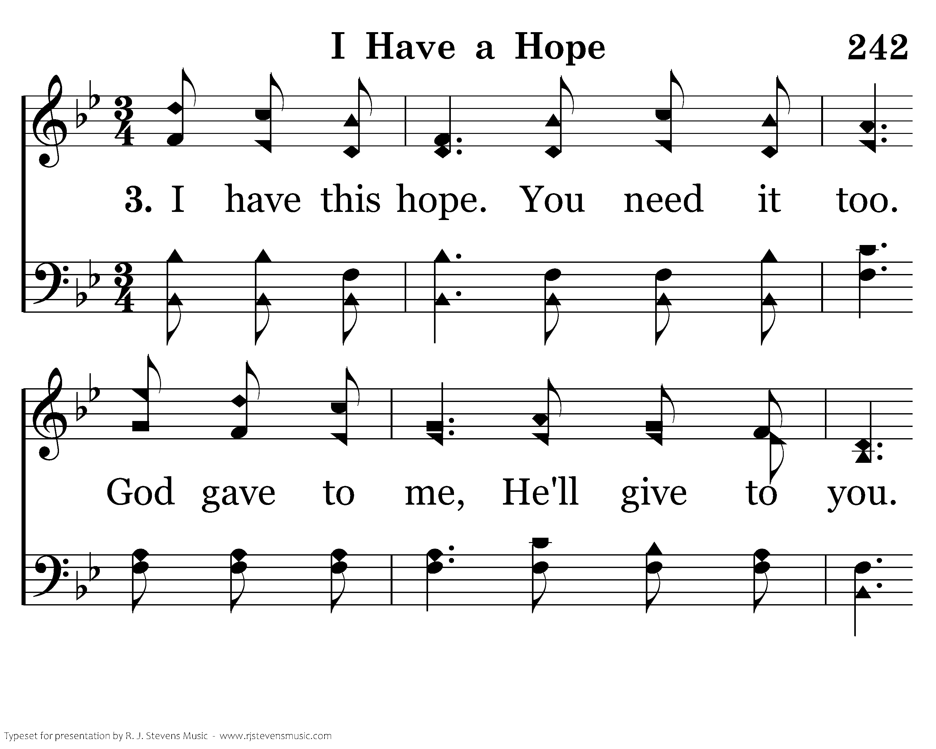I have this hope. You need it too. God gave to me, He'll give to you. Have faith in God to be your guide. He'll take you home if you'll abide.