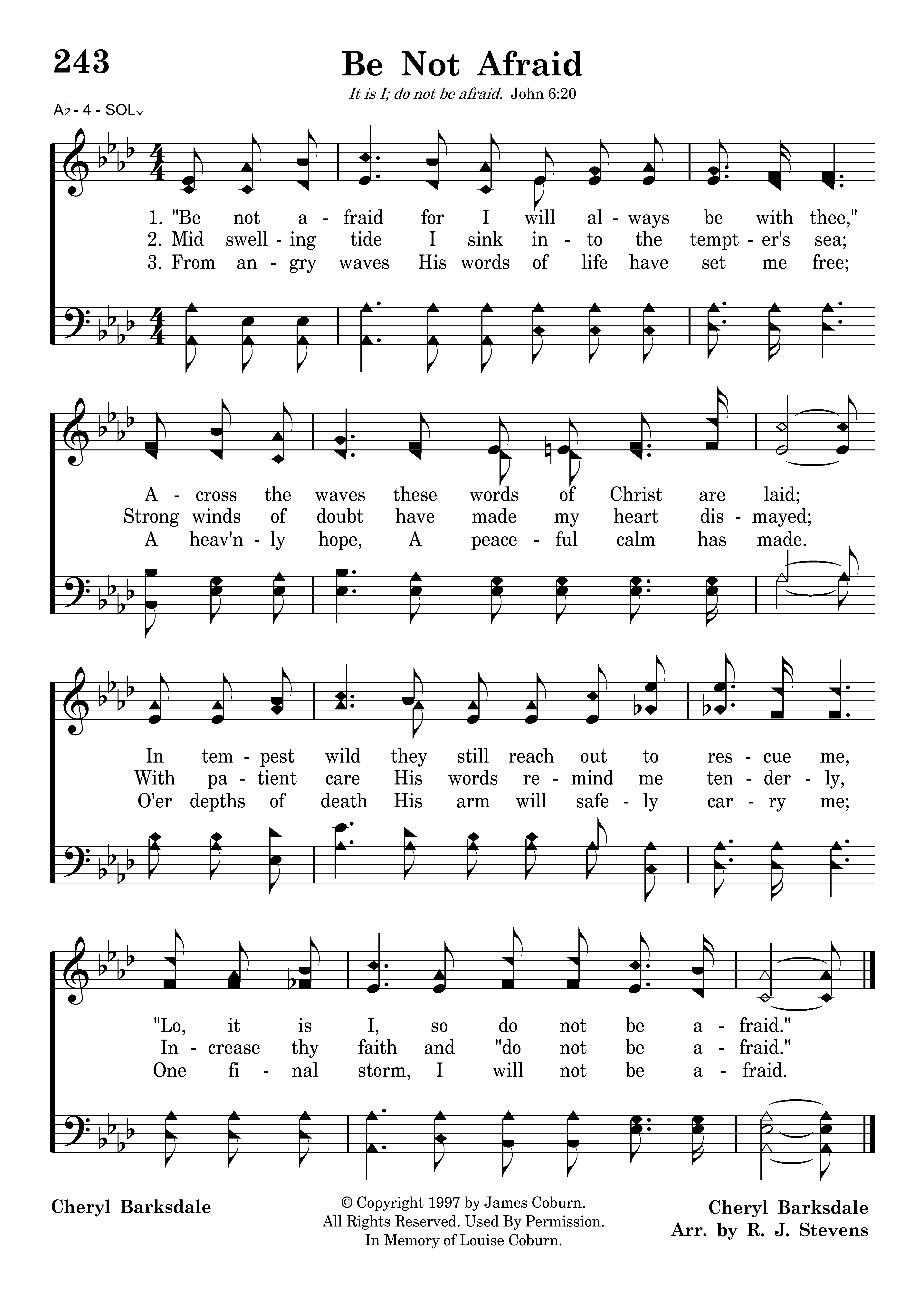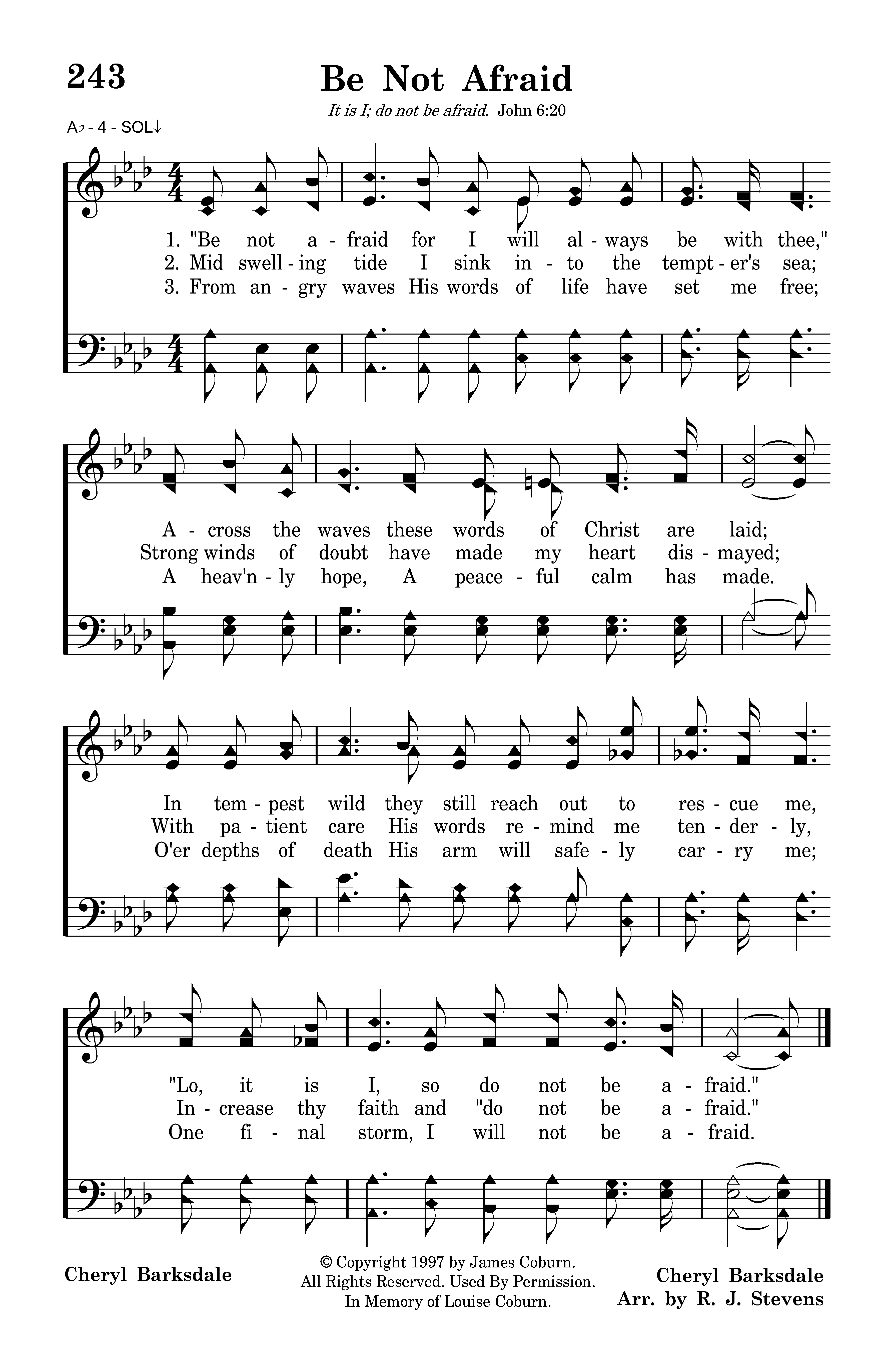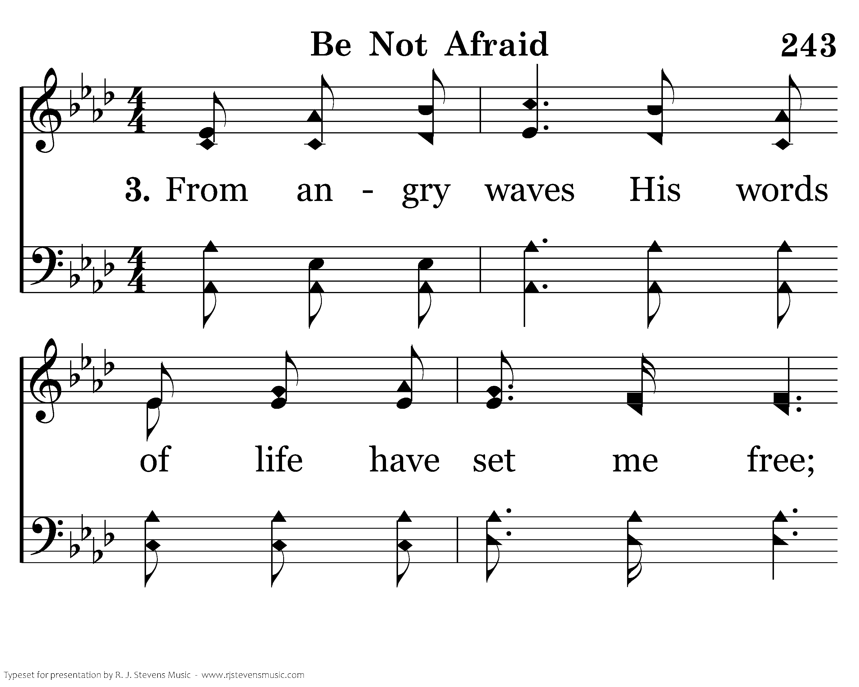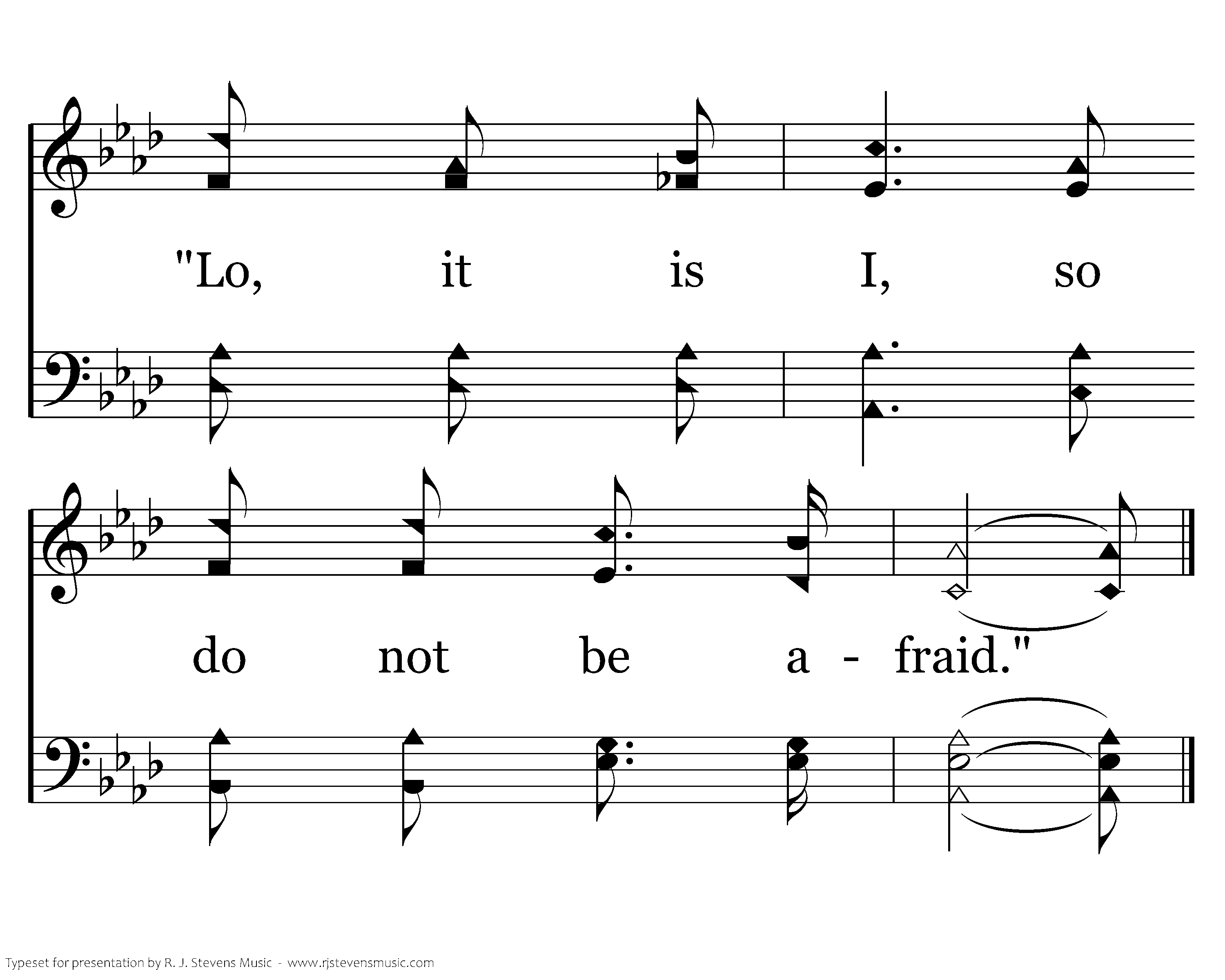 Be not afraid for I will always be with thee, Across the waves these words of Christ are laid; In tempest wild they still reach out to rescue me, "Lo, it is I, so do not be afraid."
