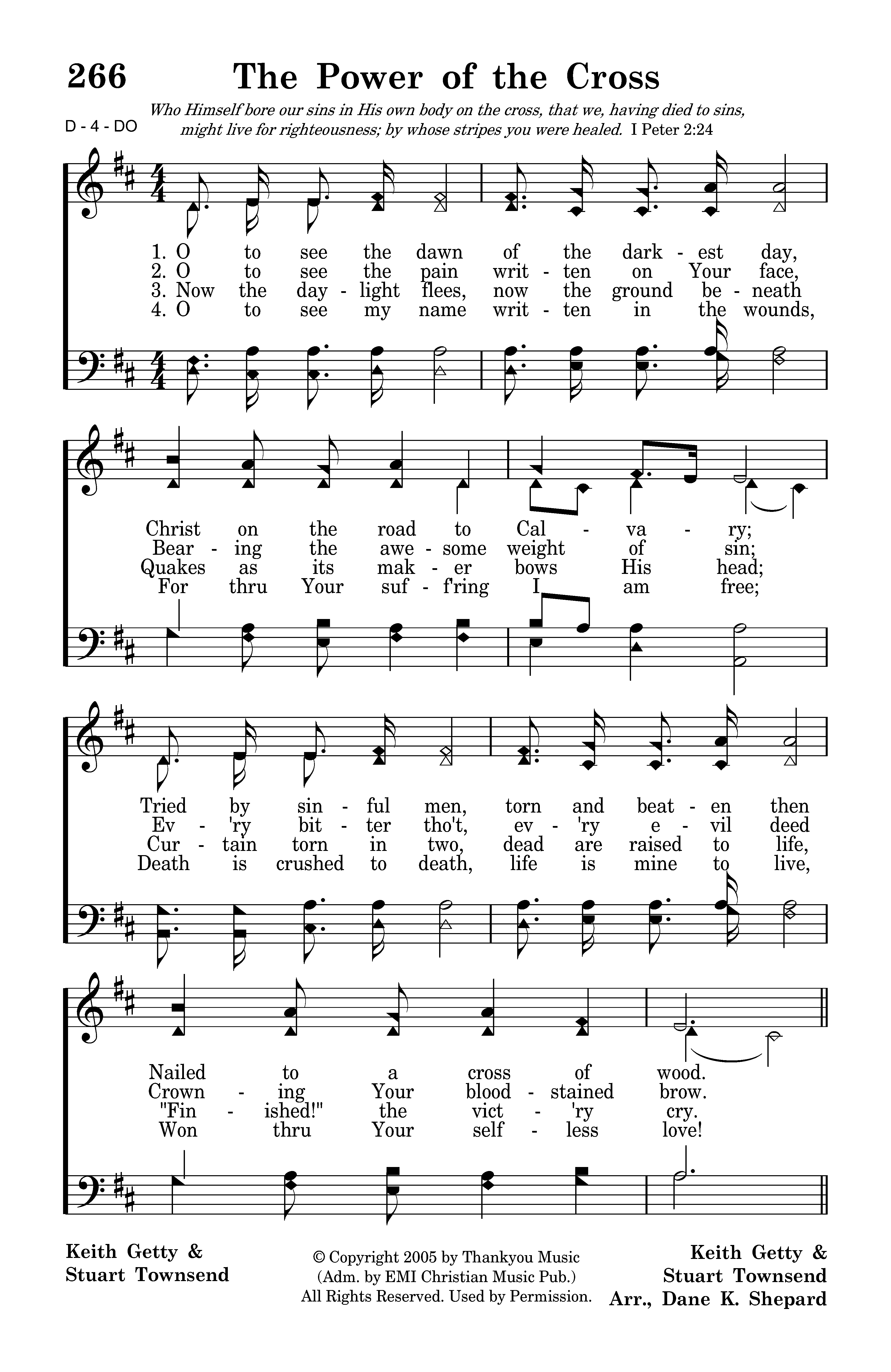 O to see the dawn of the darkest day, Christ on the road to Calvary; Tried by sinful men, torn and beaten then Nailed to a cross of wood. This the pow'r of the cross: Christ became sin for us, Took the blame, bore the wrath; We stand forgiven at the cross.