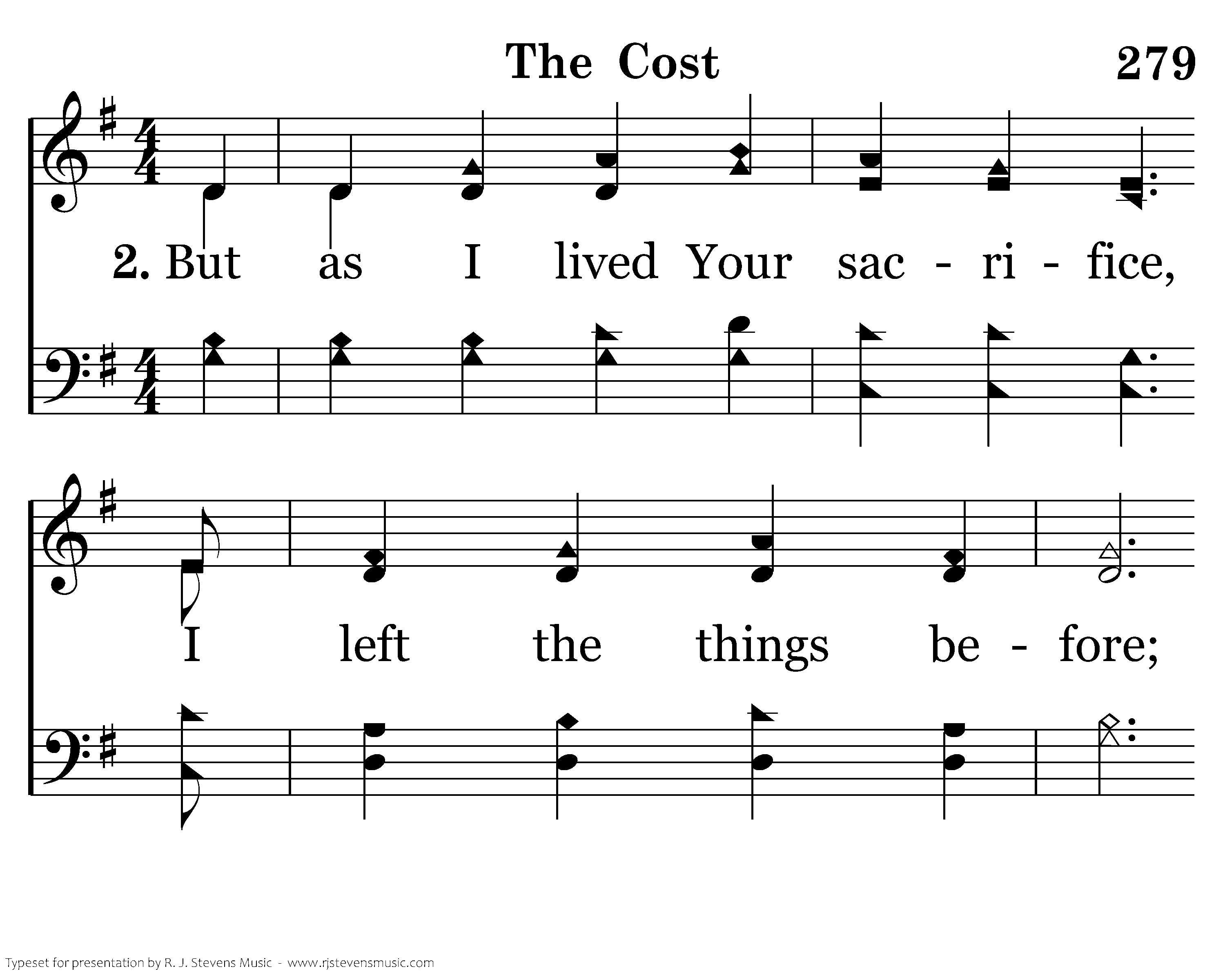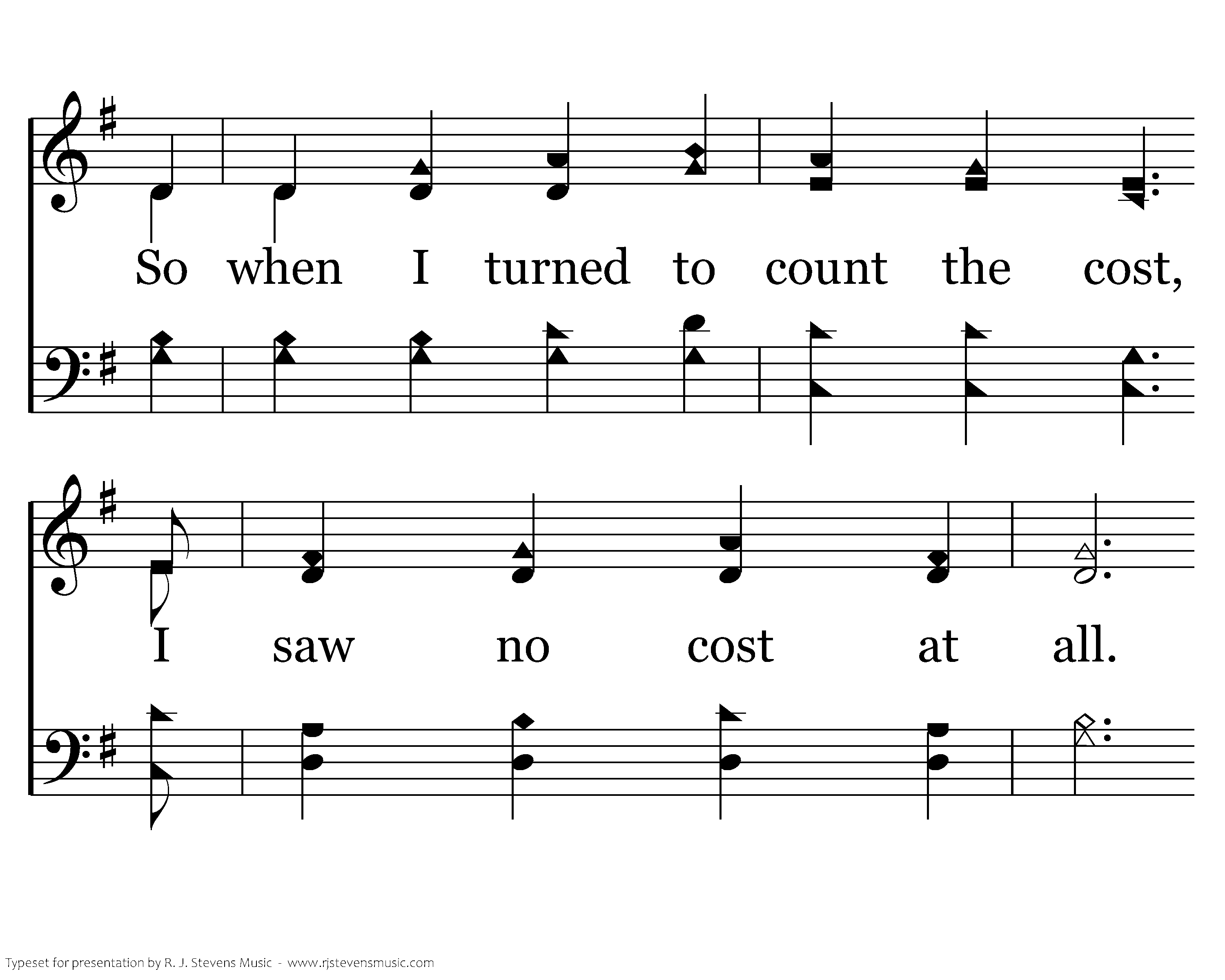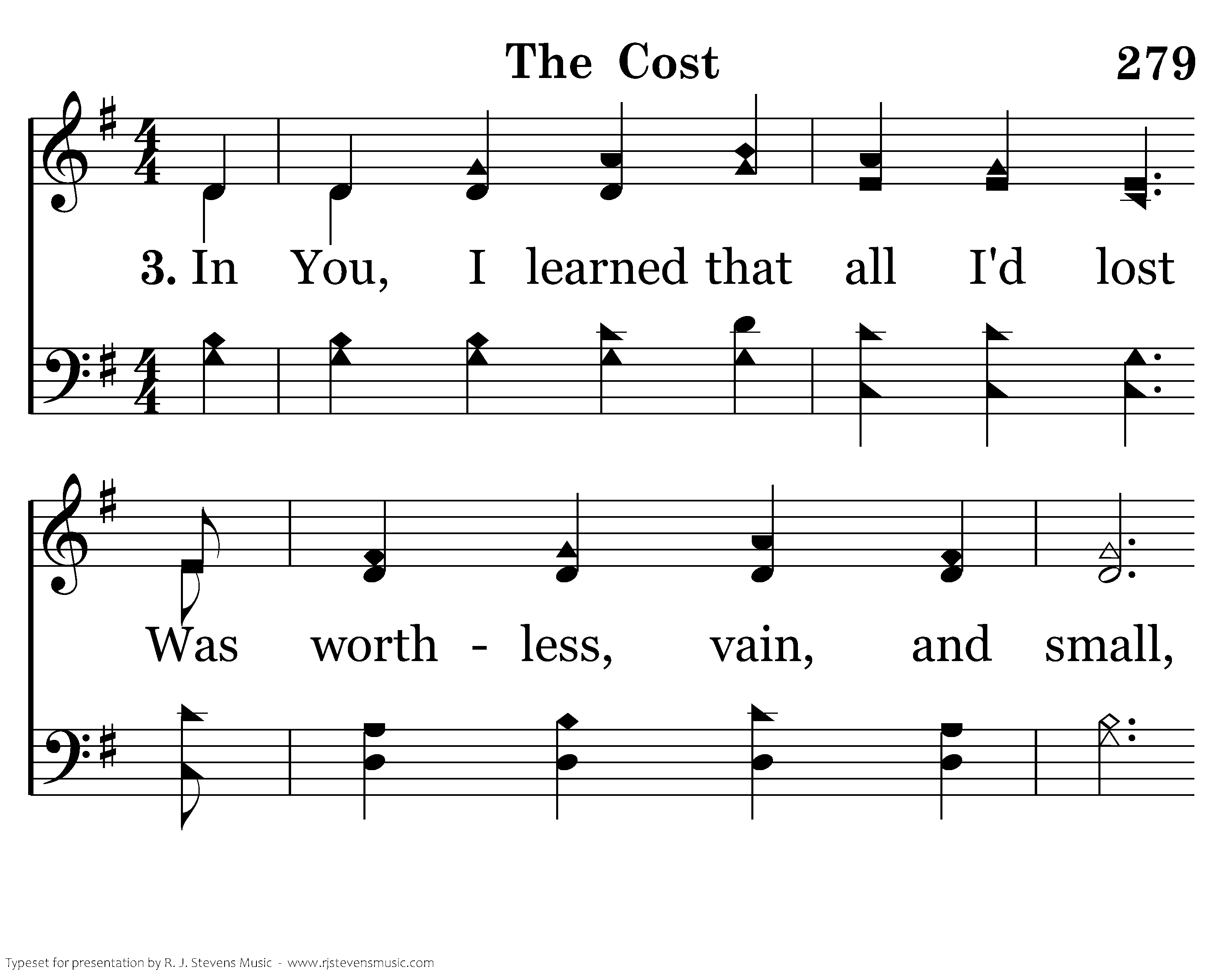 In You, I learned that all I'd lost Was worthless, vain, and small, So when I turned to count the cost, I saw no cost at all. So when I turned, I saw no cost at all.