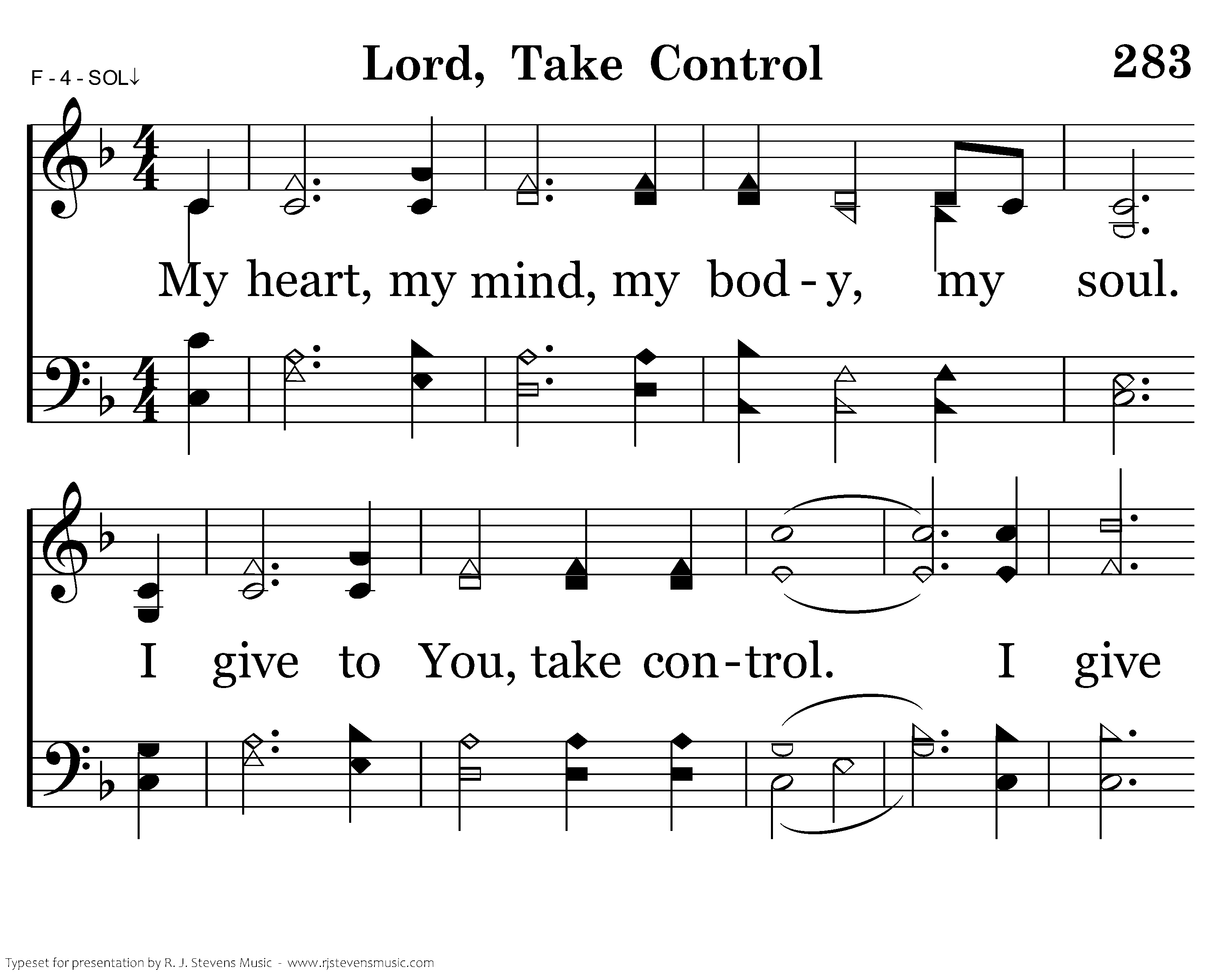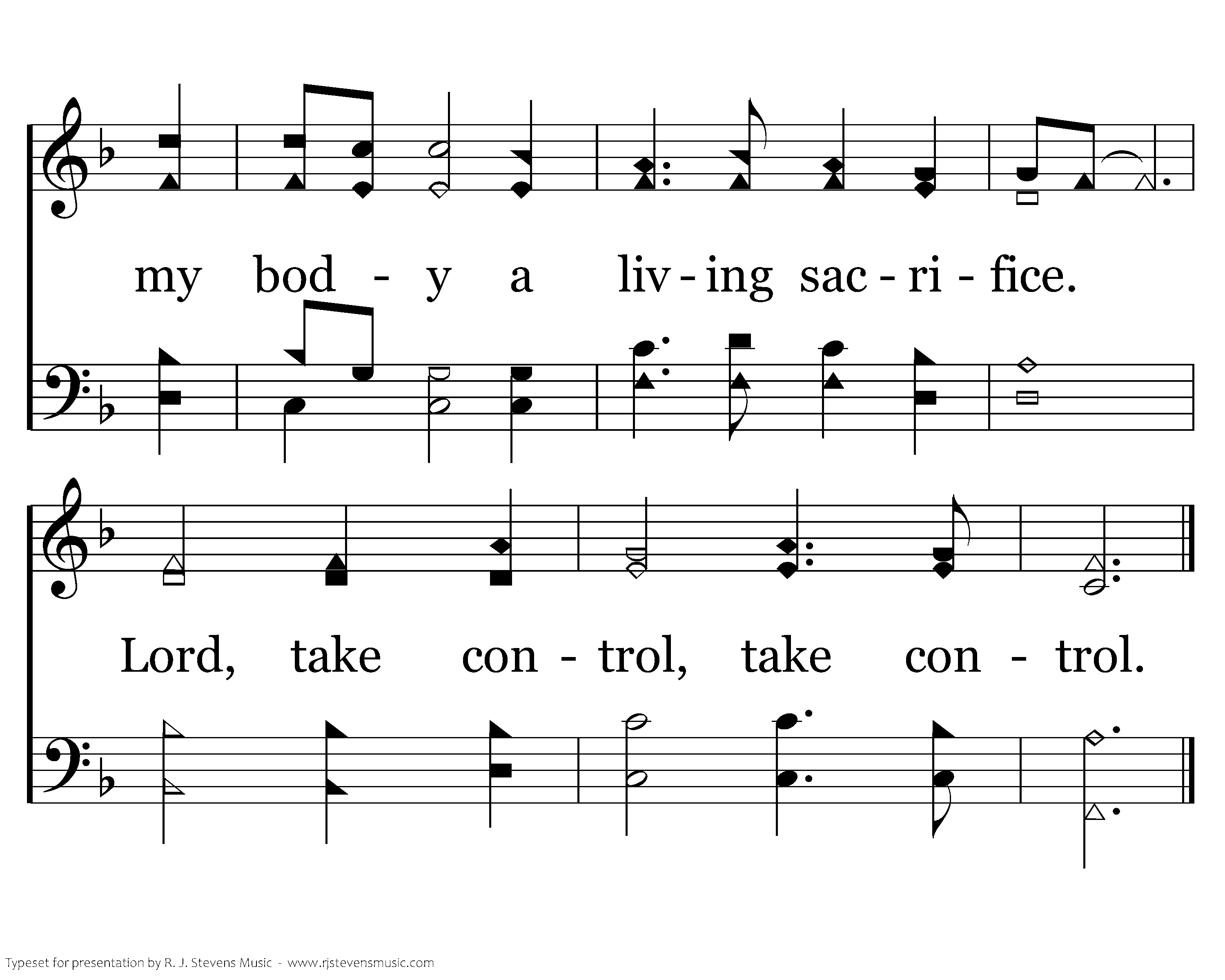 My heart, my mind, my body, my soul. I give to You, take control. I give my body a living sacrifice. Lord, take control, take control.