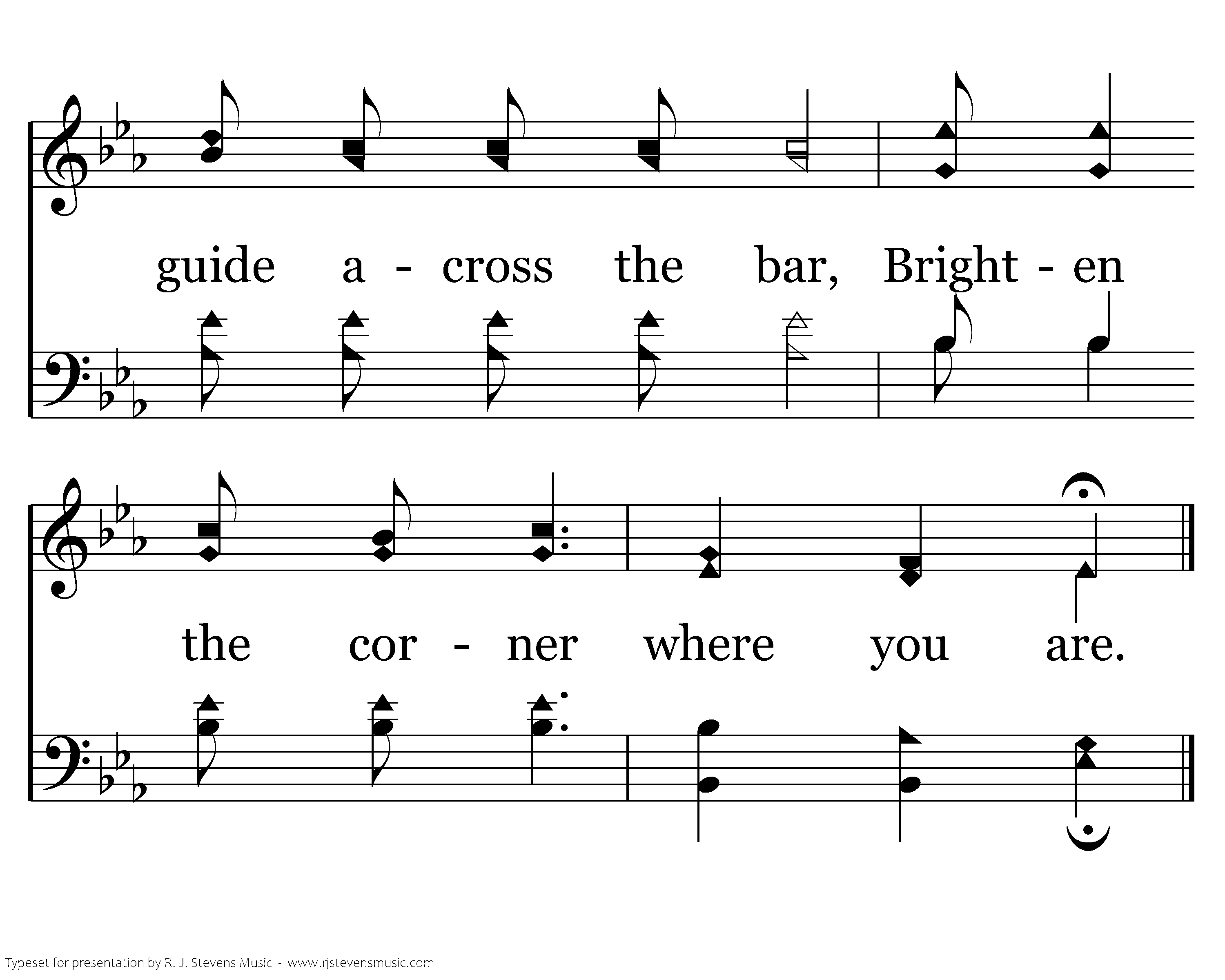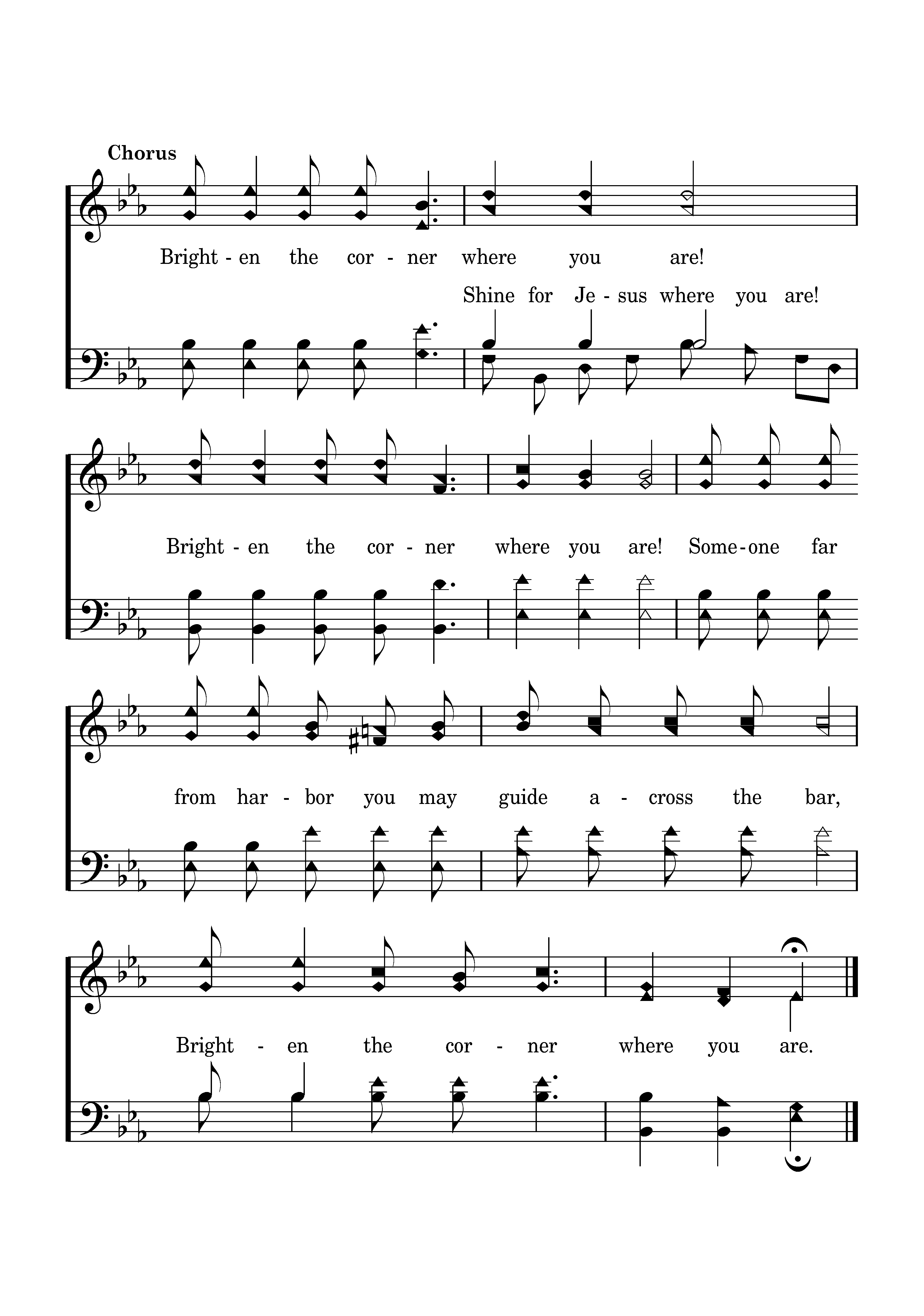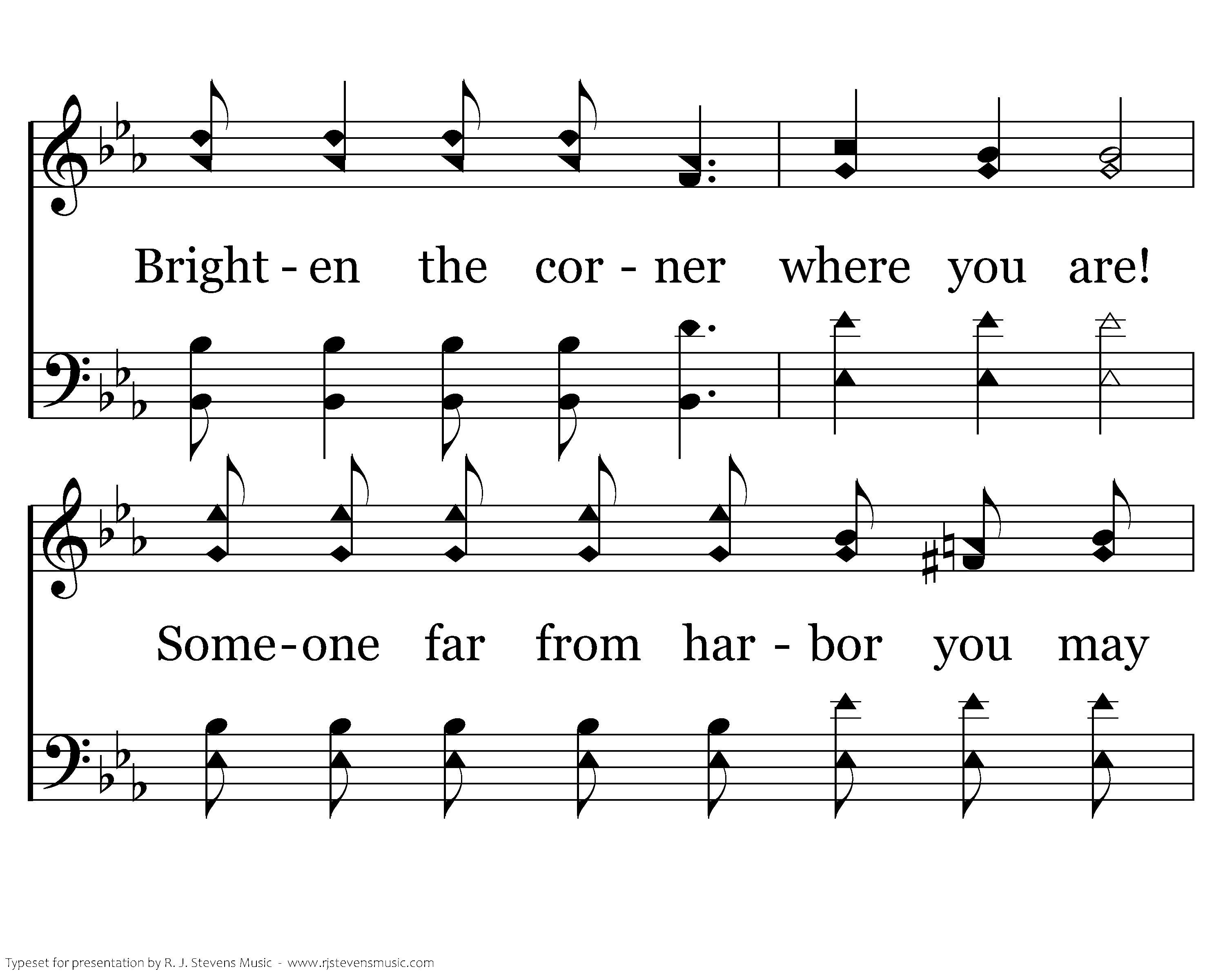 Brighten the corner where you are! Brighten the corner where you are! Someone far from harbor you may guide across the bar, Brighten the corner where you are.