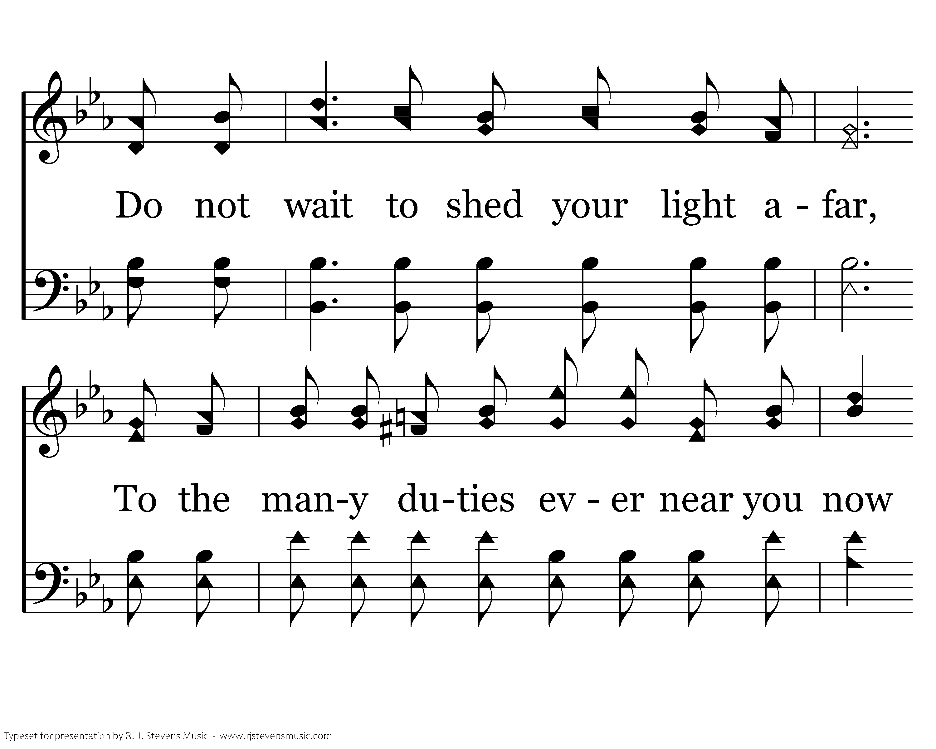 Do not wait until some deed of greatness you may do, Do not wait to shed your light afar, To the many duties ever near you now be true, Brighten the corner where you are.