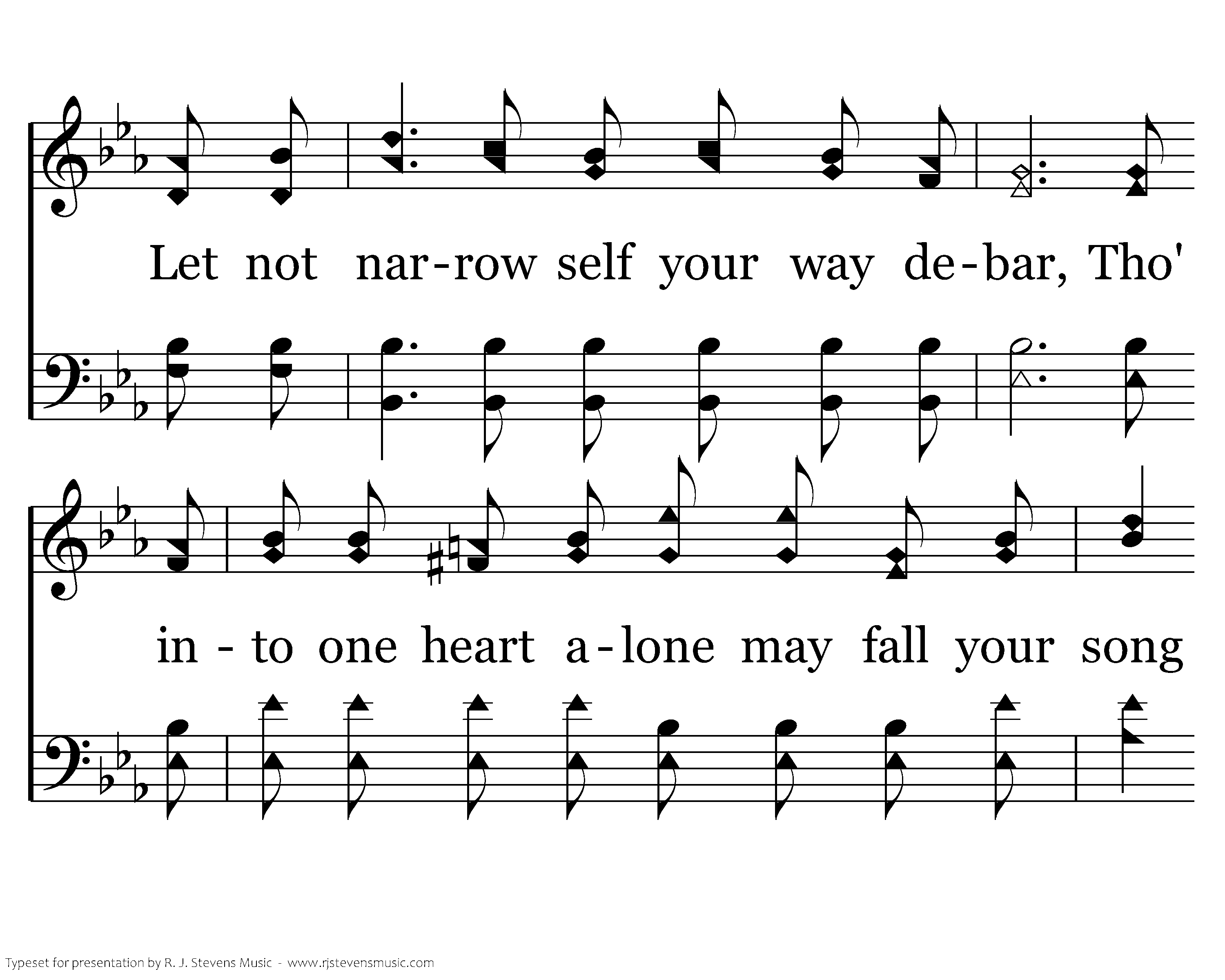 Just above are clouded skies that you may help to clear, Let not narrow self your way debar, Tho' into one heart alone may fall your song of cheer, Brighten the corner where you are.
