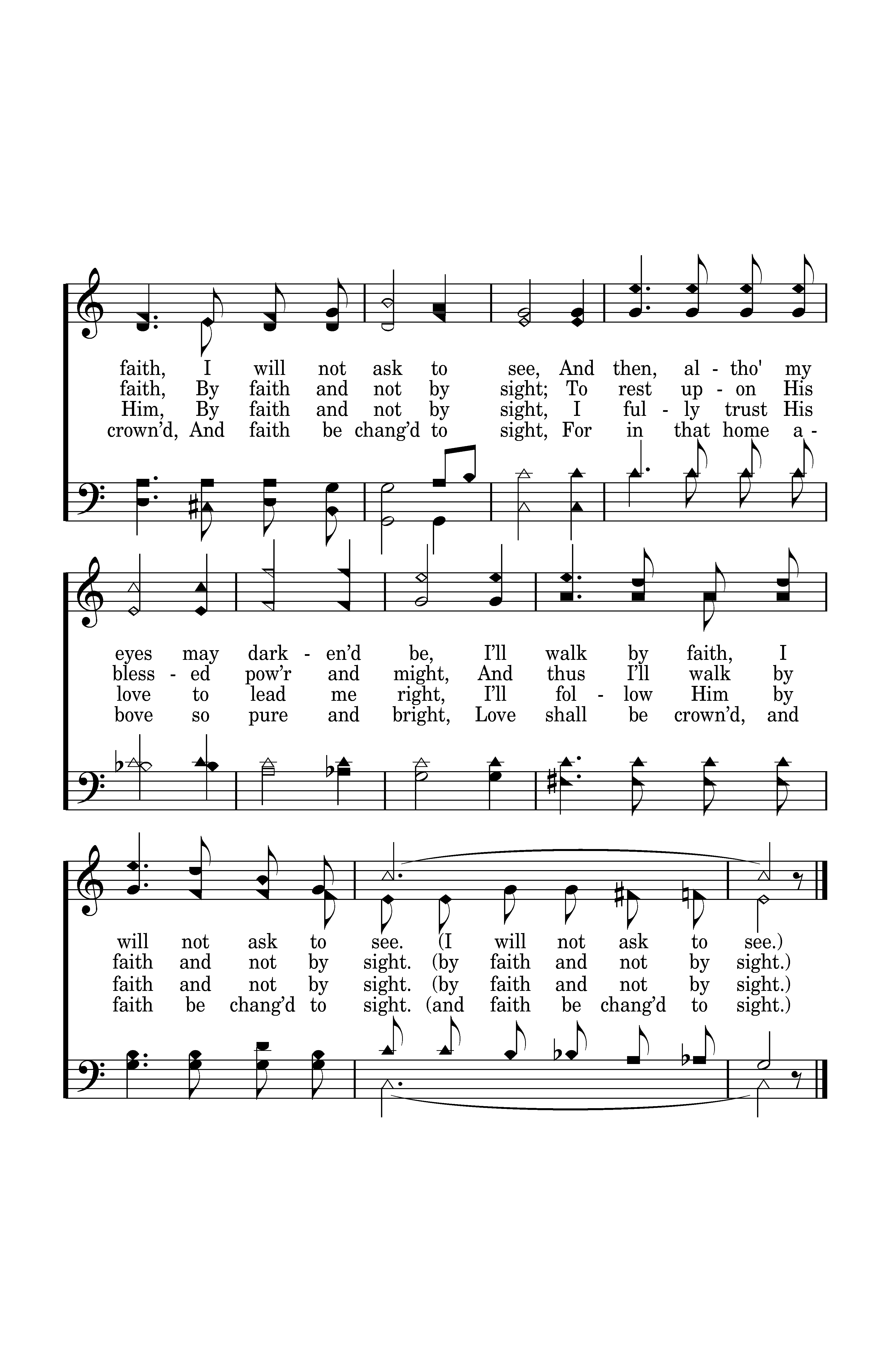 I do not ask to walk by sight, I only need to grasp The grasp The wounded hand of Christ my Lord, And feel His loving clasp. Altho' my eyes may darken’d be, Altho' my eyes may darken’d be, I’ll walk by faith, I’ll walk by faith, I will not ask to see, And then, altho' my eyes may darken’d be, I’ll walk by faith, I will not ask to see.