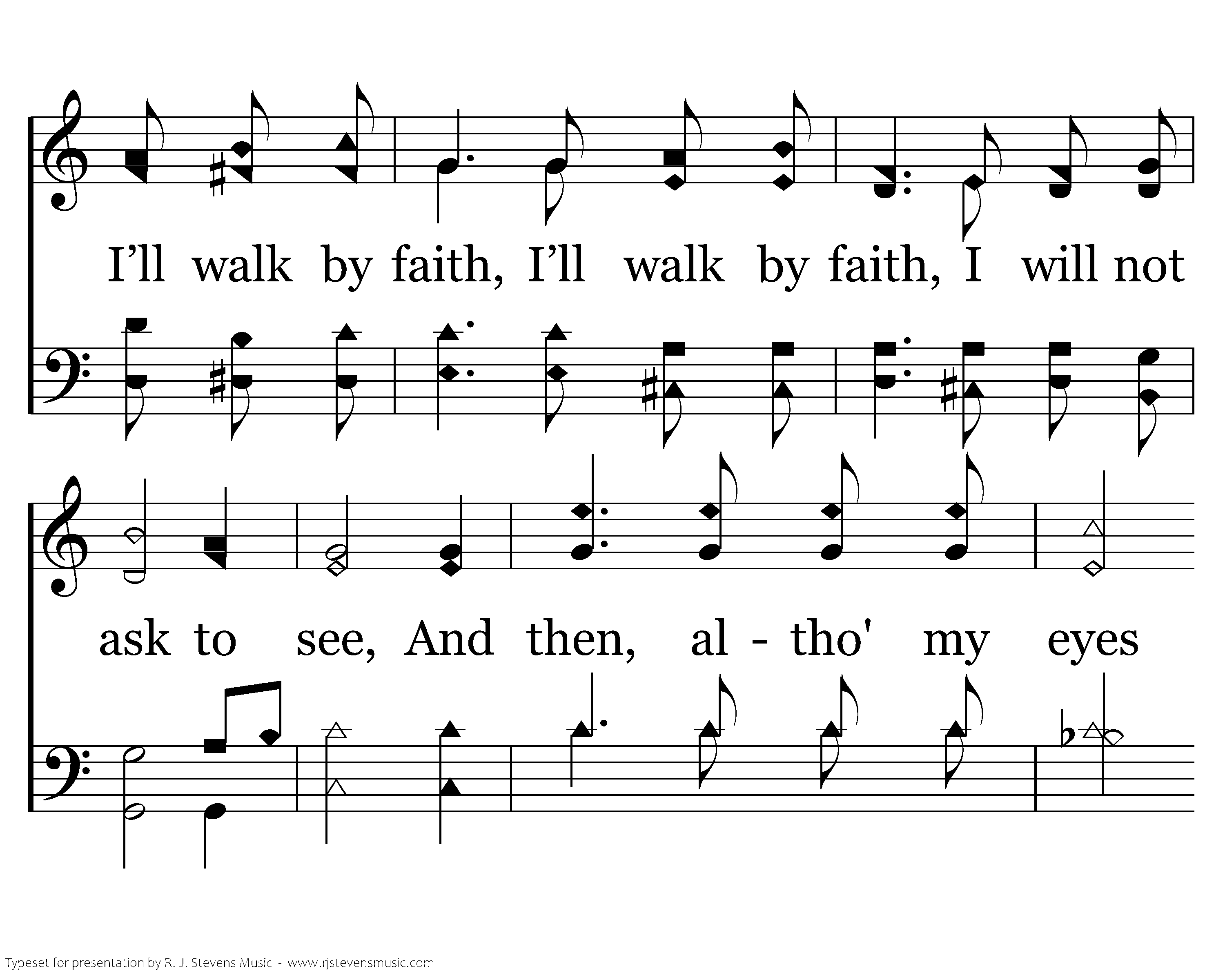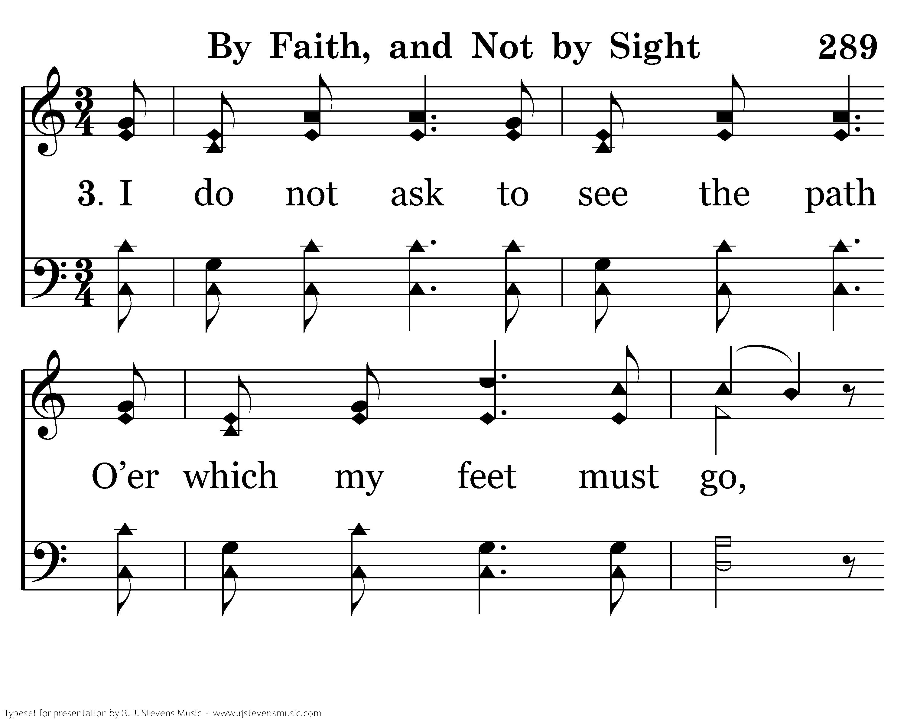 I do not ask to see the path O’er which my feet must go, My go, My Guide has pass’d this way before, And well the way doth know. I fully trust His love to lead, I trust His love to lead me right, I’ll fol-low Him, I’ll follow Him, By faith and not by sight, I fully trust His love to lead me right, I’ll follow Him by faith and not by sight.