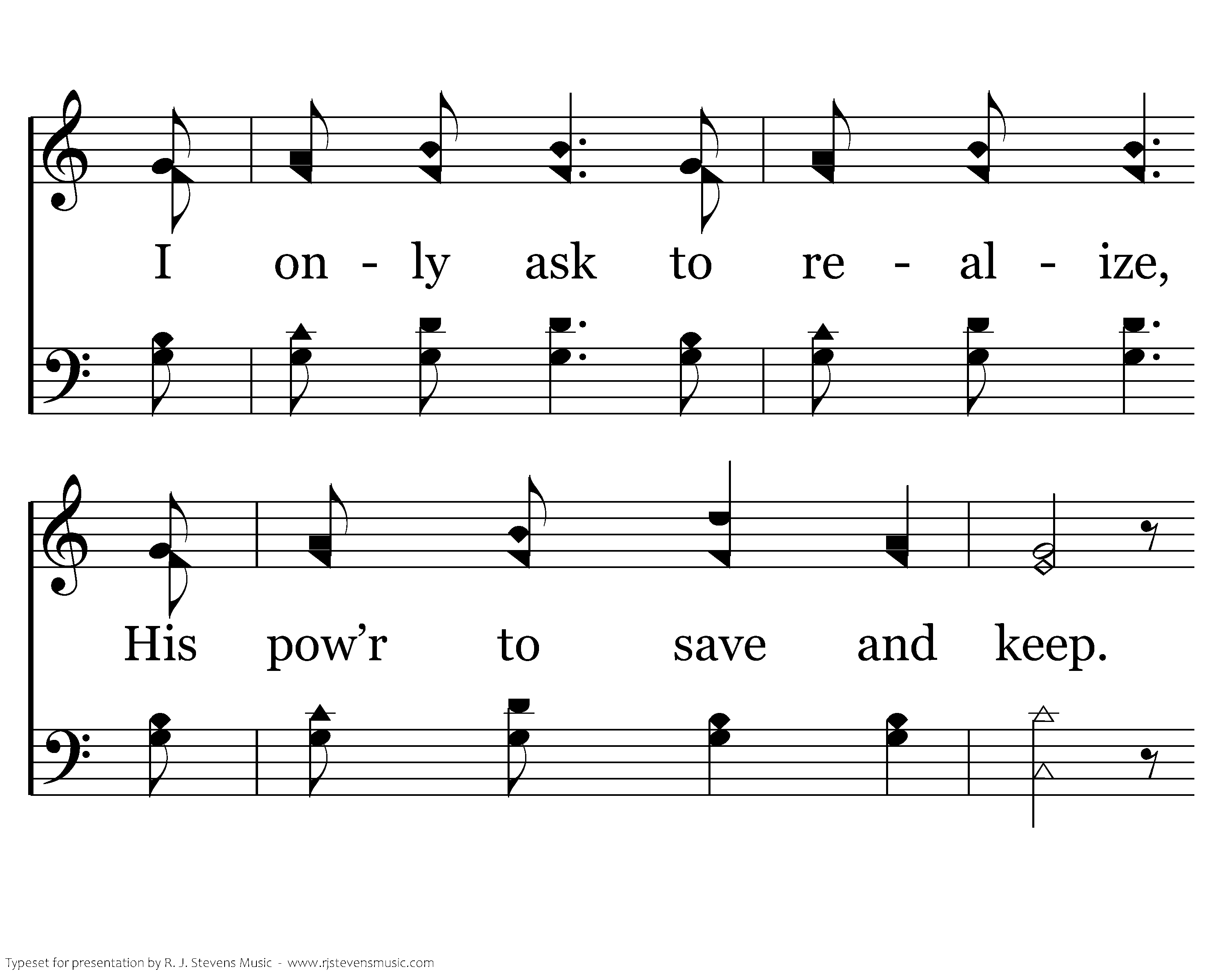 I do not ask for constant joy In raptures strong and deep; I deep; I only ask to realize, his pow’r to save and keep. To rest upon His blessed pow’r, To rest upon His pow’r, and might, And then I’ll walk, I’ll walk by faith, By faith and not by sight; To rest upon His blessed pow’r and might, And thus I’ll walk by faith and not by sight.