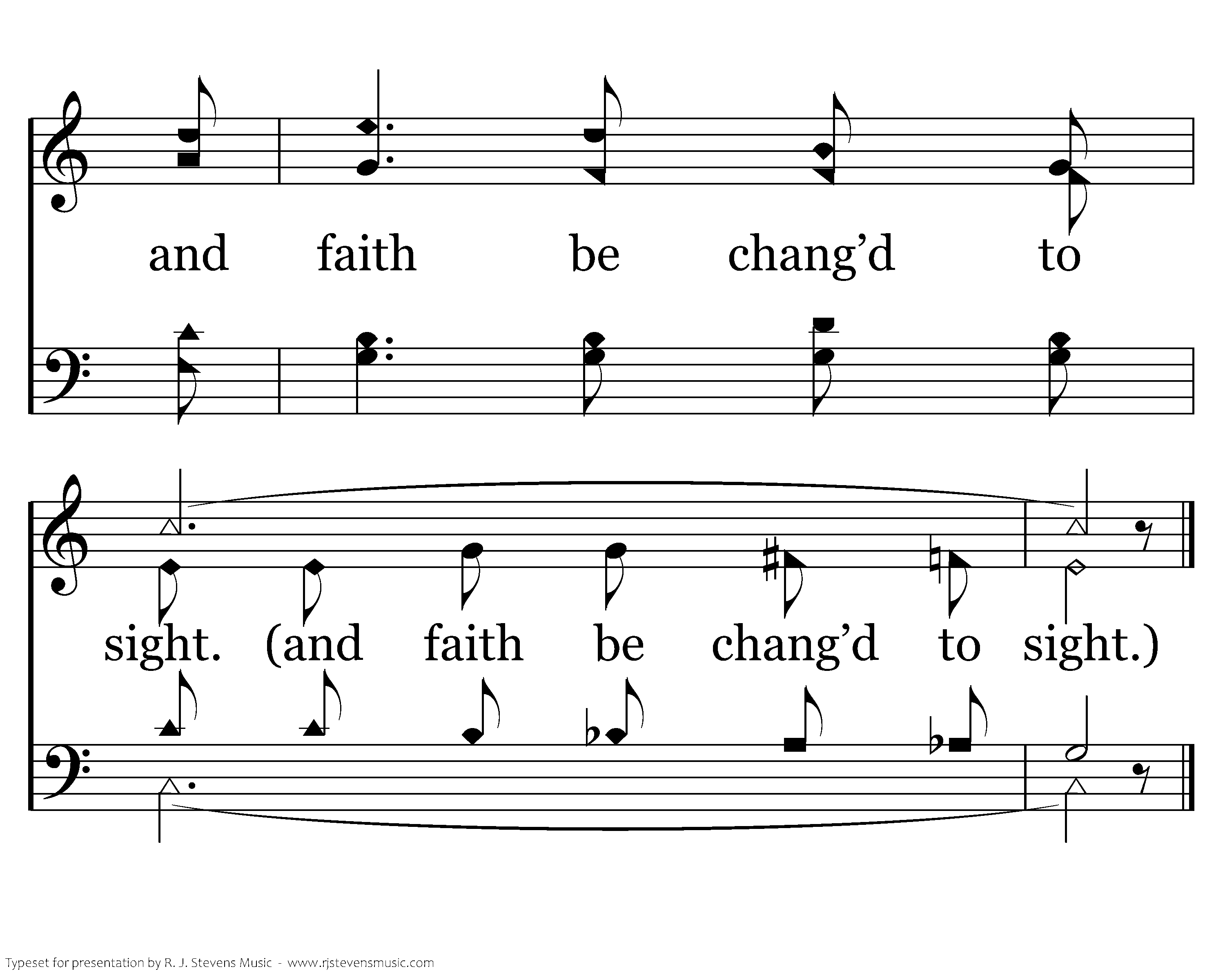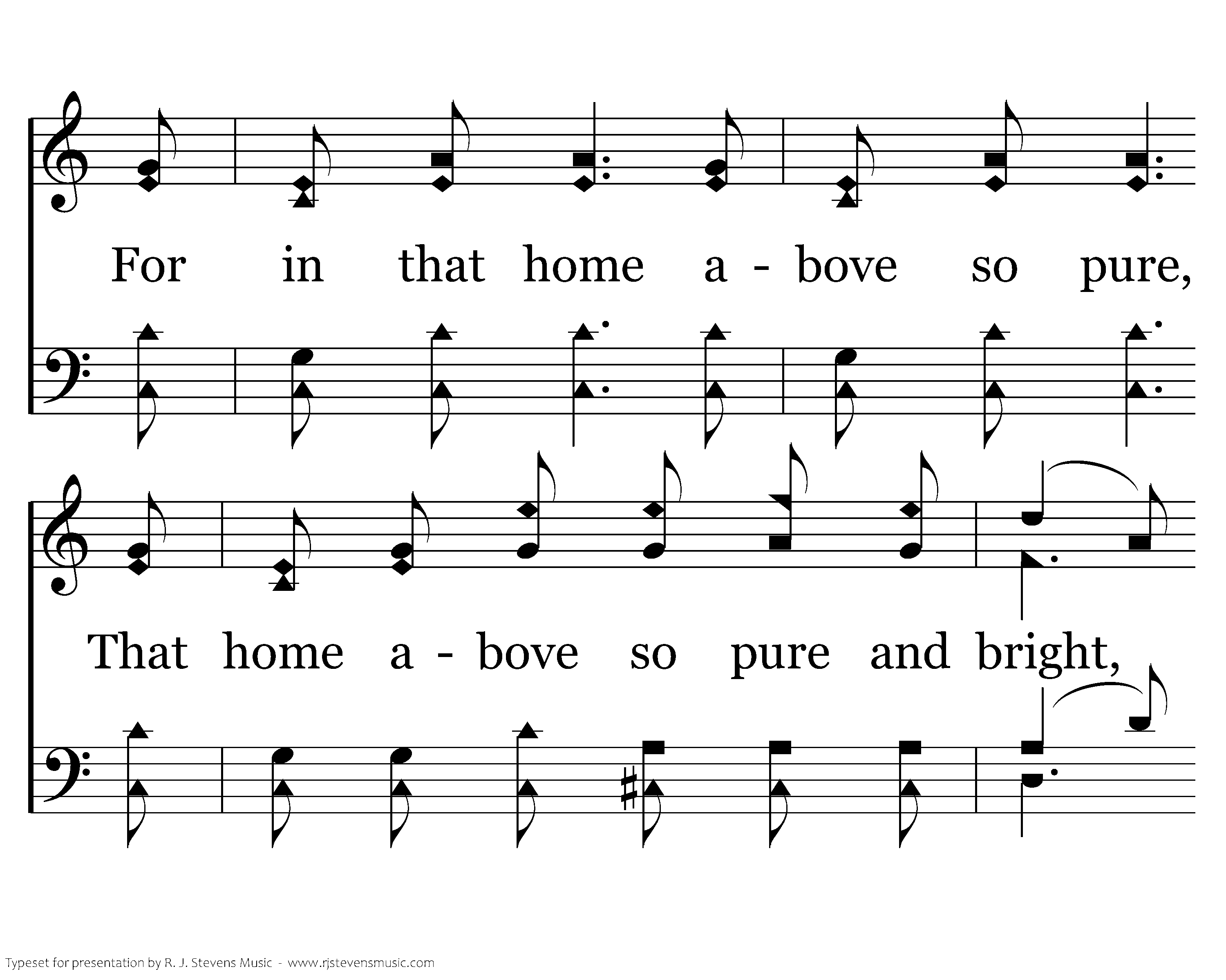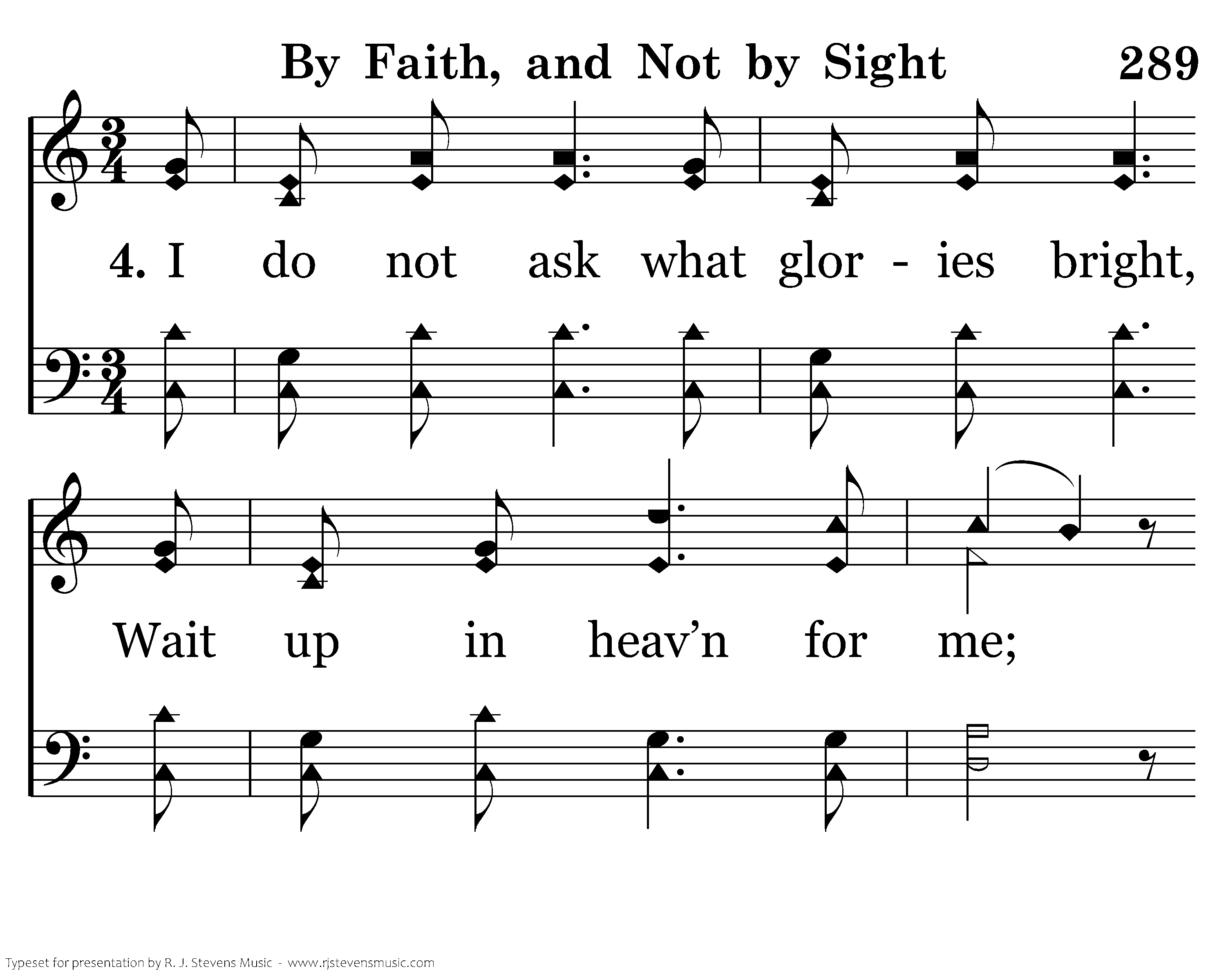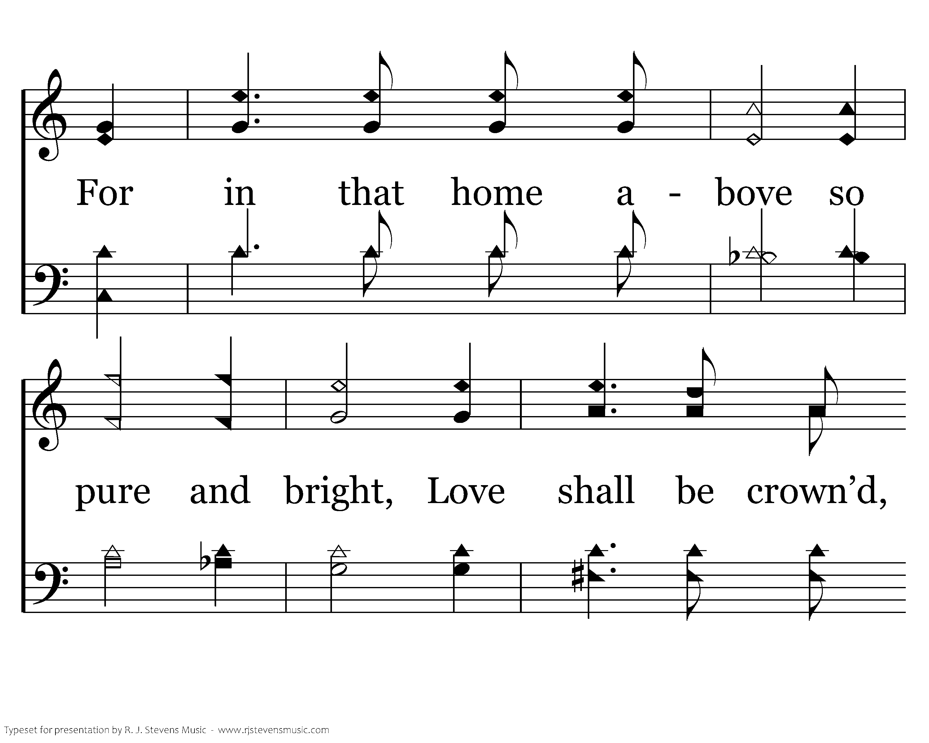 I do not ask what glories bright, Wait up in heav’n for me; But me; But this I’m told, my King in all His beauty I shall see. For in that home above so pure, That home above so pure and bright, Love shall be crown’d, love shall be crown’d, And faith be chang’d to sight, For in that home above so pure and bight, Love shall be crown’d, and faith be chang’d to sight.