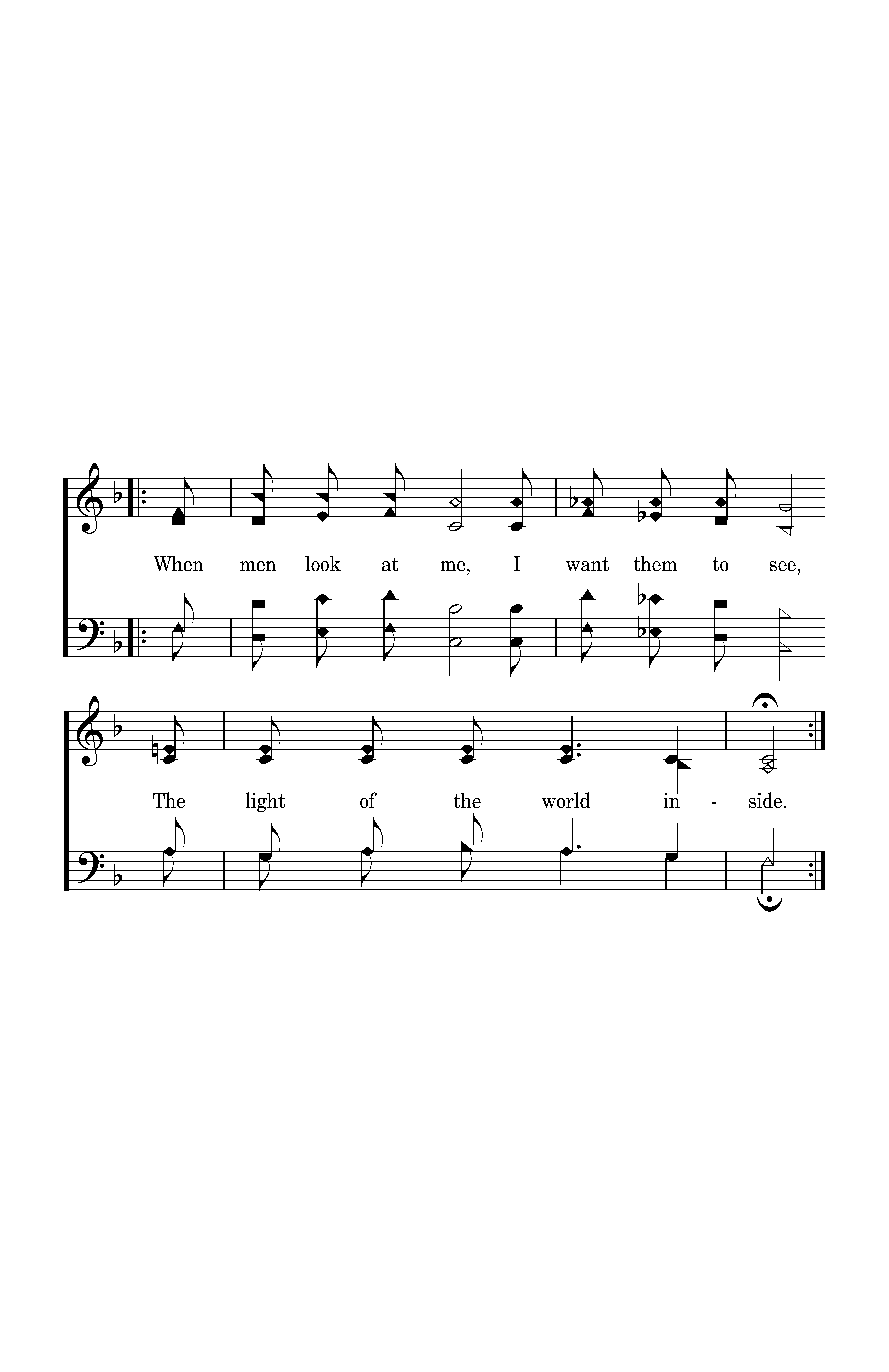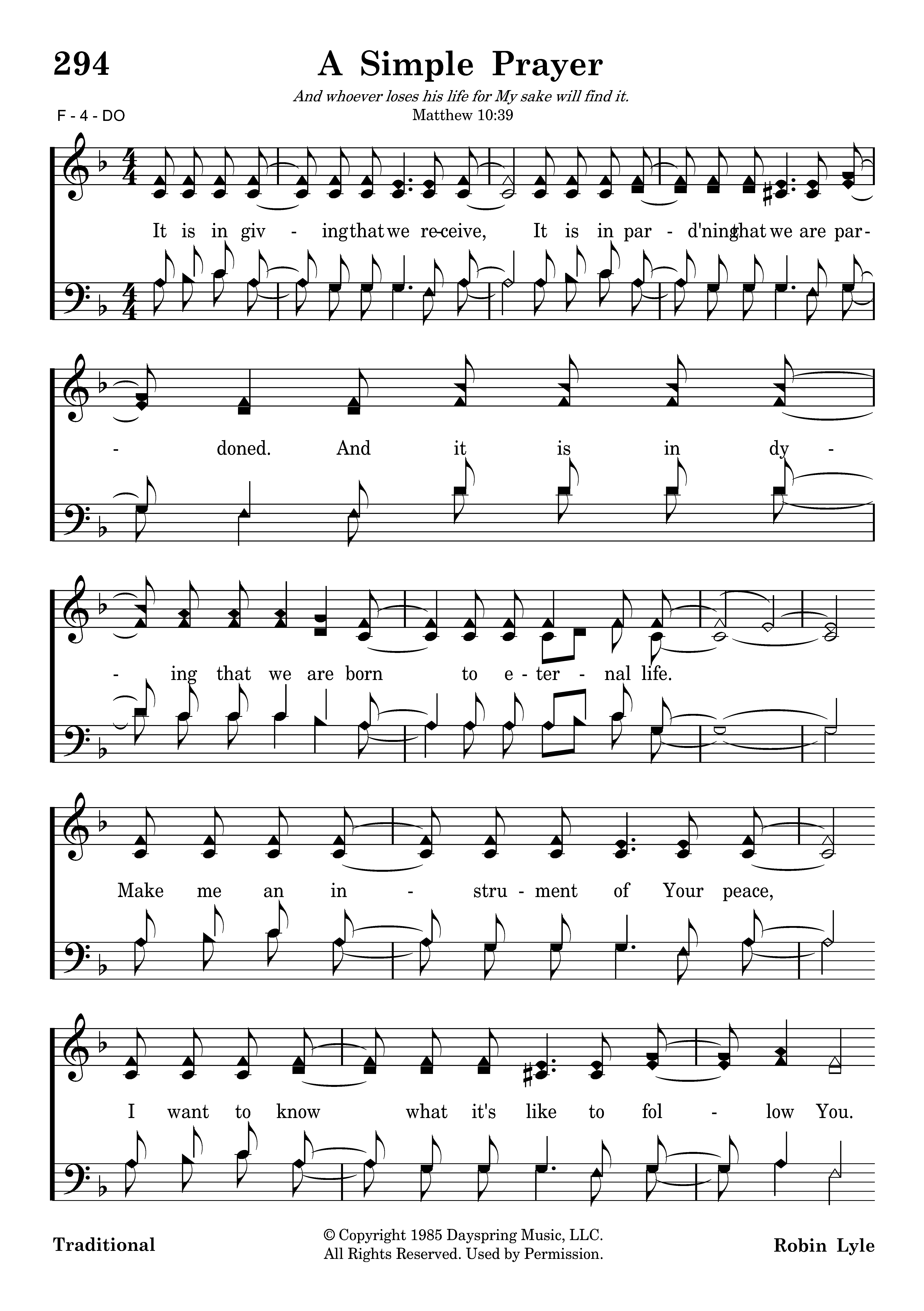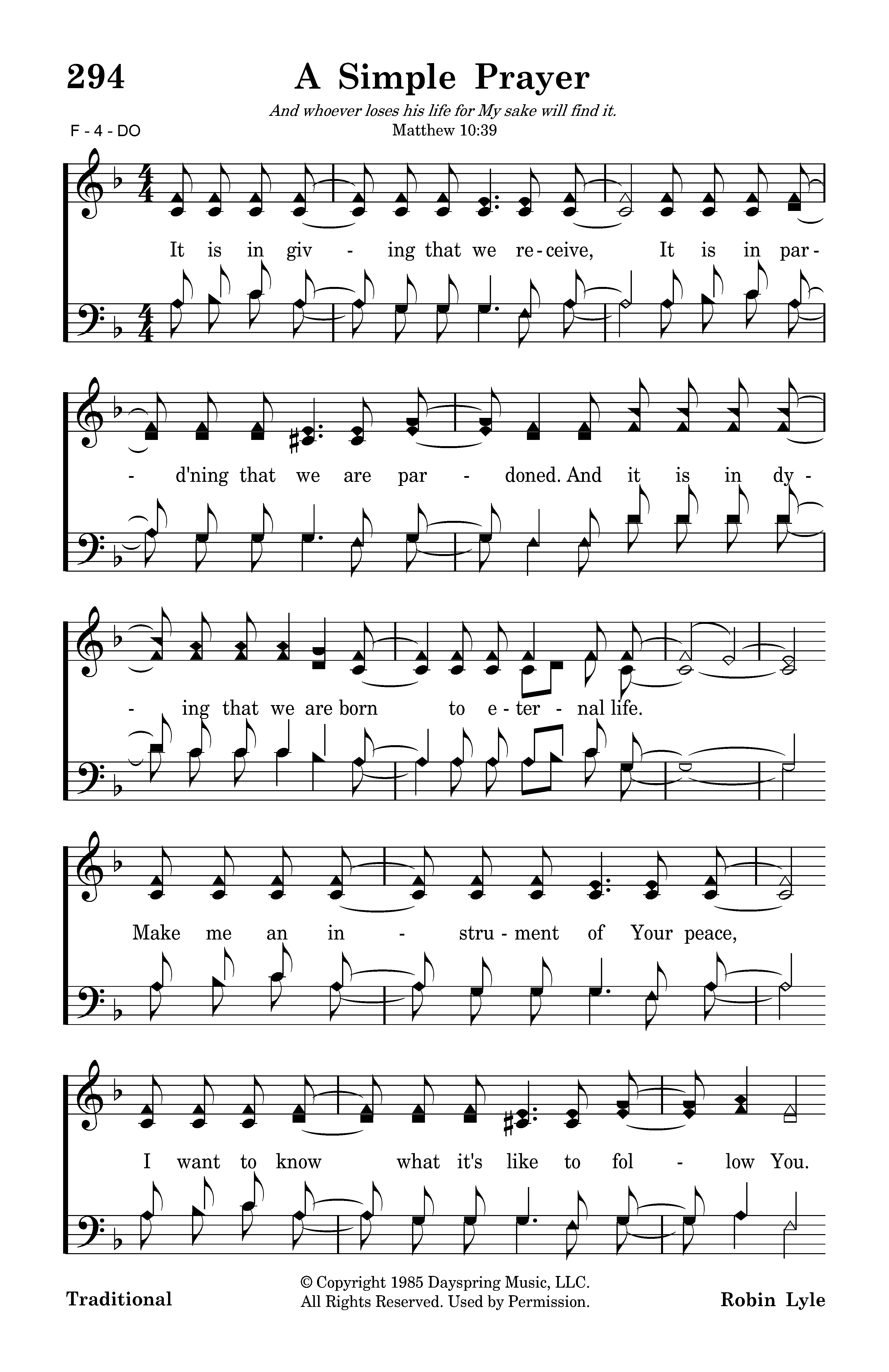 It is in giving that we receive, It is in pard'ning that we are pardoned. And it is in dying that we are born to eternal life. Make me an instrument of Your peace, I want to know what it's like to follow You. When men look at me, I want them to see, The light of the world inside.