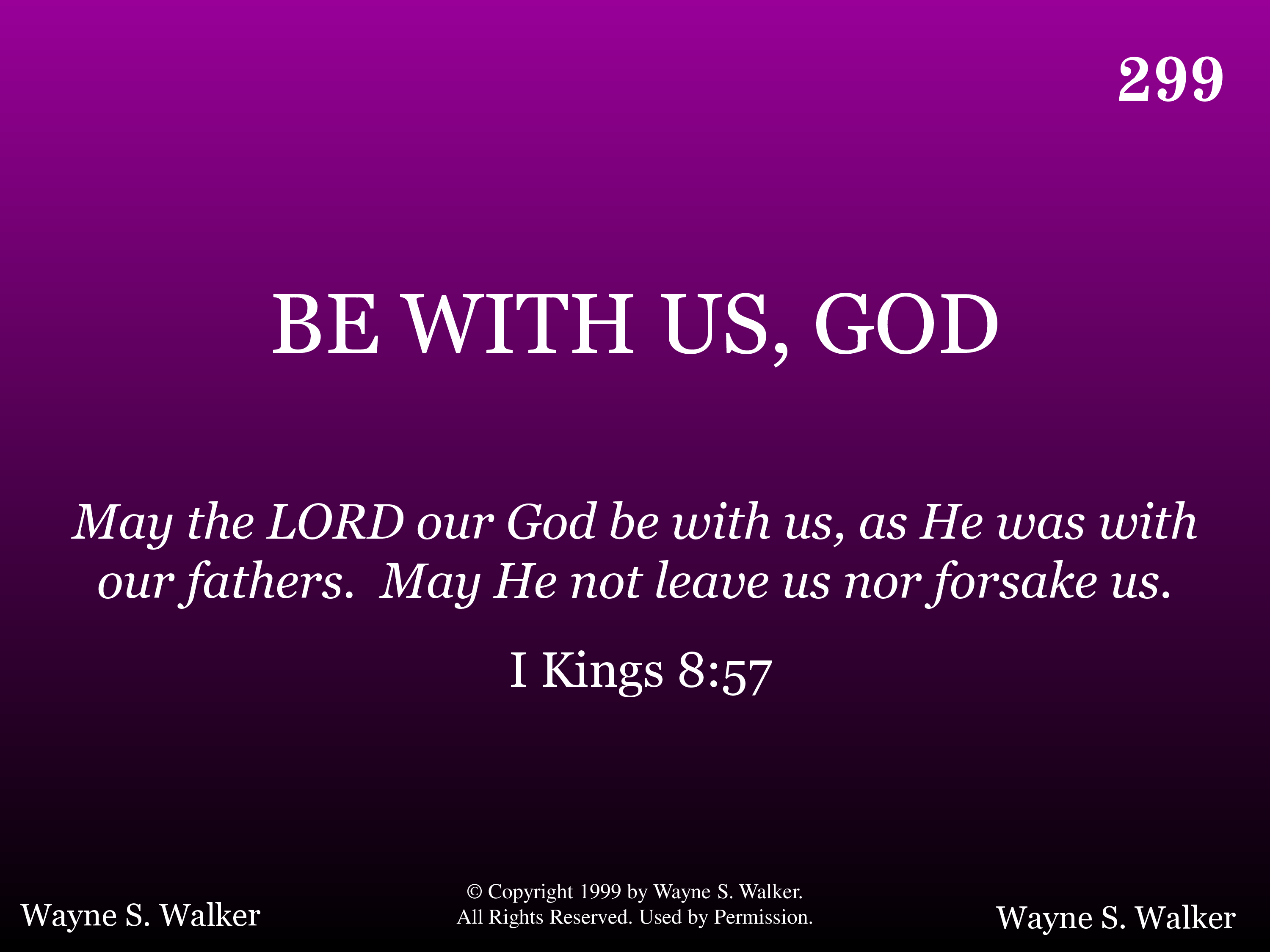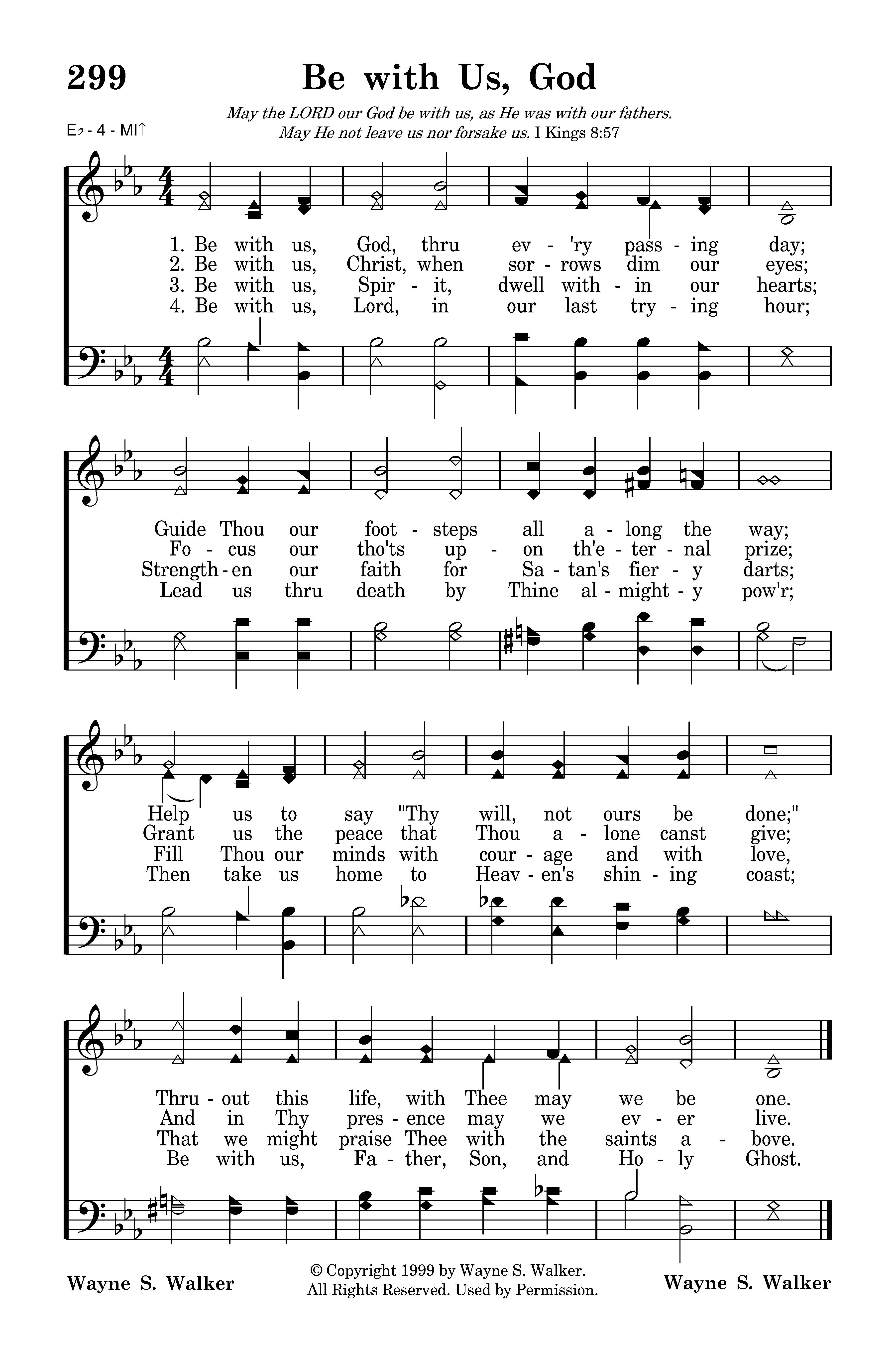 Be with us, God, thru ev'ry passing day; Guide Thou our footsteps all along the way; Help us to say "Thy will, not ours be done;" Thruout this life, with Thee may we be one.