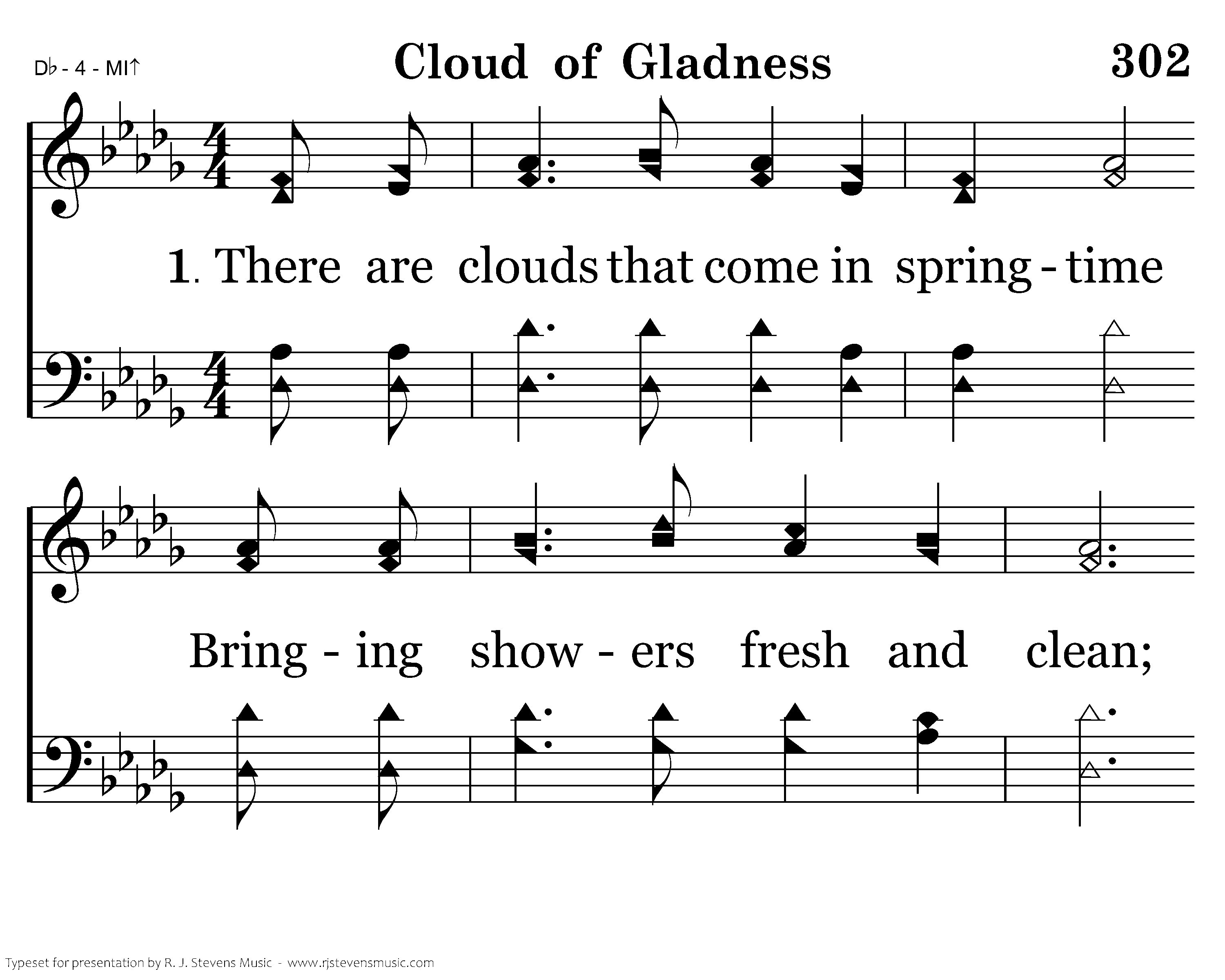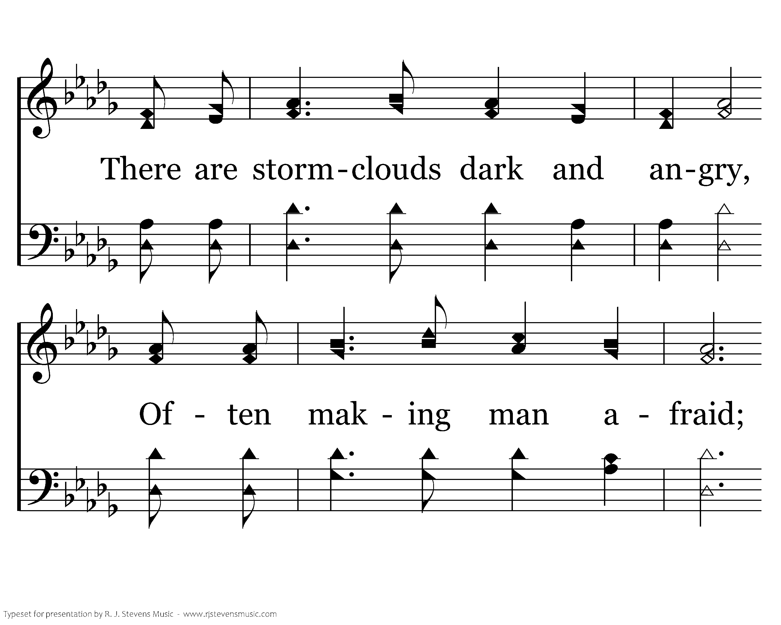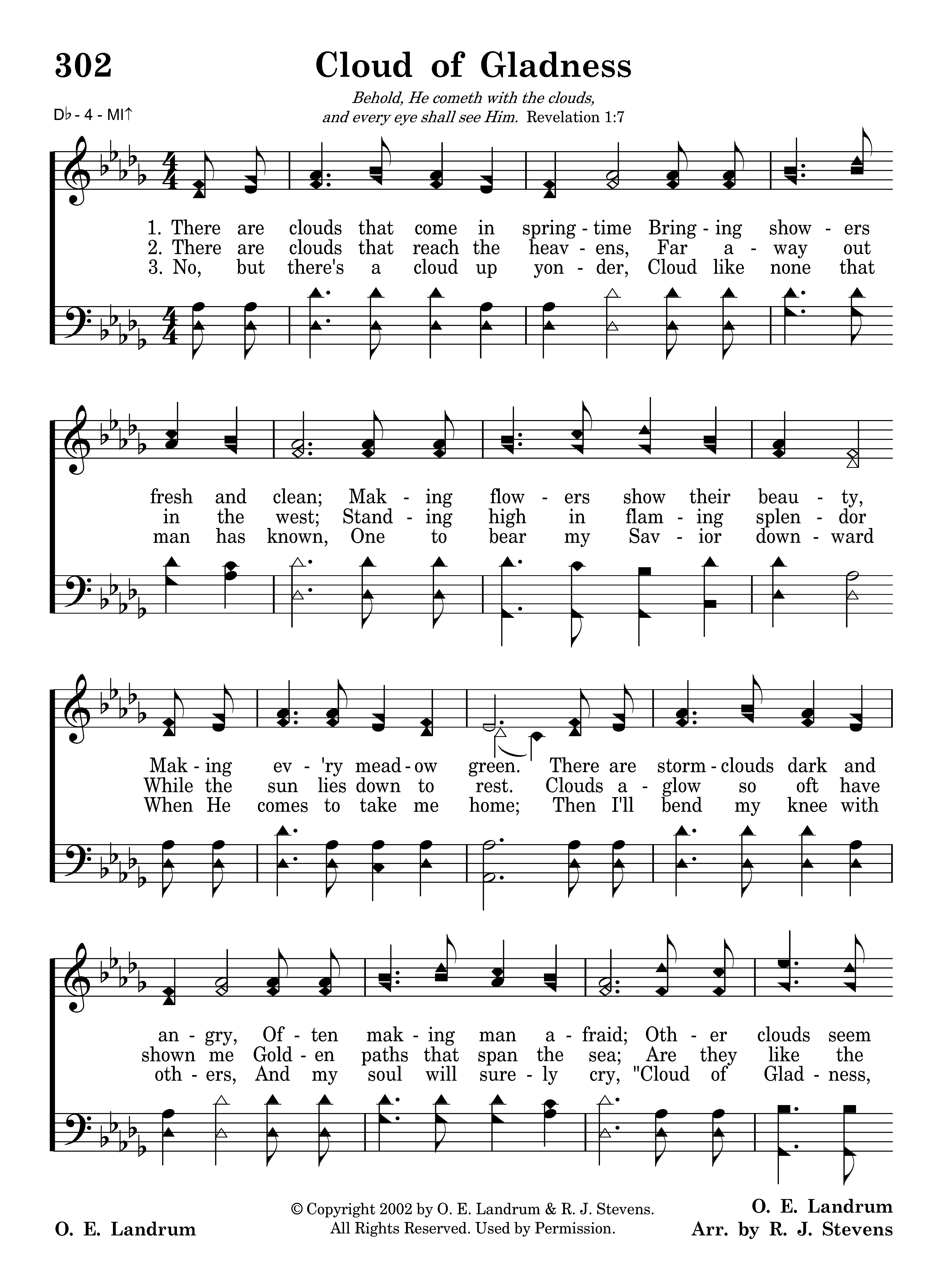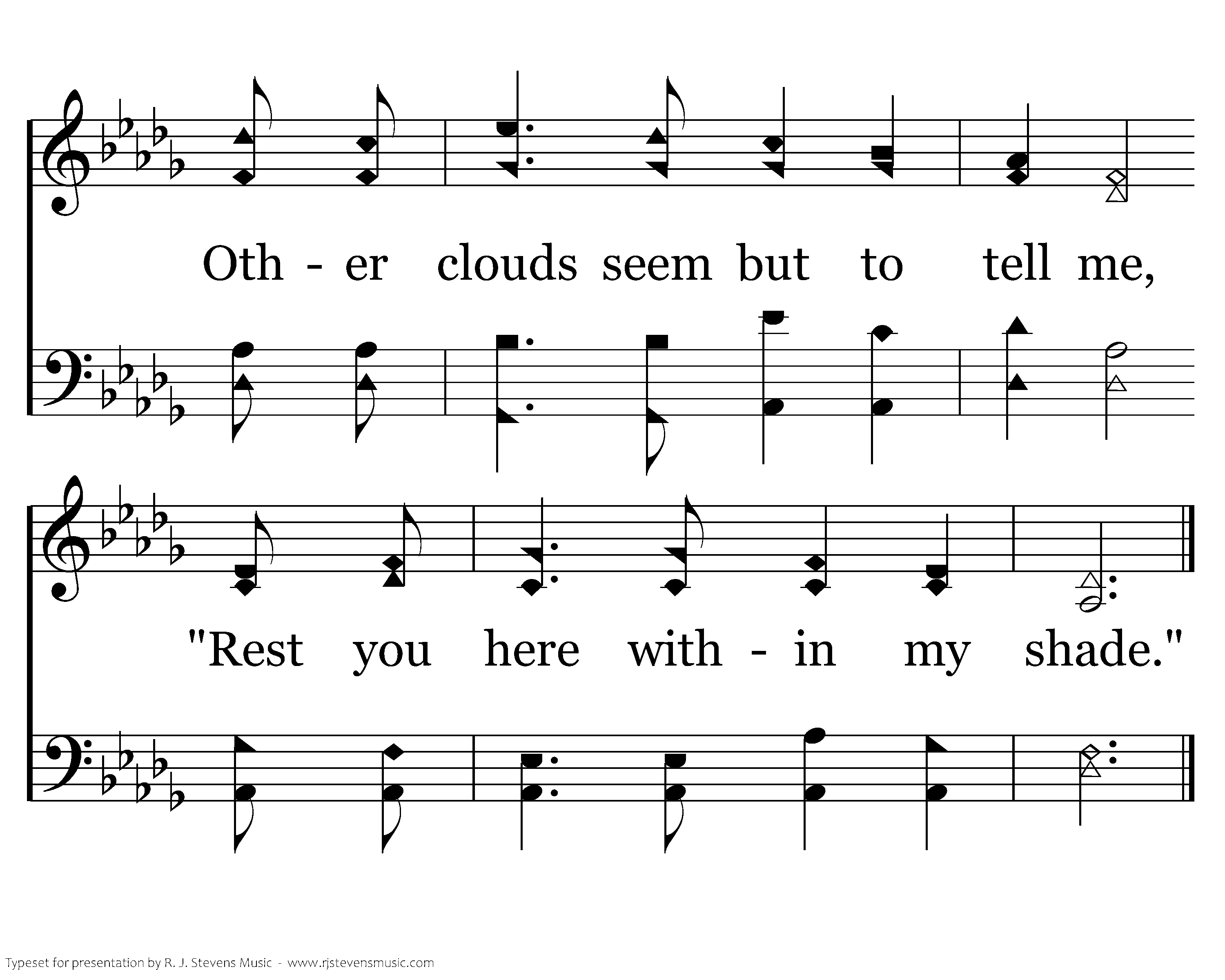 There are clouds that come in springtime Bringing showers fresh and clean; Making flowers show their beauty, Making ev'ry meadow green. There are stormclouds dark and angry, Often making man afraid; Other clouds seem but to tell me, "Rest you here within my shade."