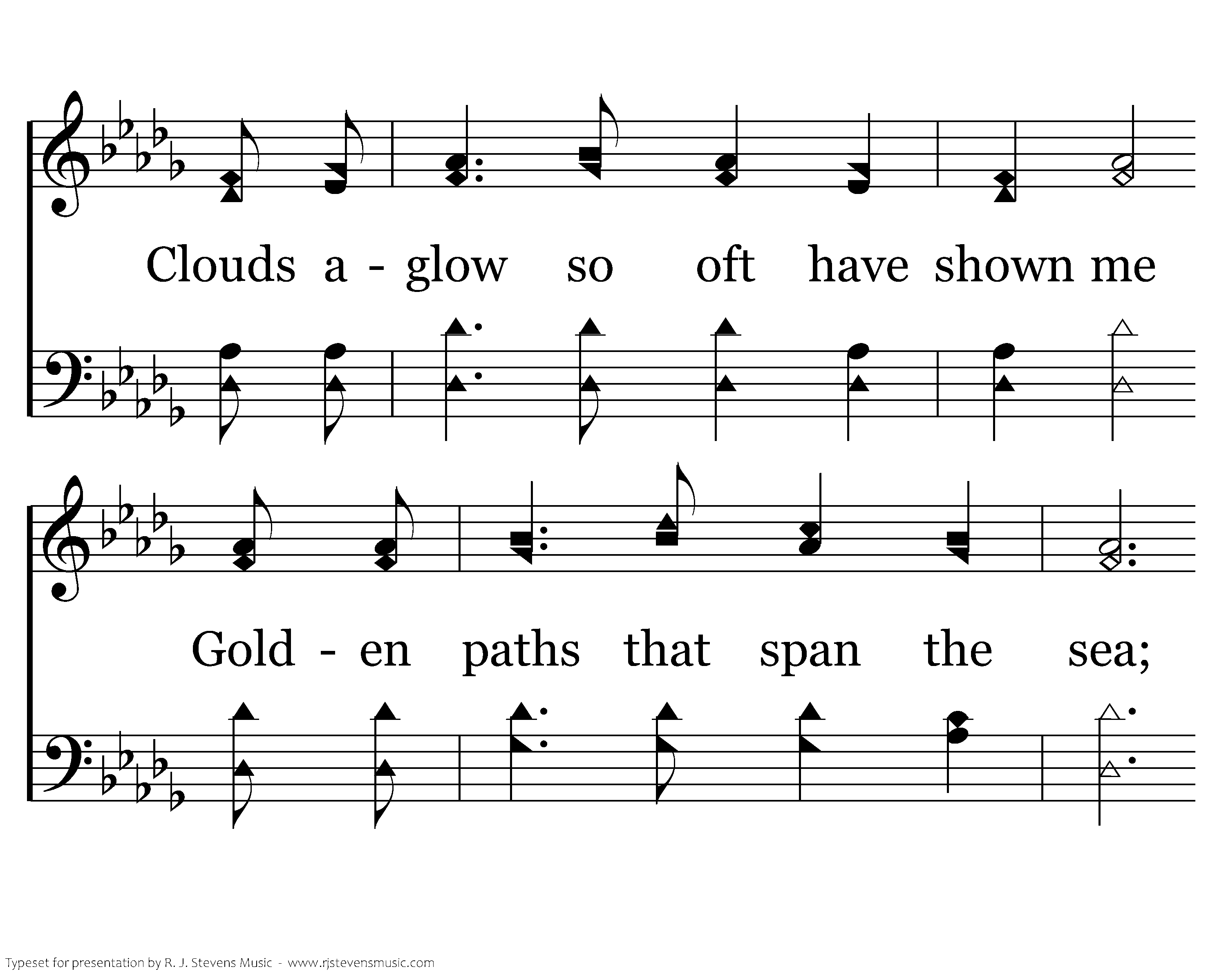 There are clouds that reach the heavens, Far away out in the west; Standing high in flaming slendor While the sun lies down to rest. Clouds aglow so oft have shown me Golden paths that span the sea; Are they like the path that leads me When my Savior calls for me?