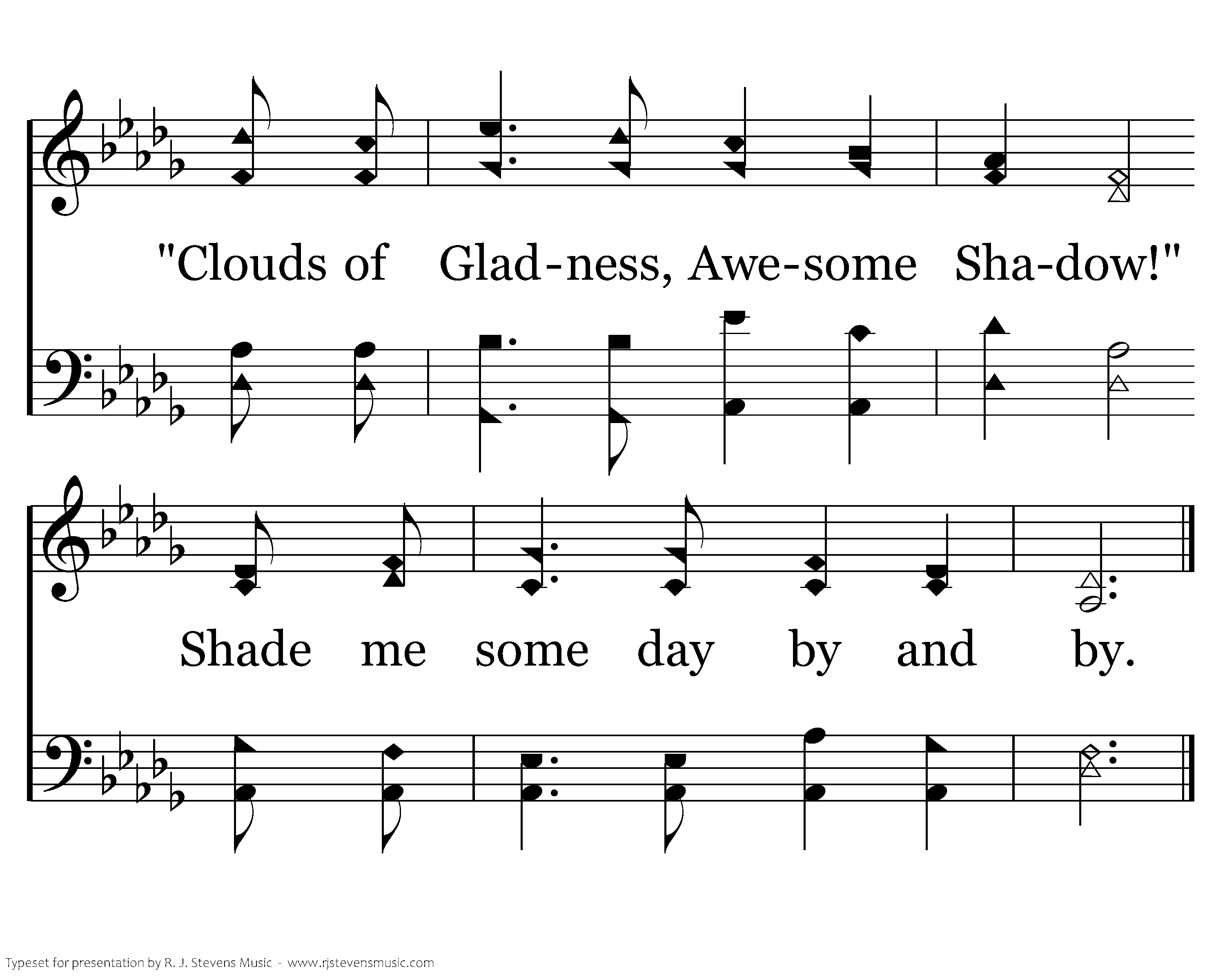 No, but there's a cloud up yonder, Cloud like none that man has known, One to bear my Savior downward When He comes to take me home; Then I'll bend my knee with others, And my soul will surely cry, "Cloud of Gladness, Awesome Shadow!" Shade me some day by and by.