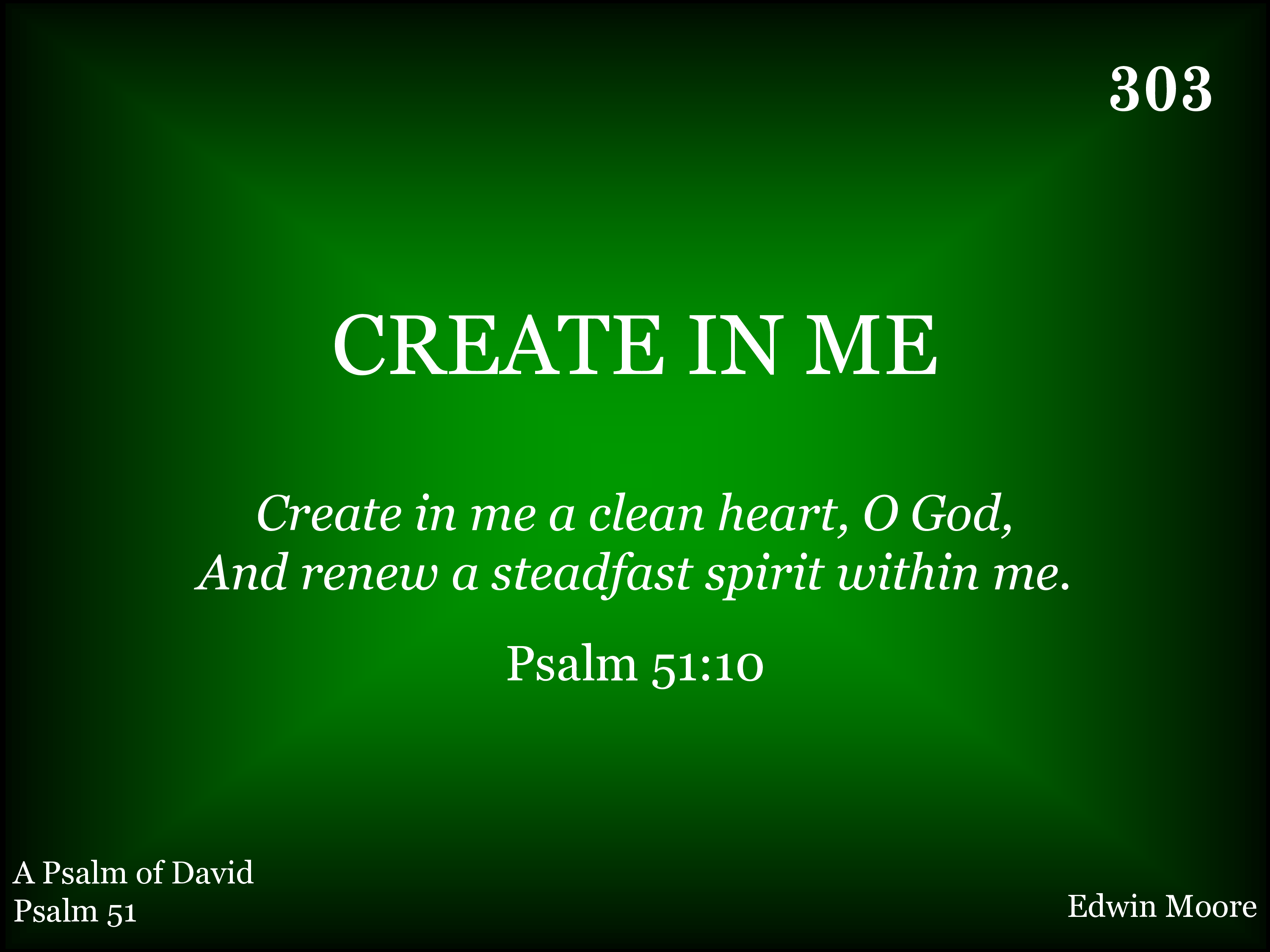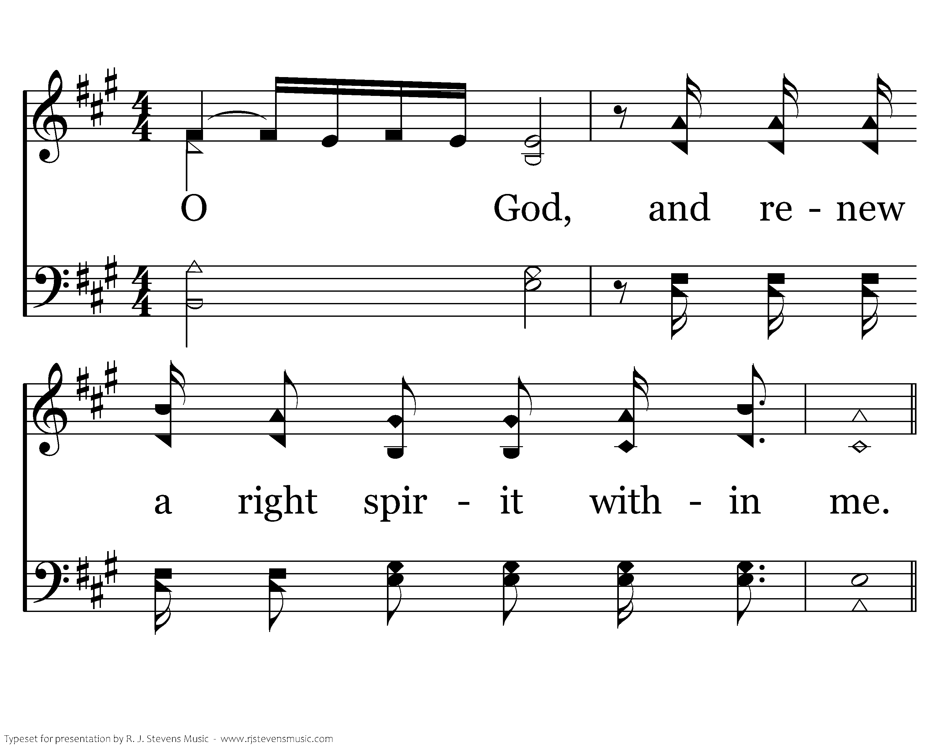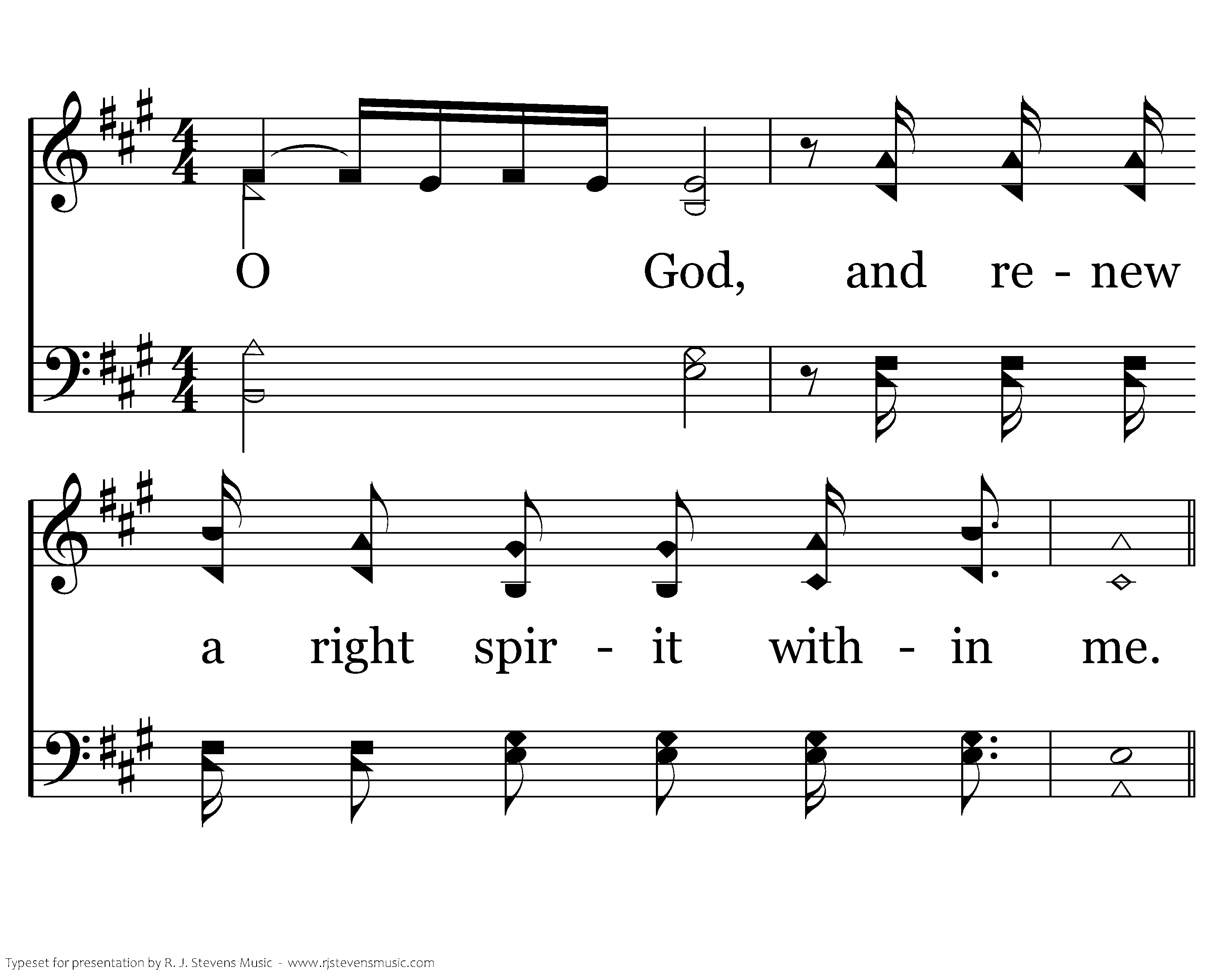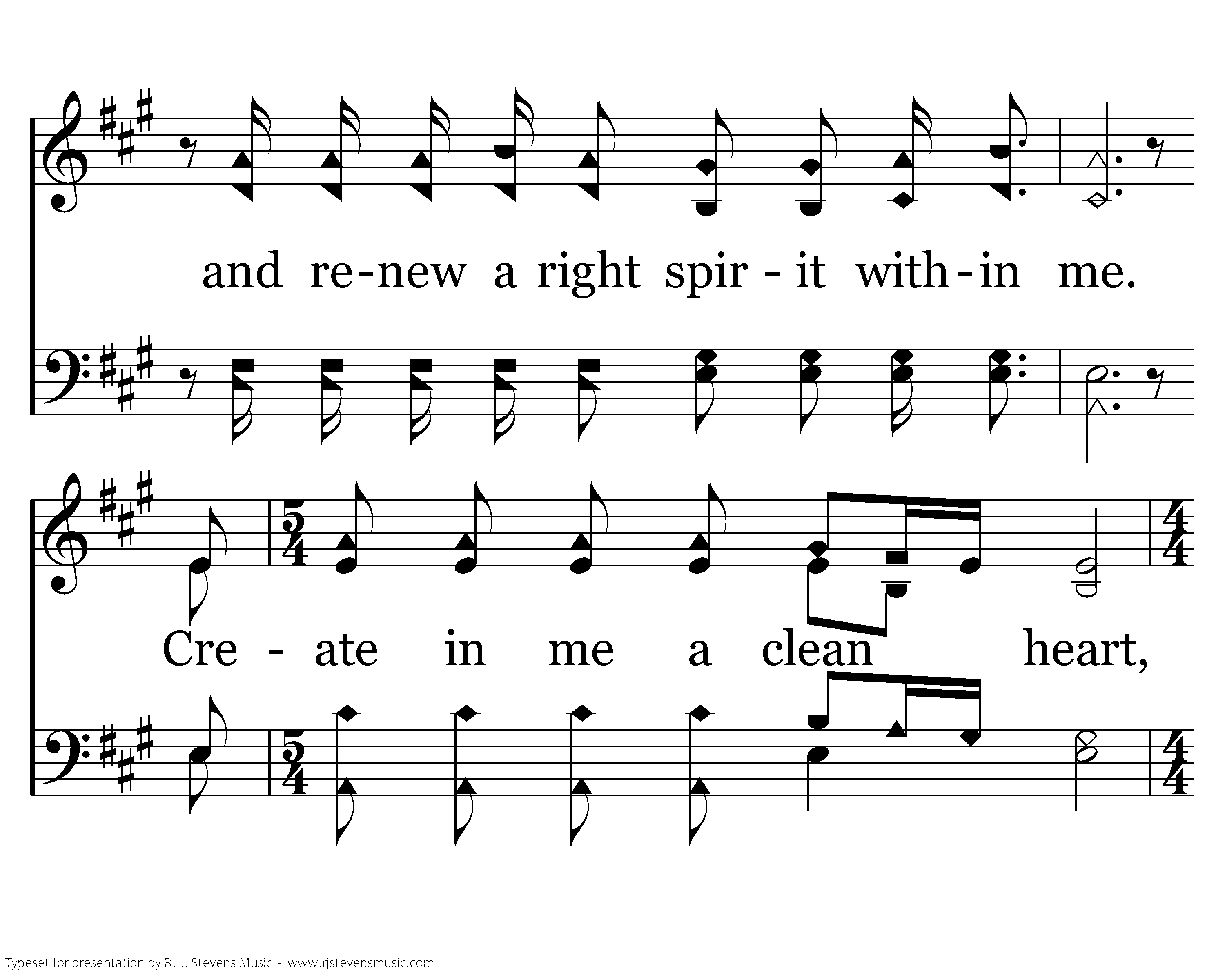 Create in me a clean heart, O God, and renew a right spirit within me. Cre-ate in me a clean heart, O God, and renew a right spirit within me. Cast me not away from Your presence, O, Lord, and take not Your holy spirit from me, restore unto me the joy of my salvation and renew a right spirit within me.