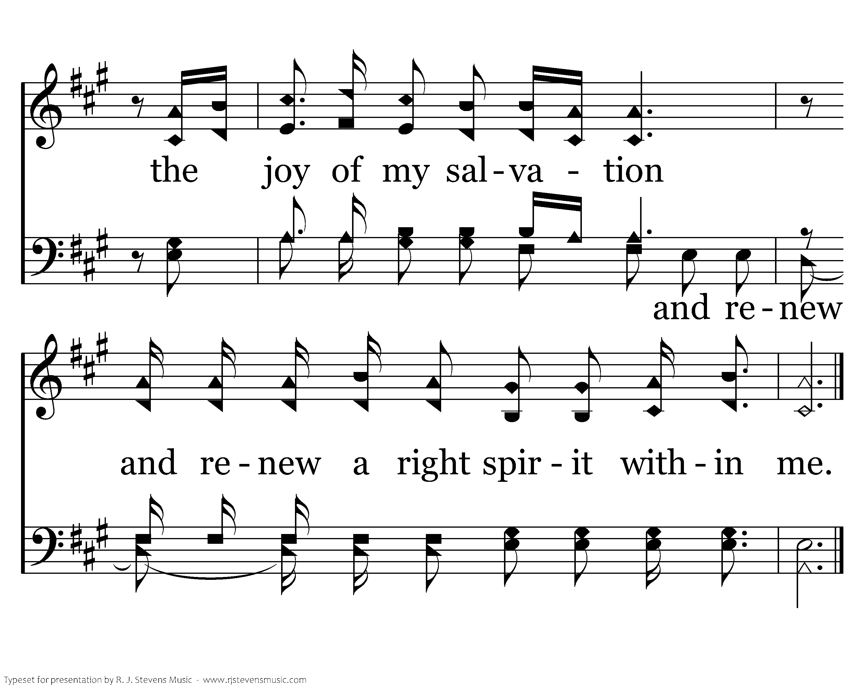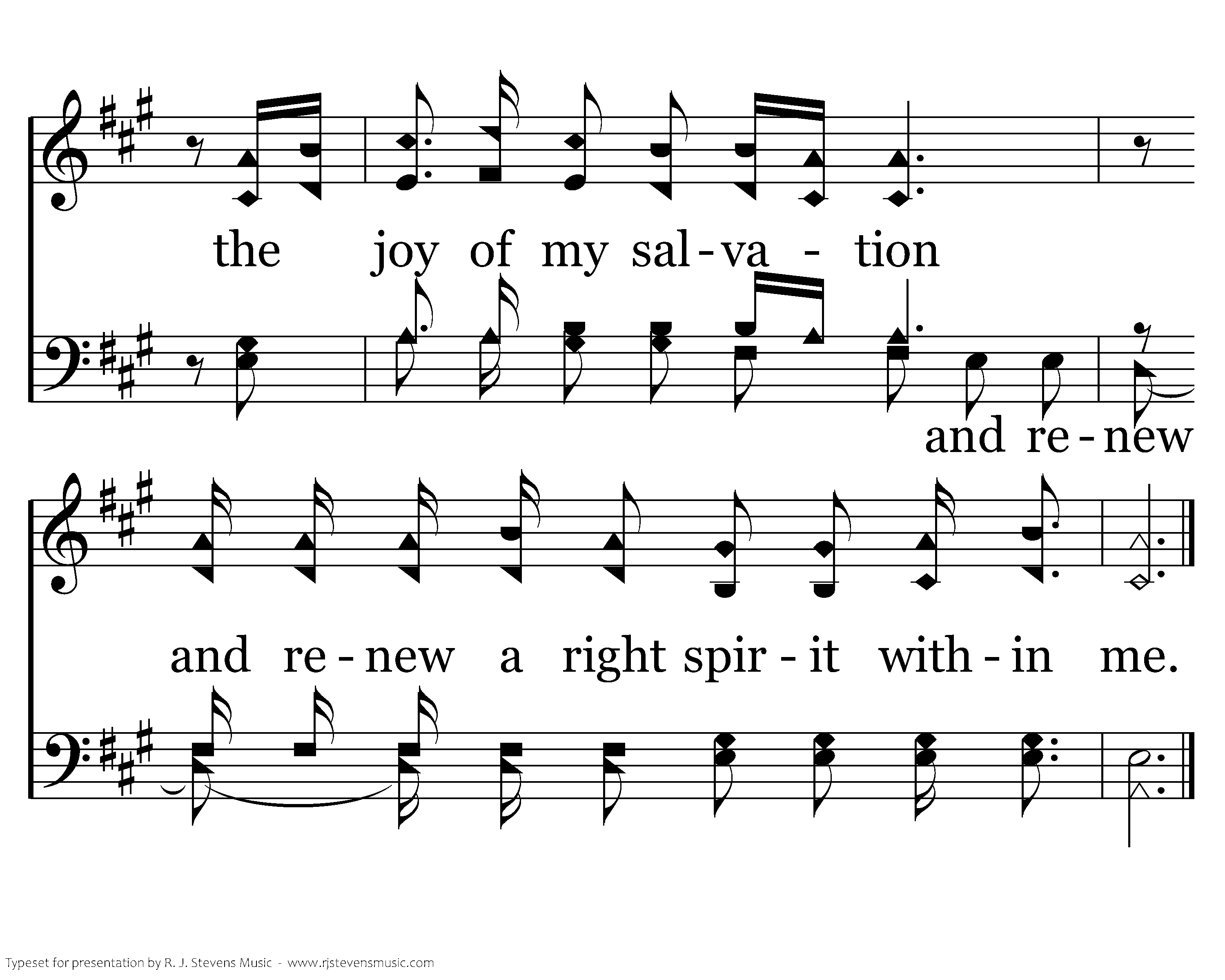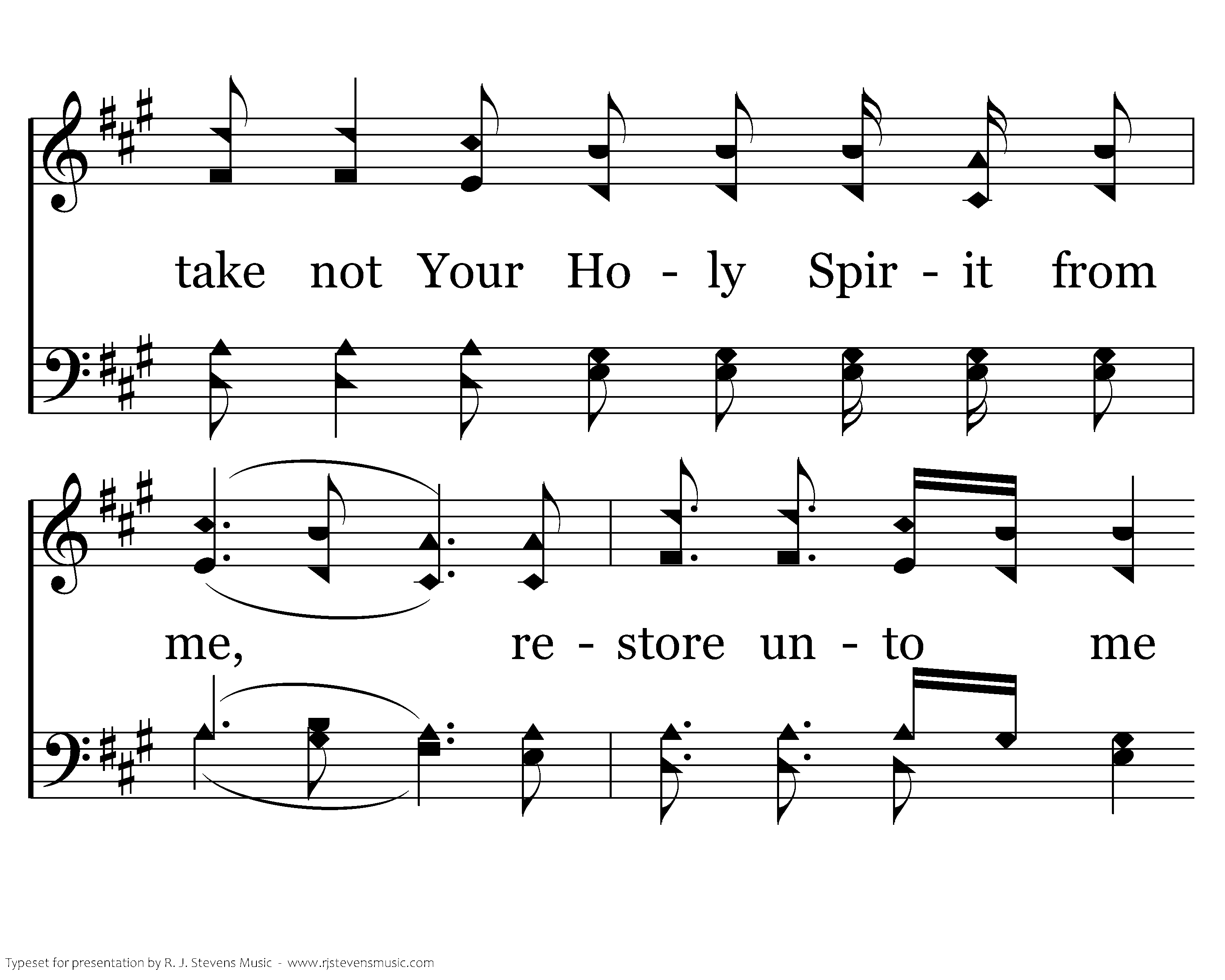 Create in me a clean heart, O God, and renew a right spirit within me. Cre-ate in me a clean heart, O God, and renew a right spirit within me. Cast me not away from Your presence, O, Lord, and take not Your holy spirit from me, restore unto me the joy of my salvation and renew a right spirit within me.