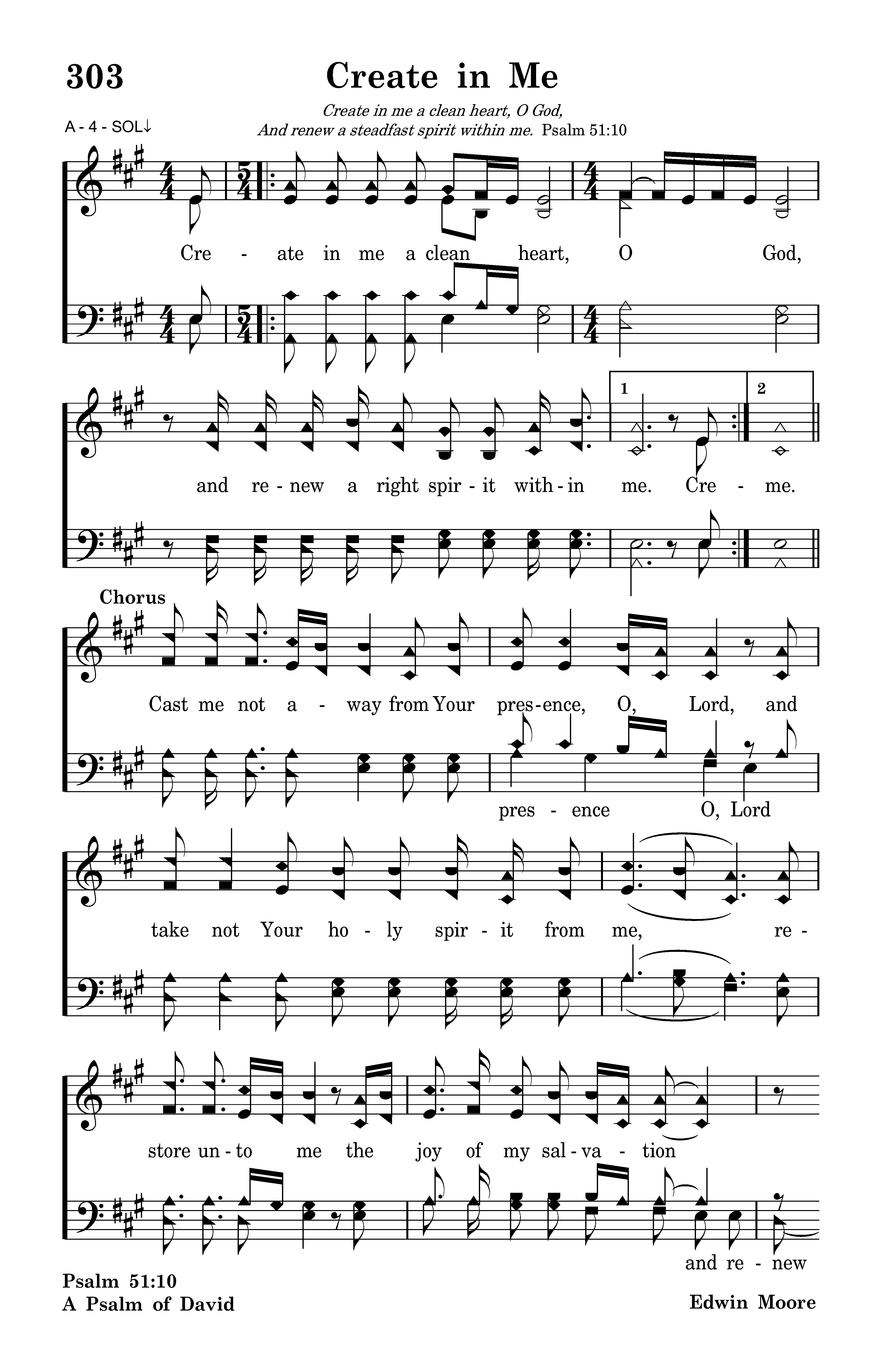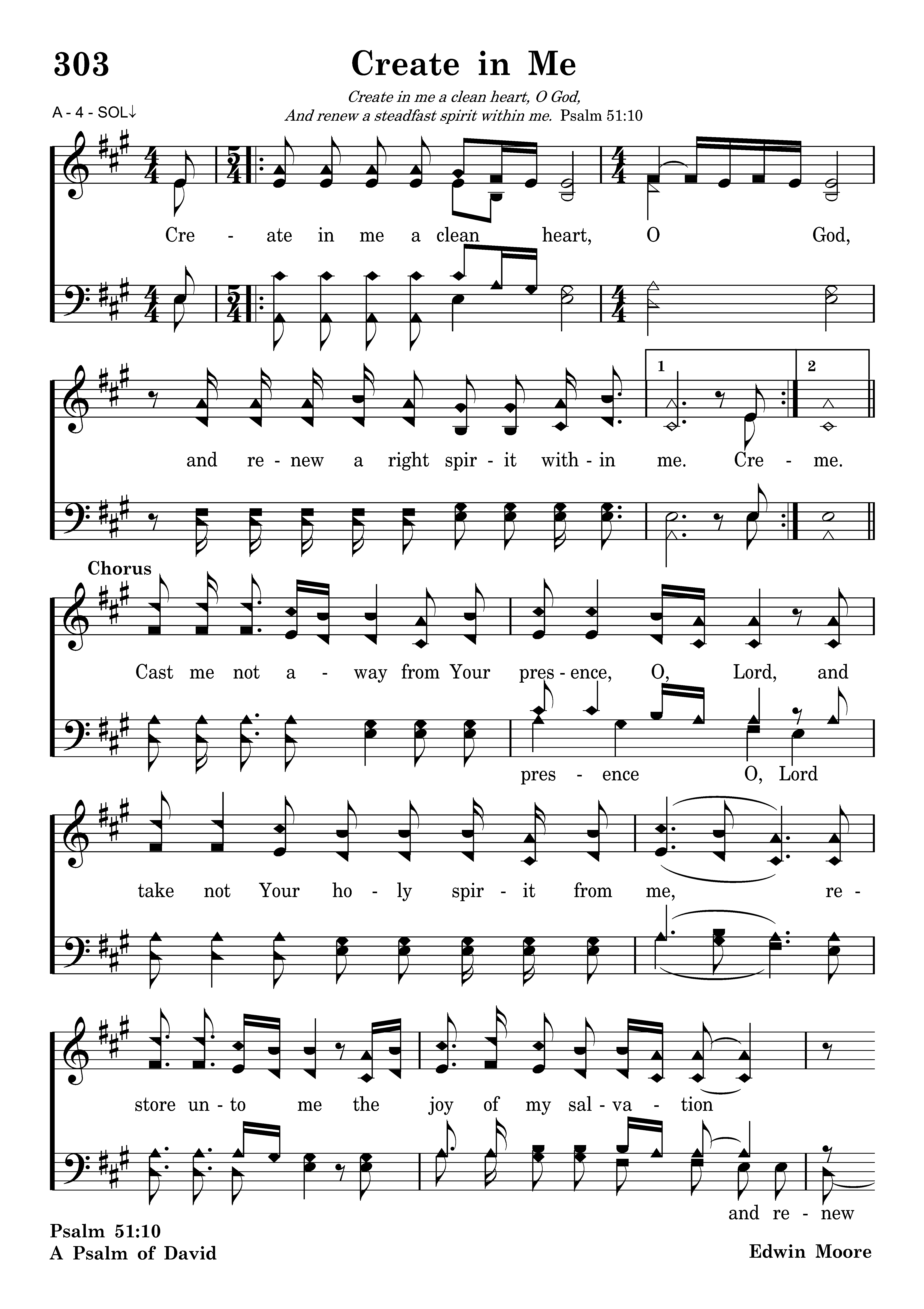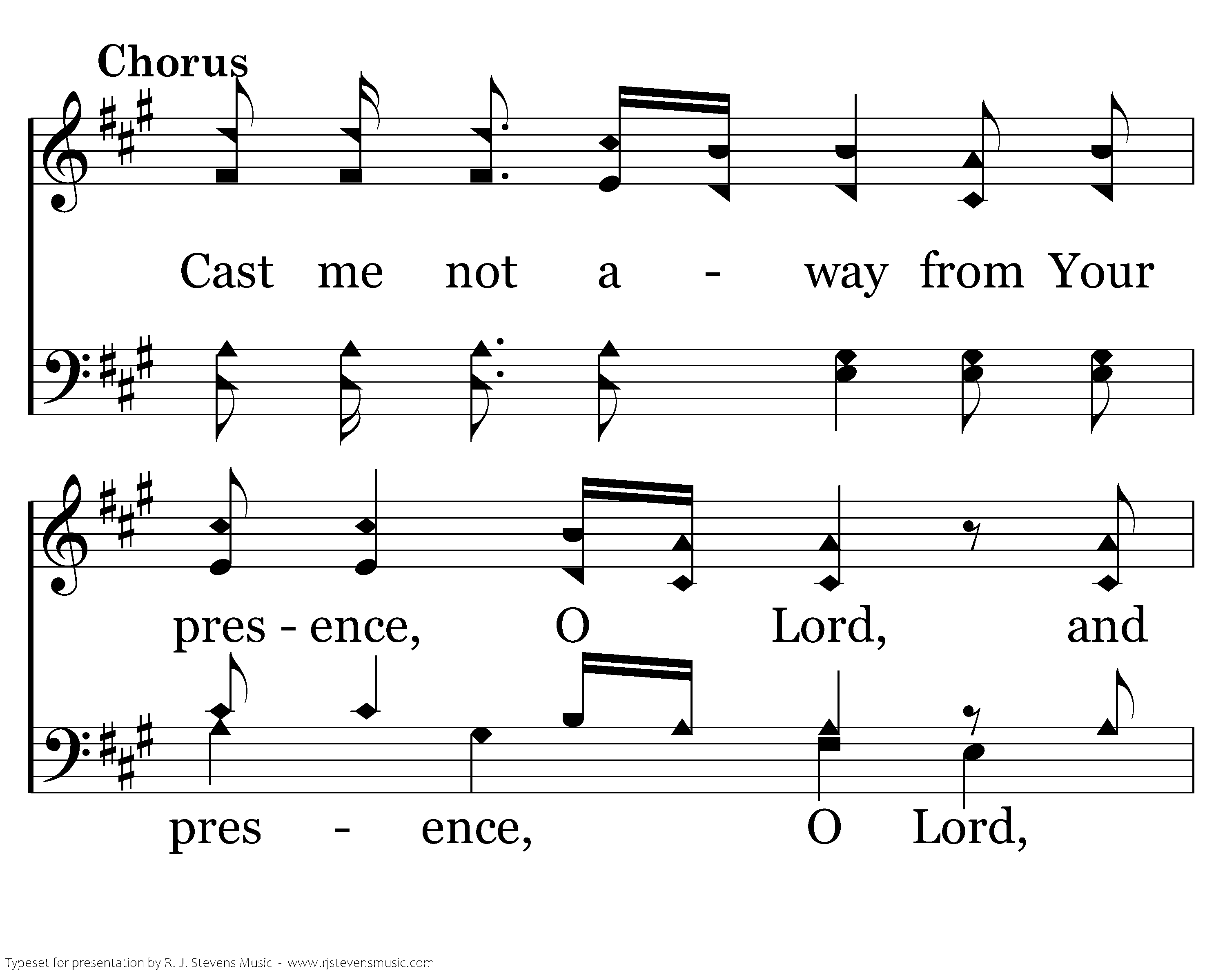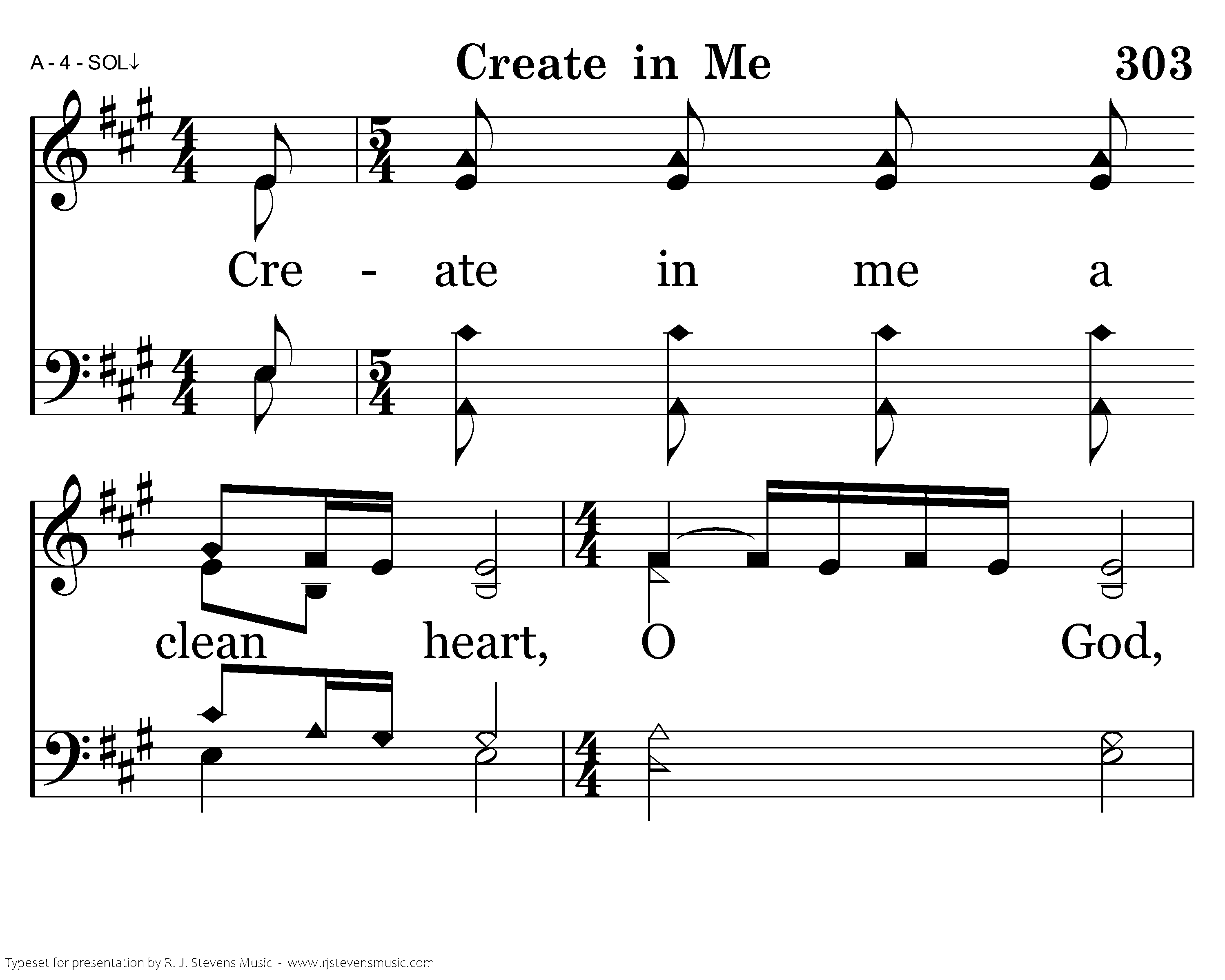 Create in me a clean heart, O God, and renew a right spirit within me. Cre-ate in me a clean heart, O God, and renew a right spirit within me. Cast me not away from Your presence, O, Lord, and take not Your holy spirit from me, restore unto me the joy of my salvation and renew a right spirit within me.