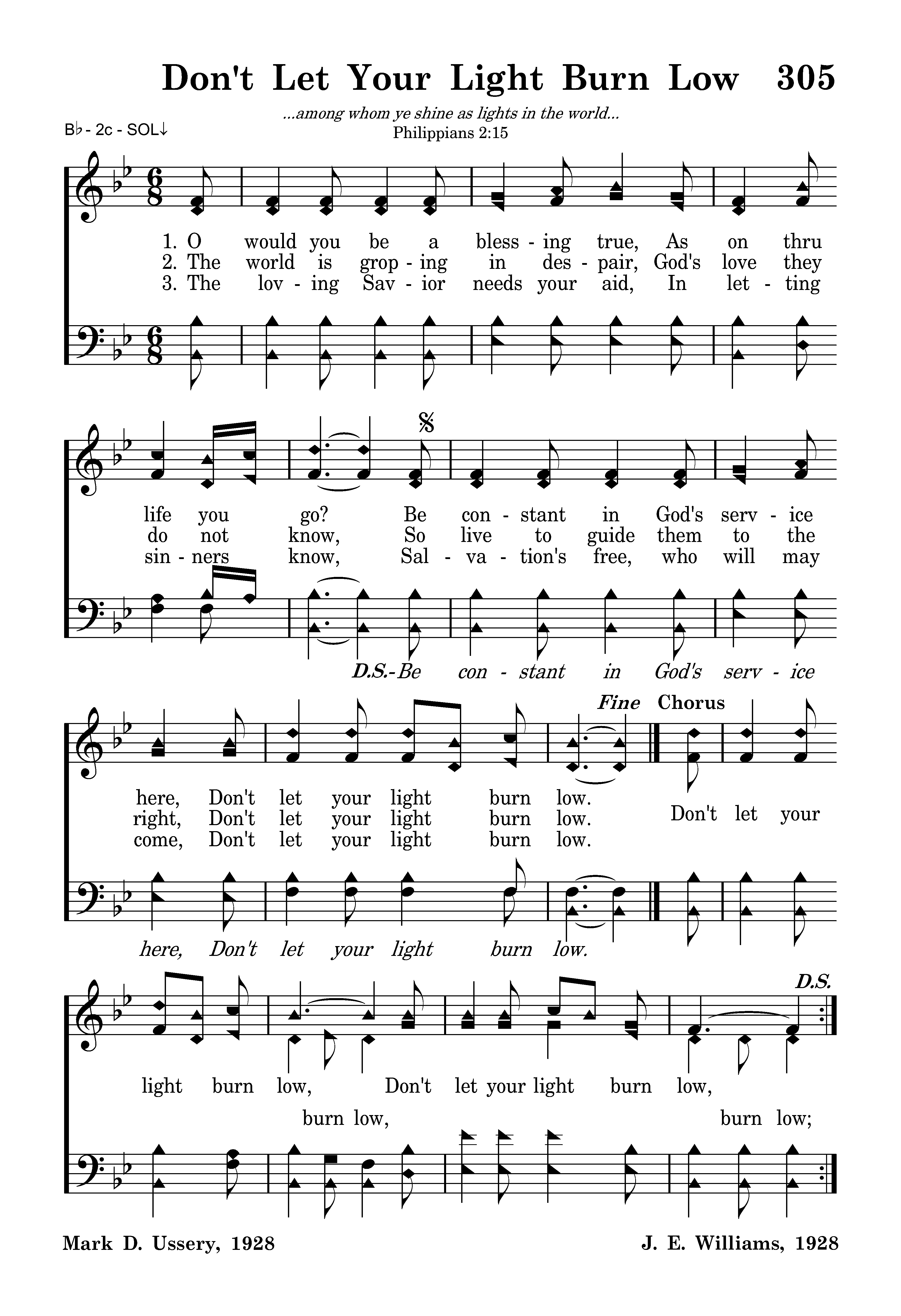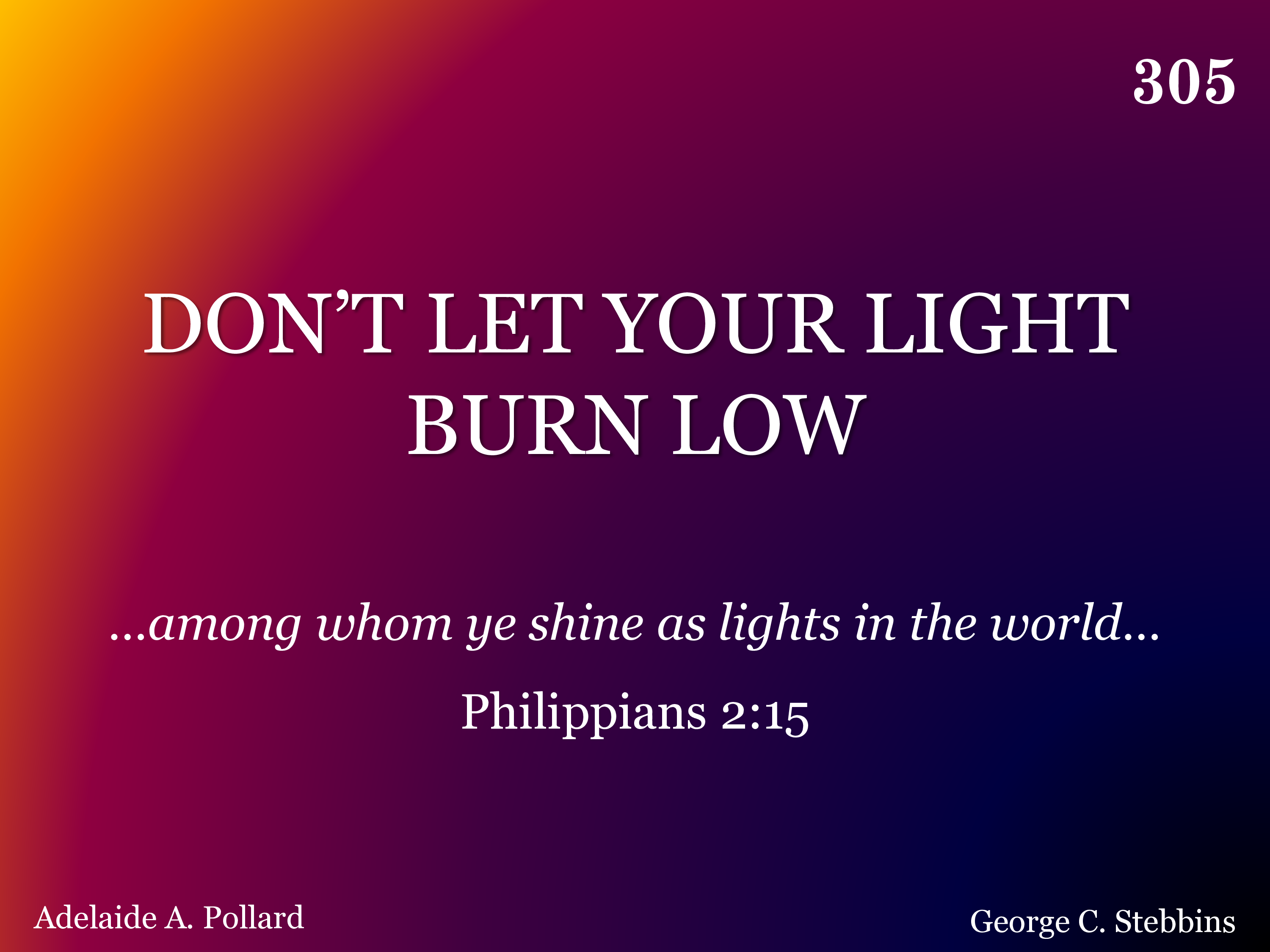 Don't let your light burn low, Don't let your light burn low, Be constant in God's service here, Don't let your light burn low.
