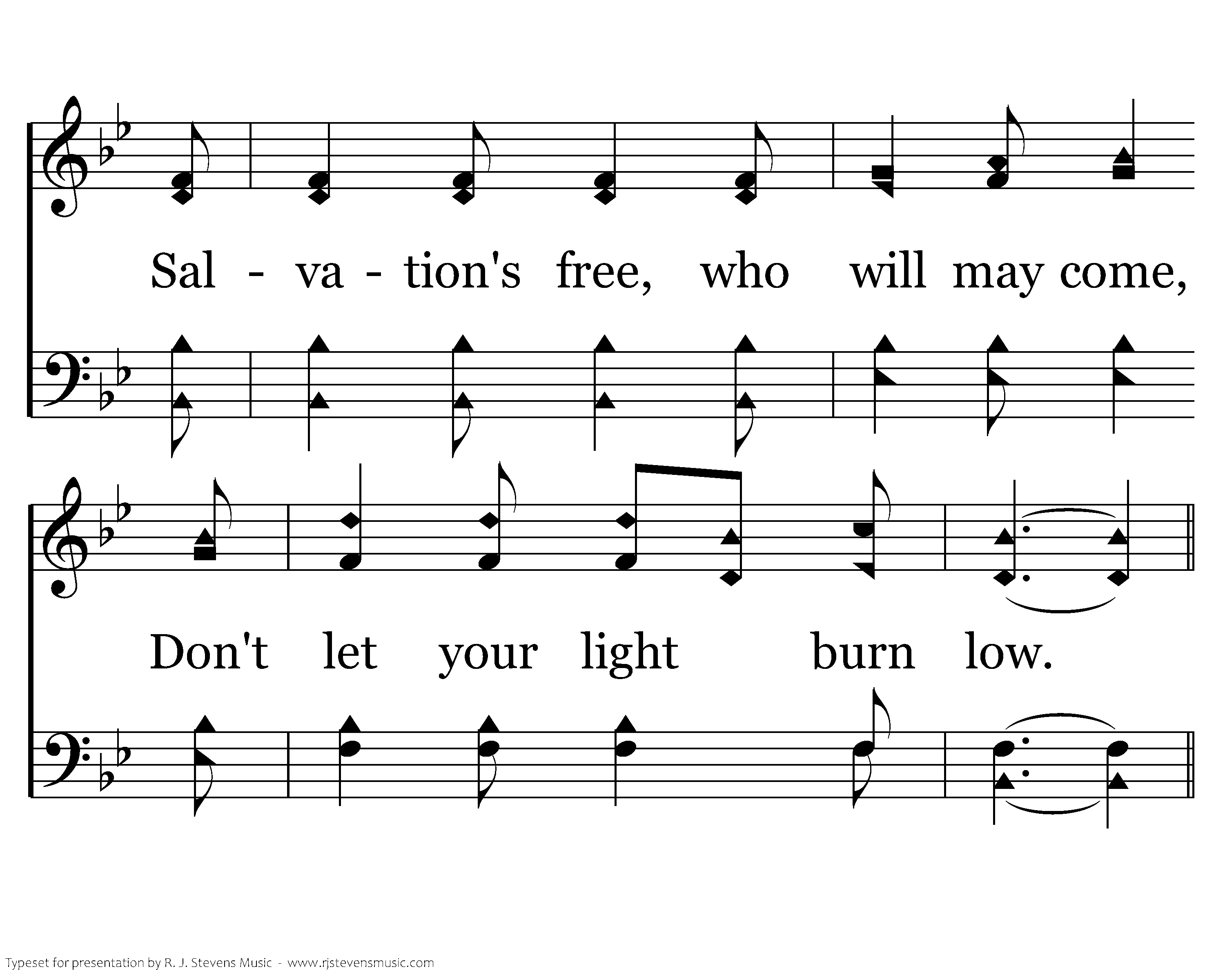 The loving Savior needs your aid, In letting sinners know, Salvation's free, who will may come, Don't let your light burn low.