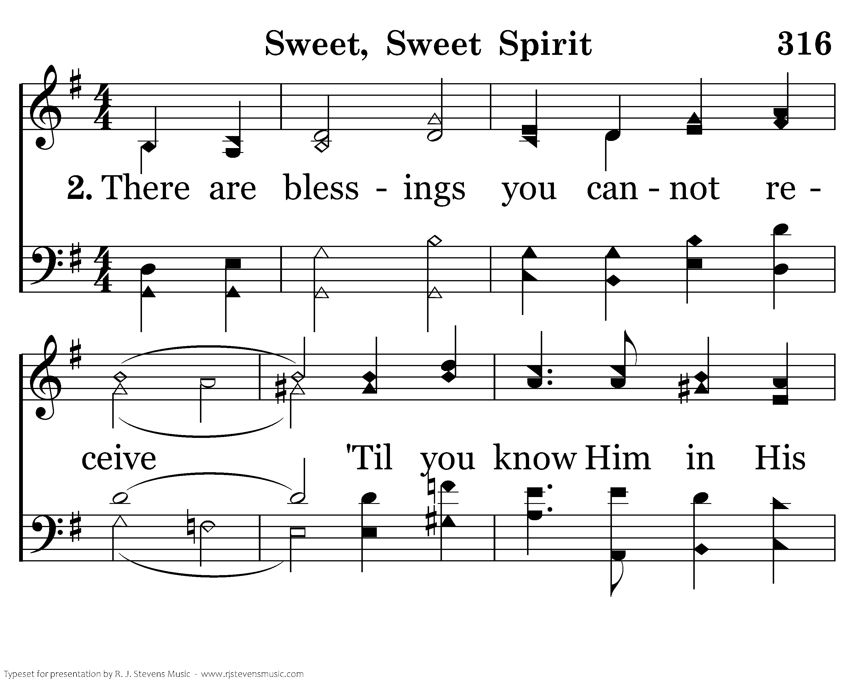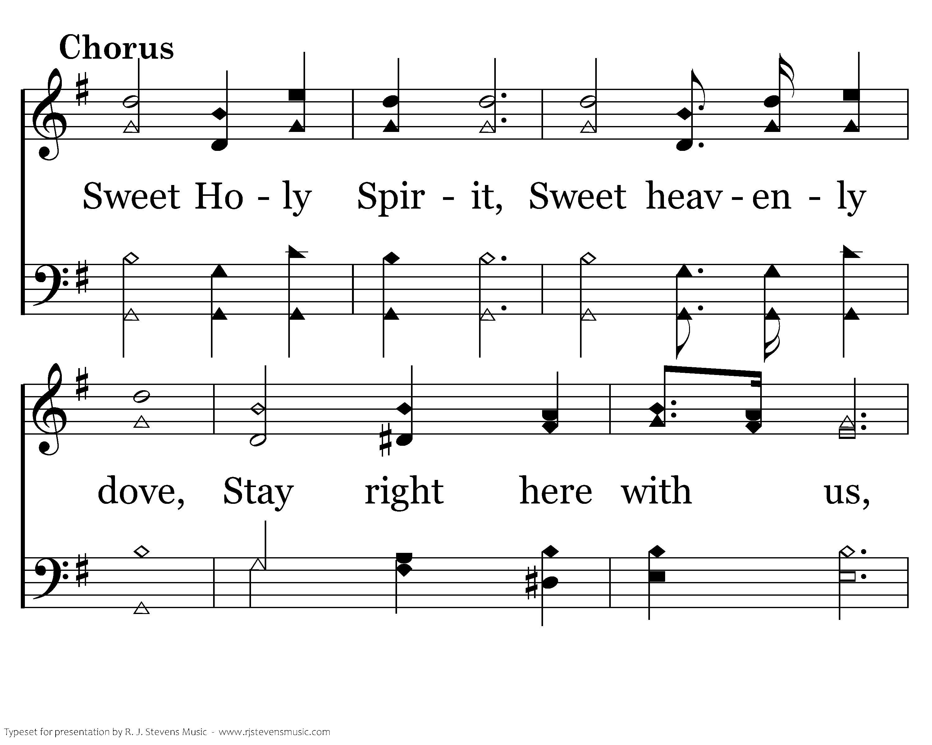 Sweet Holy Spirit, Sweet heavenly dove, Stay right here with us, Filling us with Your love; And for these blessings We lift our hearts in praise; Without a doubt we'll know that we have been revived, When we shall leave this place.