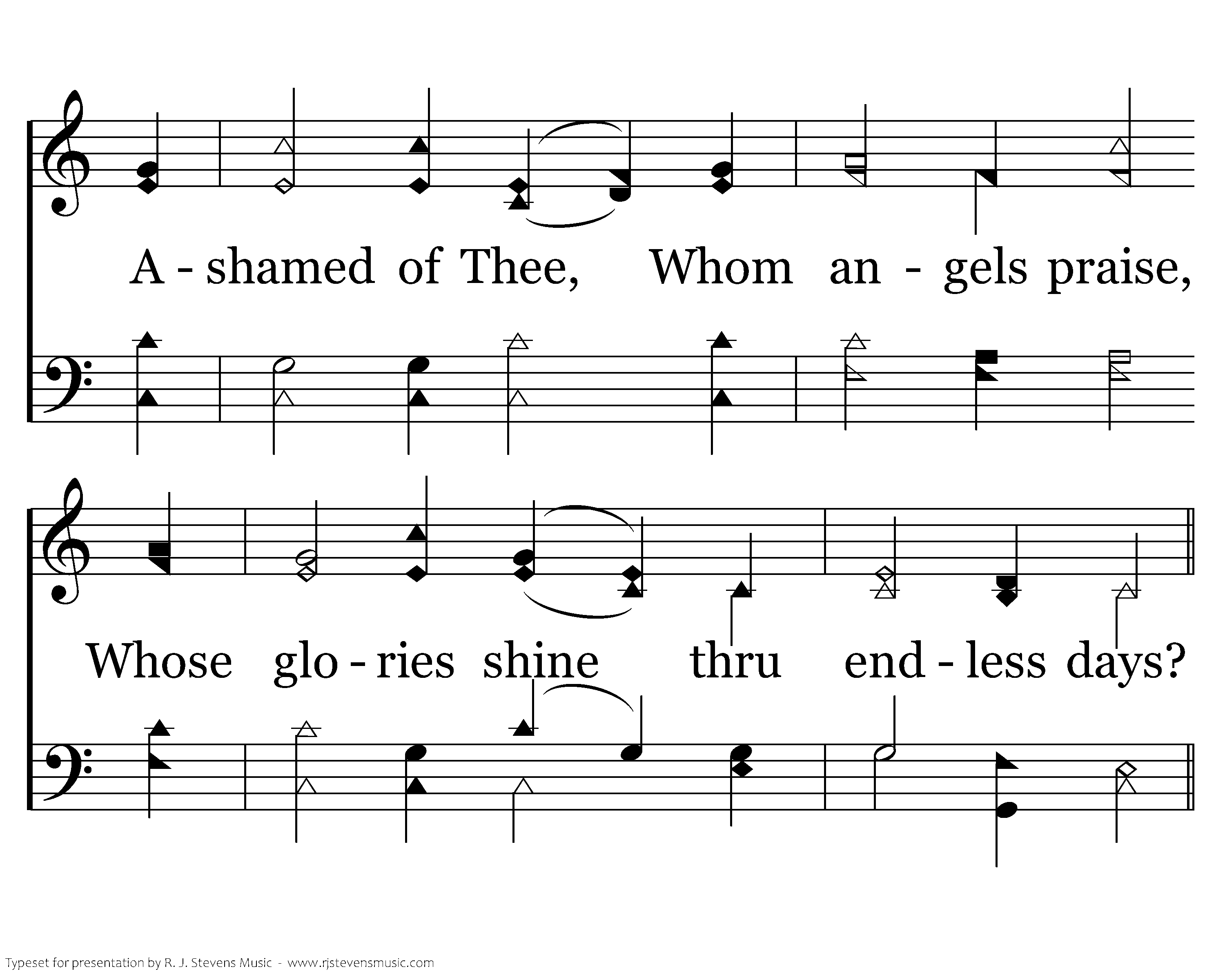 Jesus, and shall it ever be, A mortal man ashamed of Thee? Ashamed of Thee, Whom angels praise, Whose glories shine thru endless days?