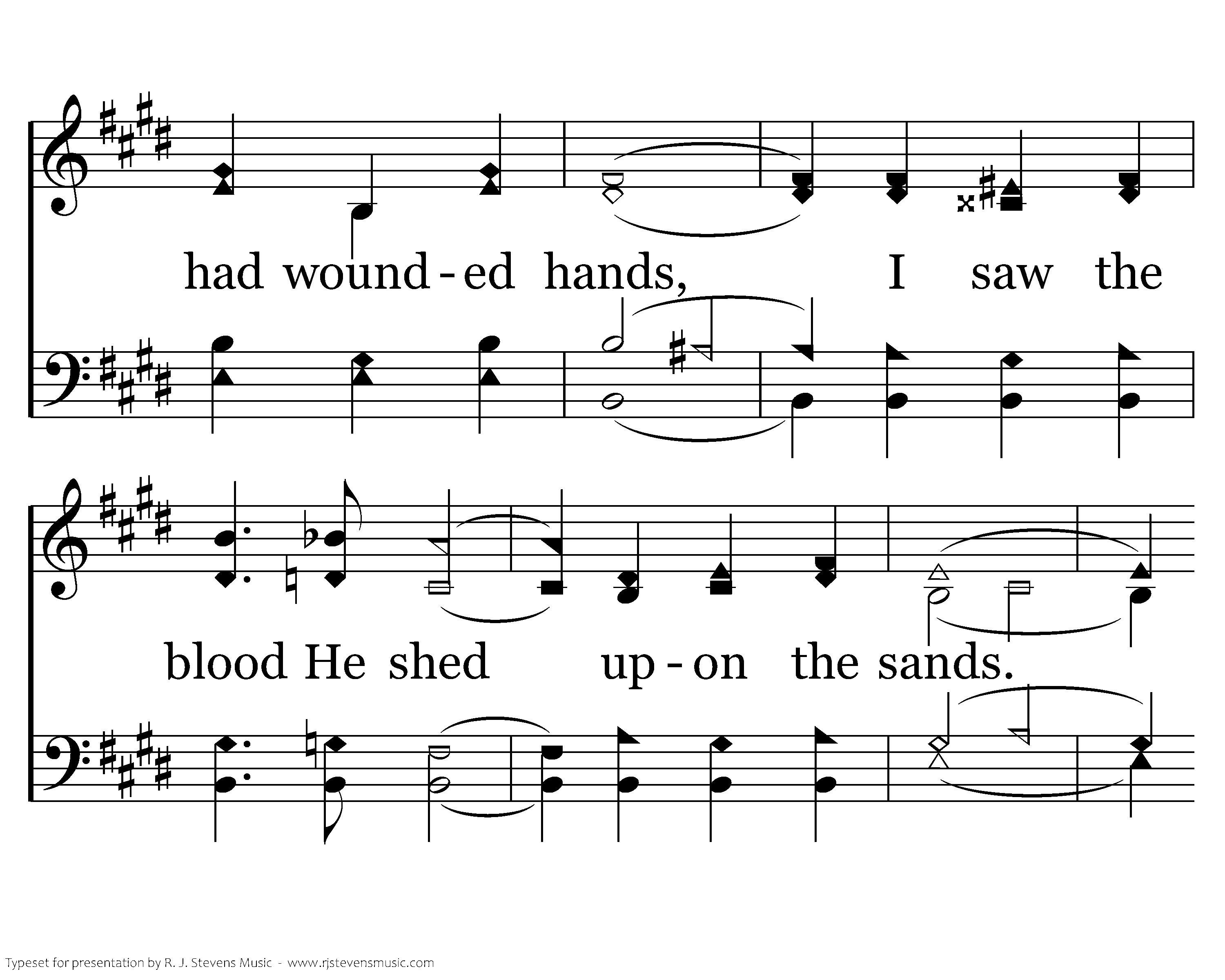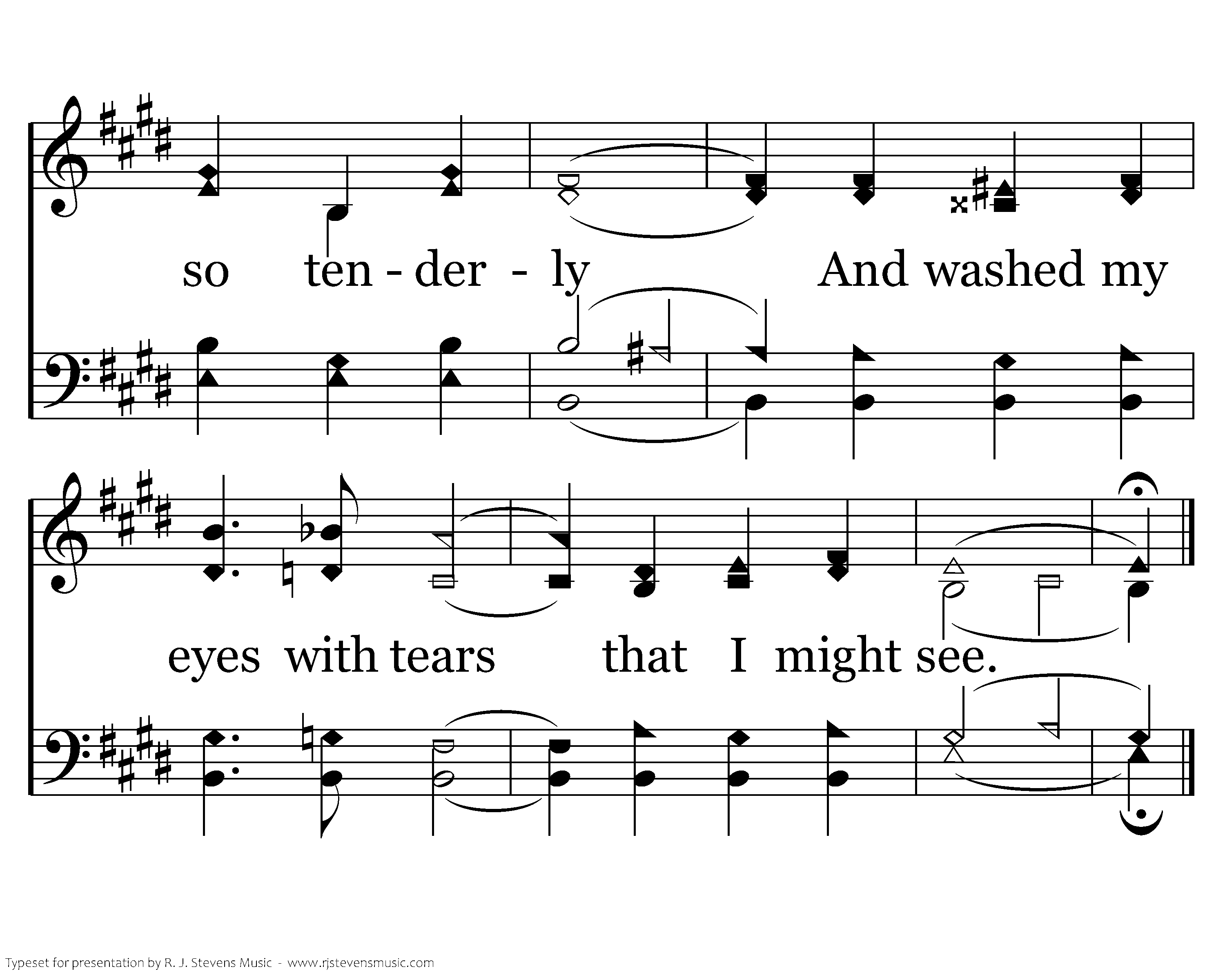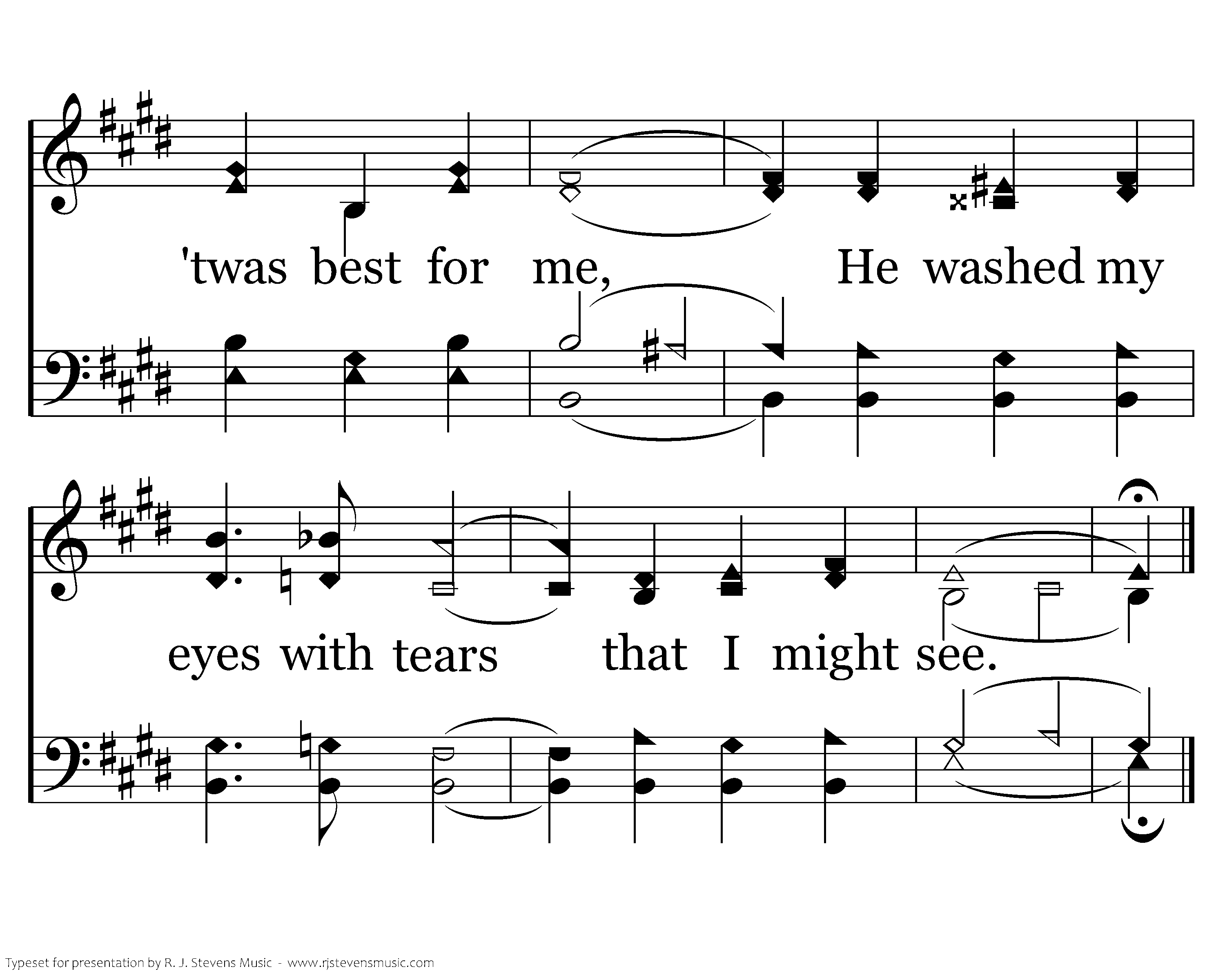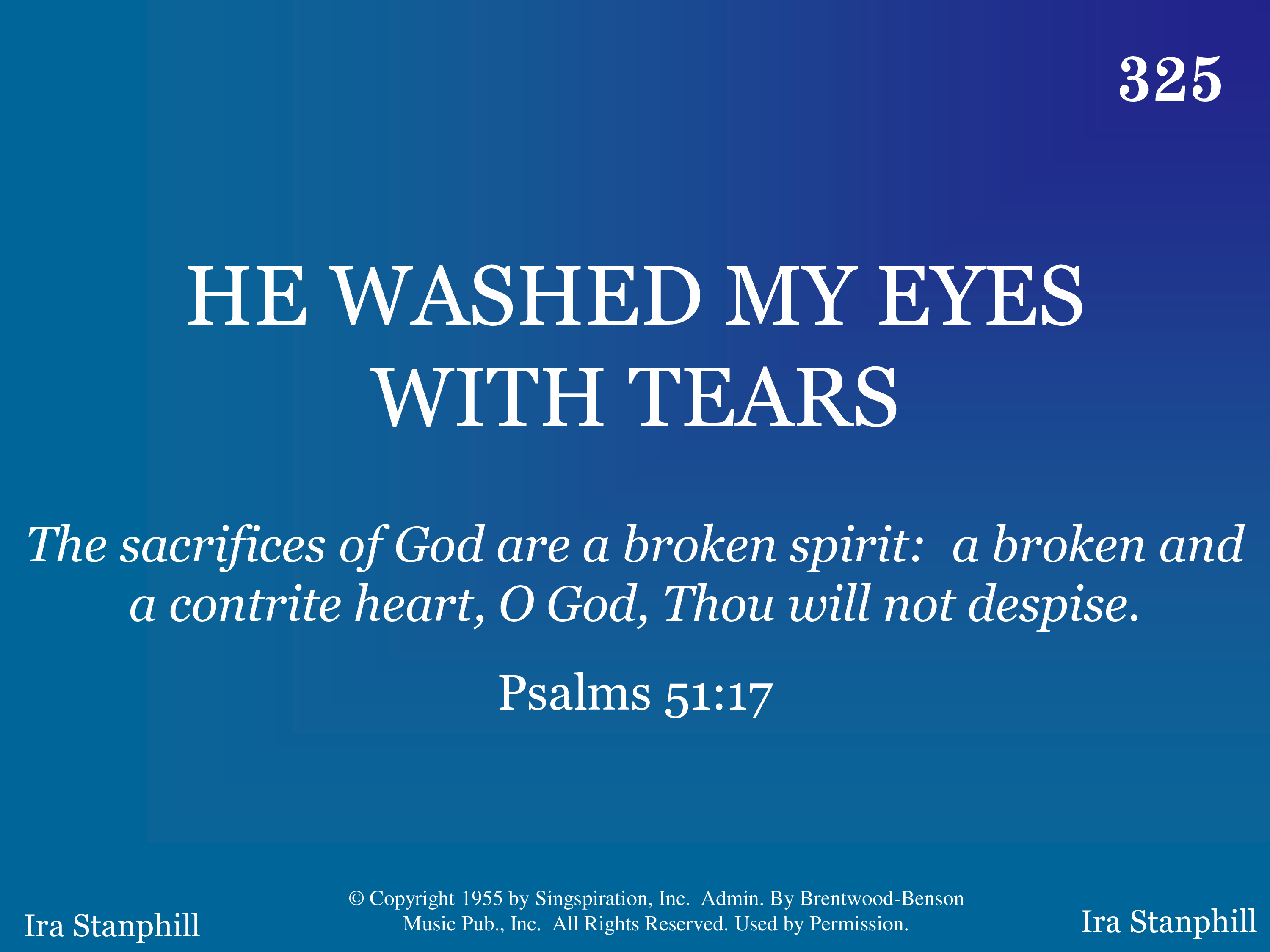 He washed my eyes with tears that I might see, The glory of Himself revealed to me; I did not know that He had wounded hands, I saw the blood He shed upon the sands.I saw the marks of shame and wept and cried, He was my substitute for me He died; And now I'm glad He came so tenderly And washed my eyes with tears that I might see.