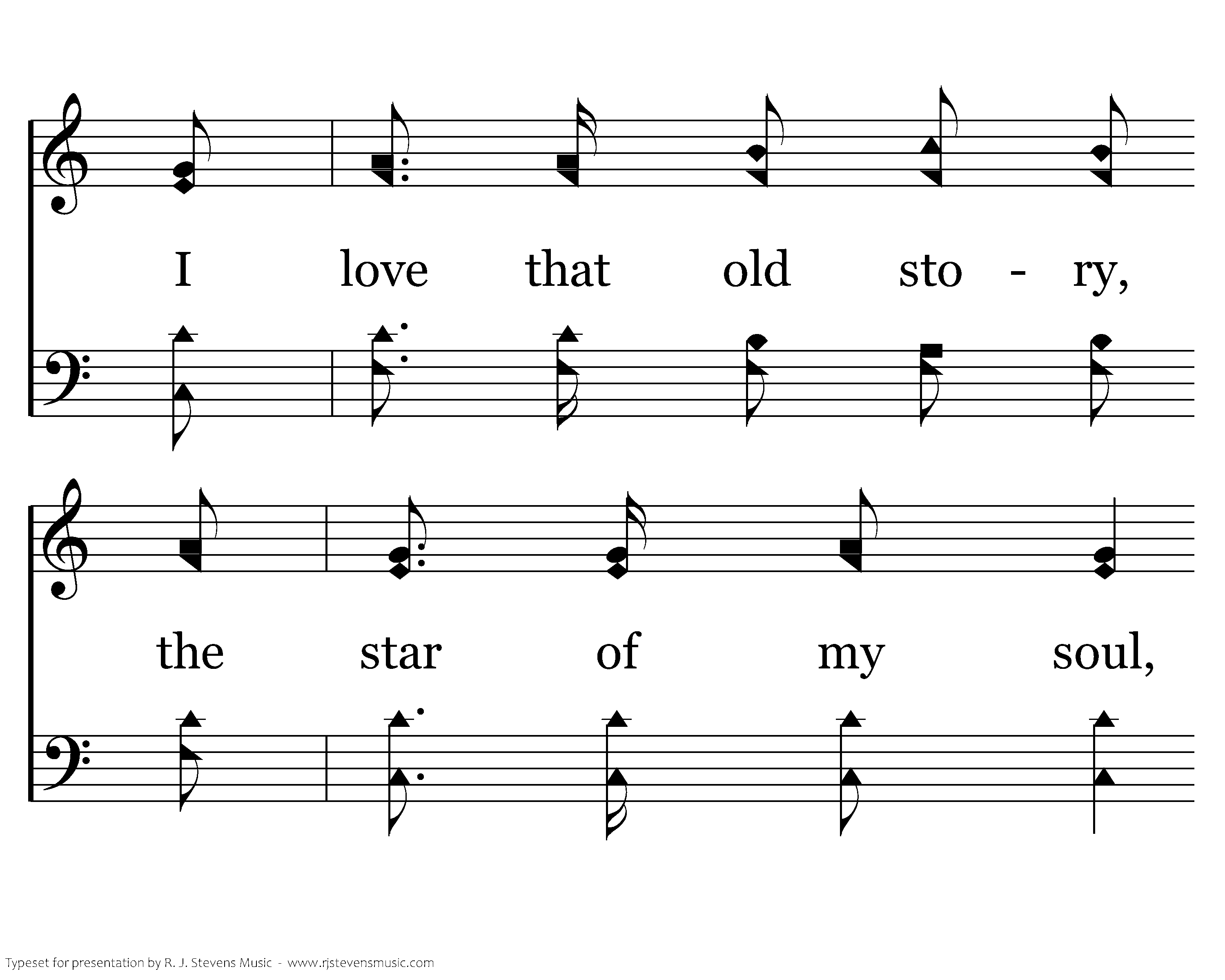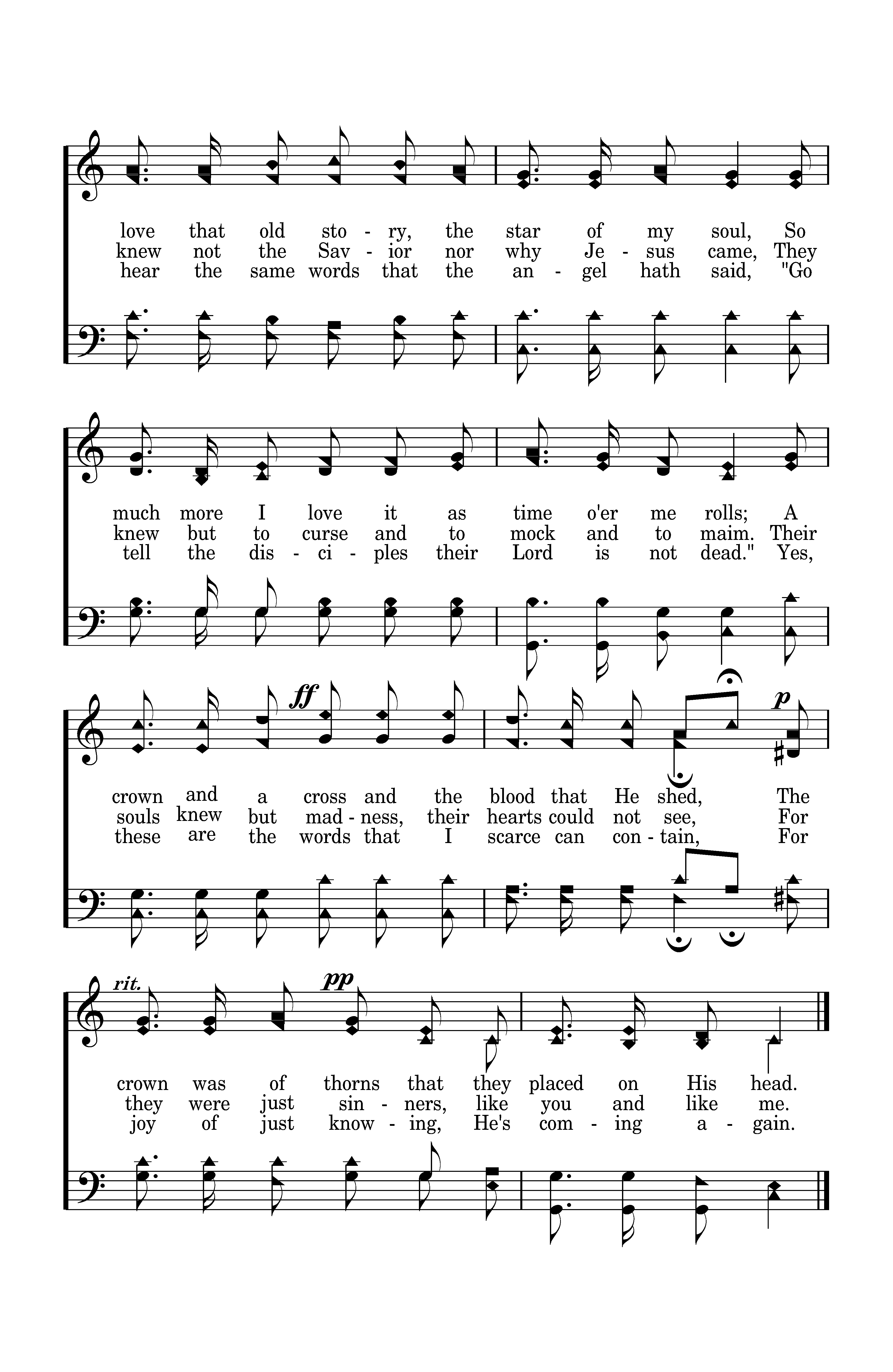 More vivid than ever, it flows with the years, So oft' has it quietened my heart of its fears, And sweet is the psalm in my soul that it lends, To sing of His greatness a song without end. I love that old story, the star of my soul, So much more I love it as time o'er me rolls; A crown and a cross and the blood that He shed, The crown was of thorns that they placed on His head.