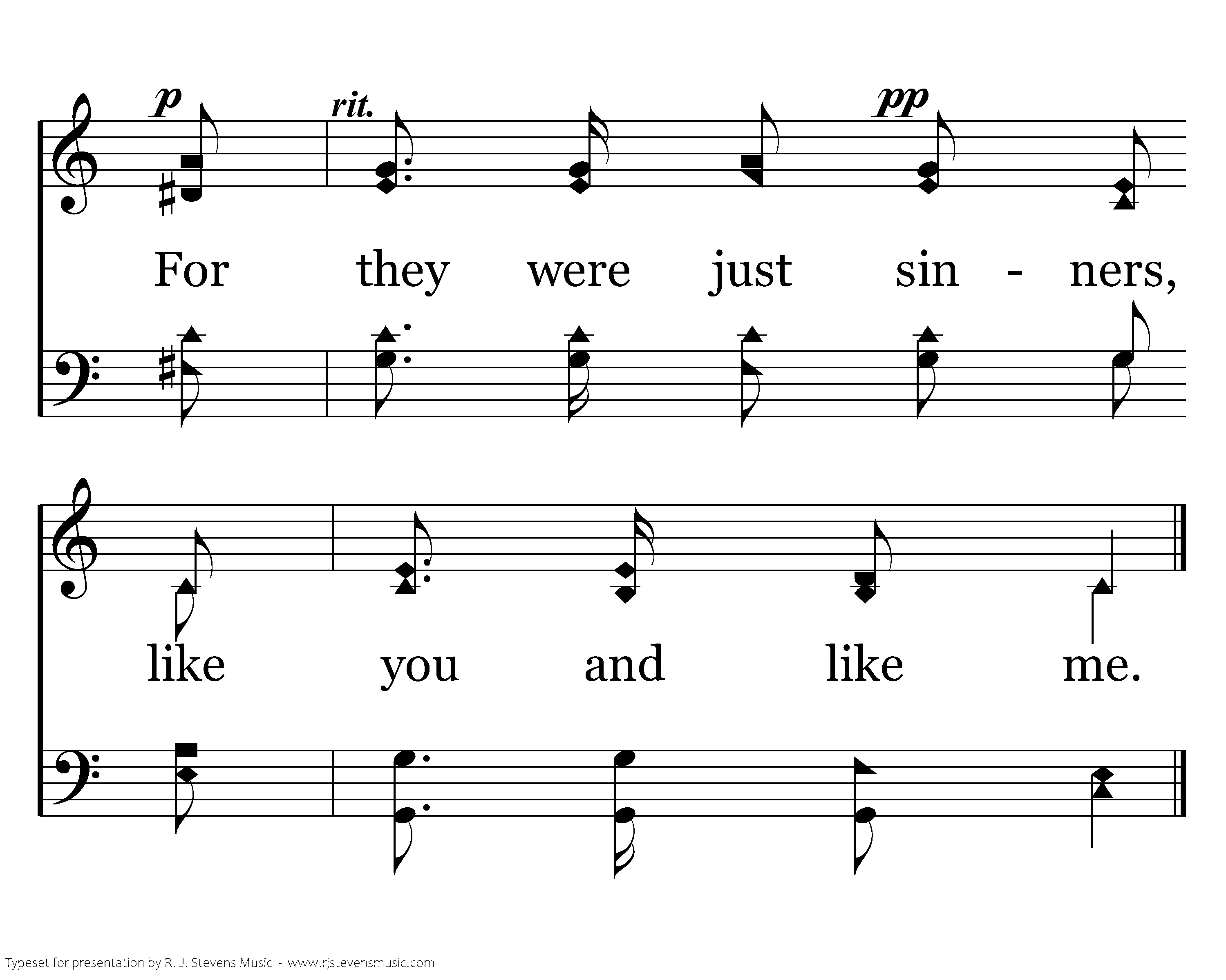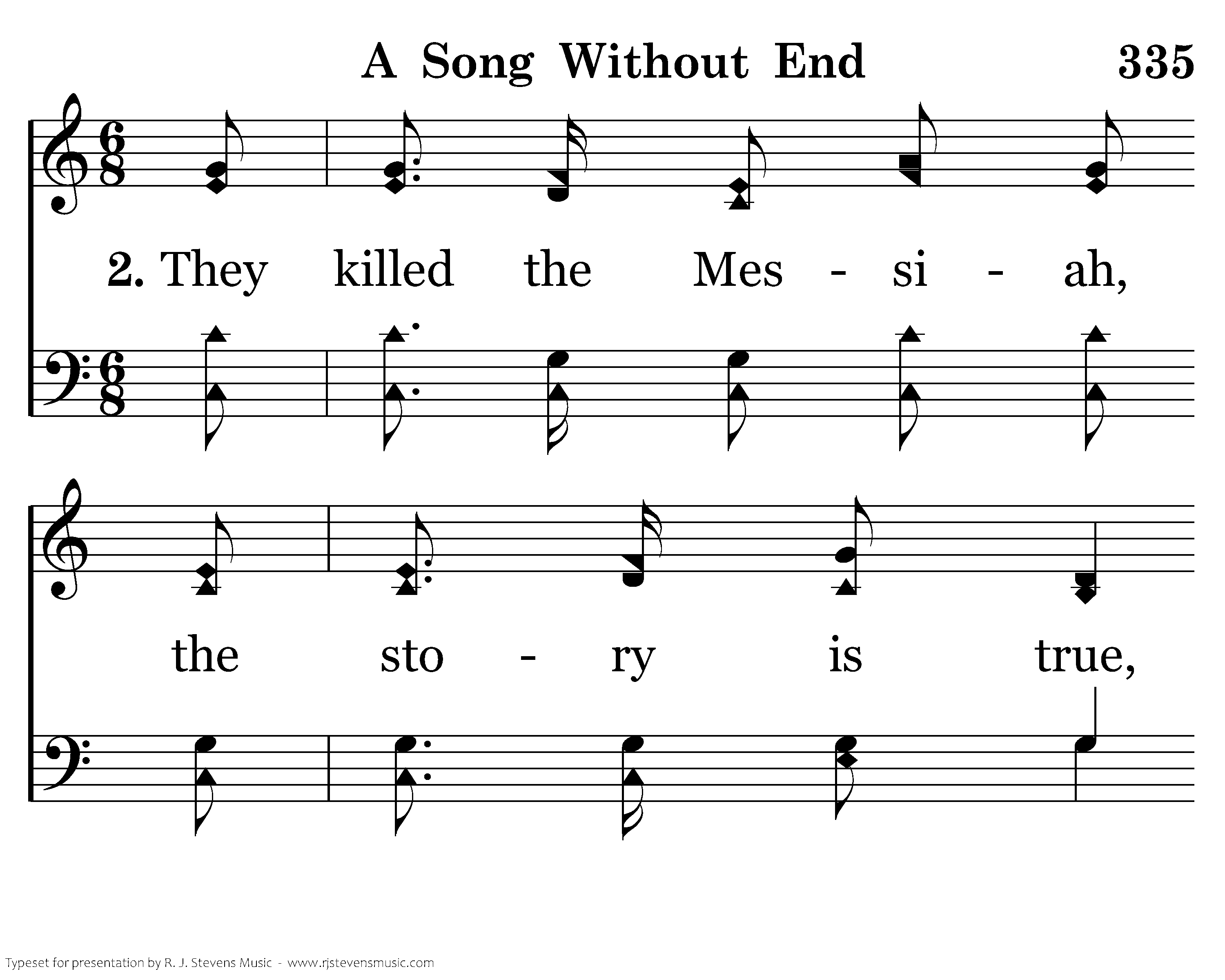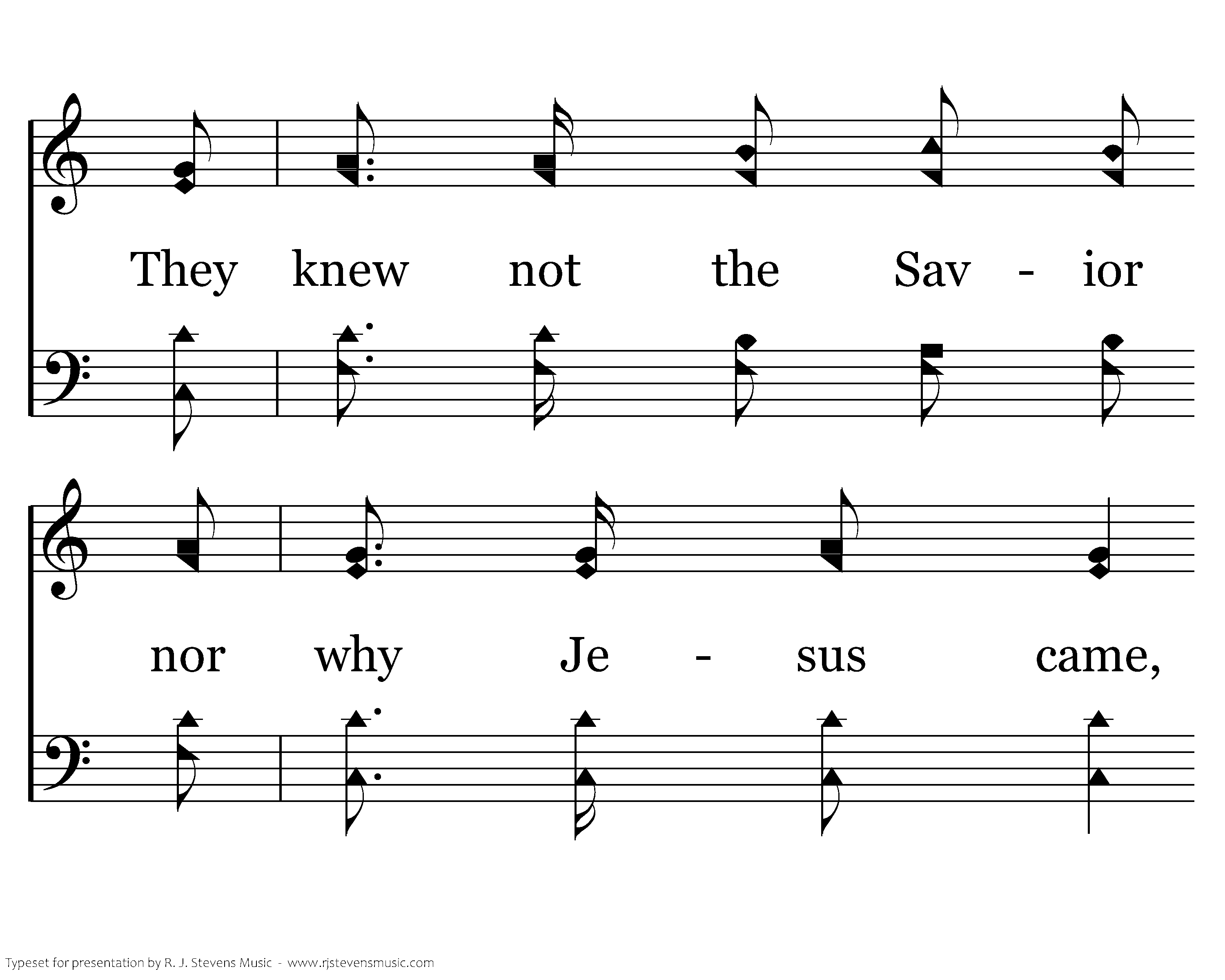 They killed the Messiah, the story is true, In anguish He suffered for me and for you. He called to the Father, forgive them I pray, Forgive them O Father, they know not Your way. They knew not the Savior nor why Jesus came, They knew but to curse and to mock and to maim. Their souls knew but madness, their hearts could not see, For they were just sinners, like you and like me.