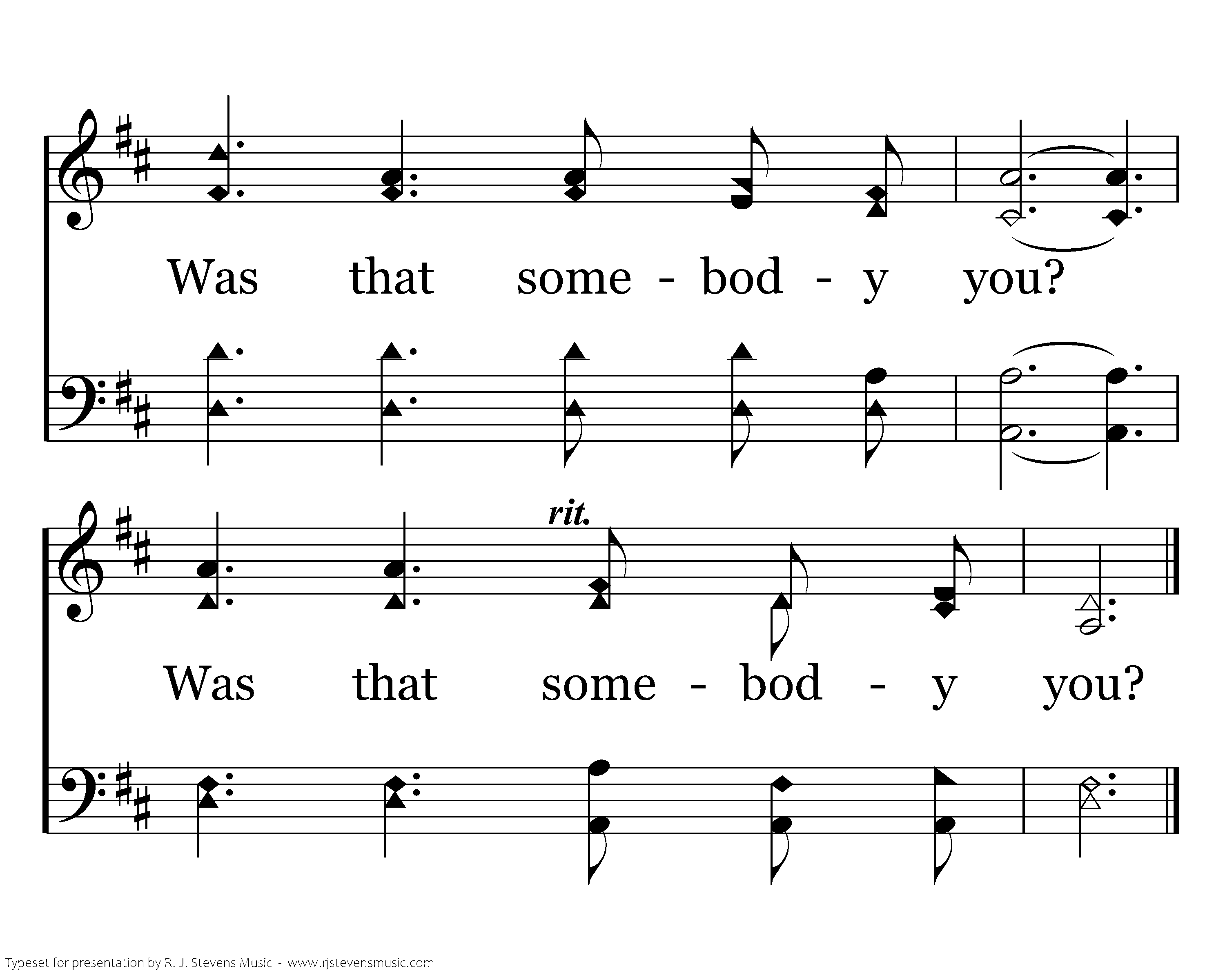 Somebody made a loving gift, Cheerfully tried a load to lift; Somebody told the love of Christ, Told how His will was sacrificed, Was that somebody you? Was that somebody you?